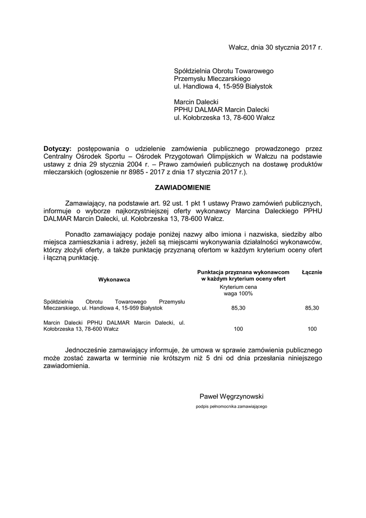 Wałcz, dnia 30 stycznia 2017 r. Spółdzielnia Obrotu Towarowego Przemysłu Mleczarskiego ul. Handlowa 4, 15-959 Białystok Marcin Dalecki PPHU DALMAR Marcin Dalecki ul. Kołobrzeska 13, 78-600 Wałcz Dotyczy: postępowania o udzielenie zamówienia publicznego prowadzonego przez Centralny Ośrodek Sportu – Ośrodek Przygotowań Olimpijskich w Wałczu na podstawie ustawy z dnia 29 stycznia 2004 r. – Prawo zamówień publicznych na dostawę produktów mleczarskich (ogłoszenie nr 8985 - 2017 z dnia 17 stycznia 2017 r.). ZAWIADOMIENIE Zamawiający, na podstawie art. 92 ust. 1 pkt 1 ustawy Prawo zamówień publicznych, informuje o wyborze najkorzystniejszej oferty wykonawcy Marcina Daleckiego PPHU DALMAR Marcin Dalecki, ul. Kołobrzeska 13, 78-600 Wałcz. Ponadto zamawiający podaje poniżej nazwy albo imiona i nazwiska, siedziby albo miejsca zamieszkania i adresy, jeżeli są miejscami wykonywania działalności wykonawców, którzy złożyli oferty, a także punktację przyznaną ofertom w każdym kryterium oceny ofert i łączną punktację. Wykonawca Punktacja przyznana wykonawcom w każdym kryterium oceny ofert Łącznie Kryterium cena waga 100% Spółdzielnia Obrotu Towarowego Przemysłu Mleczarskiego, ul. Handlowa 4, 15-959 Białystok 85,30 85,30 Marcin Dalecki PPHU DALMAR Marcin Dalecki, ul. Kołobrzeska 13, 78-600 Wałcz 100 100 Jednocześnie zamawiający informuje, że umowa w sprawie zamówienia publicznego może zostać zawarta w terminie nie krótszym niż 5 dni od dnia przesłania niniejszego zawiadomienia. Paweł Węgrzynowski podpis pełnomocnika zamawiającego
