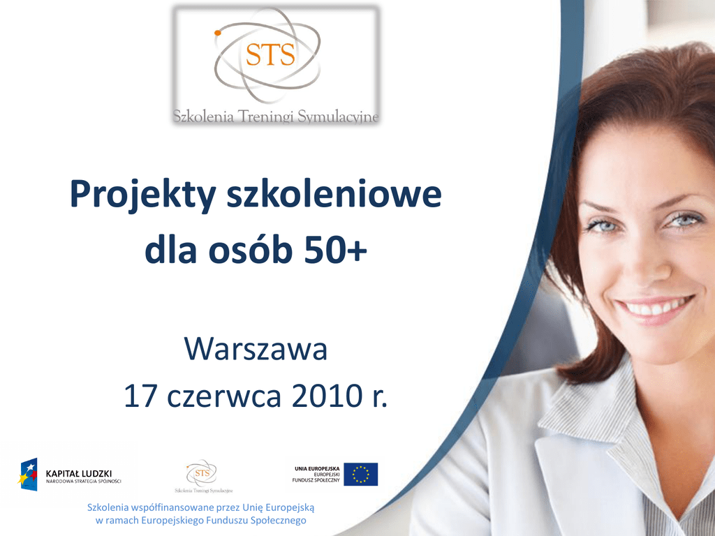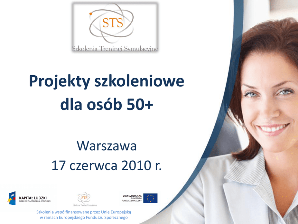 Projekty szkoleniowe dla osób 50+ Warszawa 17 czerwca 2010 r. Szkolenia współfinansowane przez Unię Europejską w ramach Europejskiego Funduszu Społecznego Agenda prezentacji Projekt „Zawody na trudne czasy” 1. Możliwości wsparcia 2. Zasady uczestnictwa Projekt „Dobrym szefem byd…” 1. Zakres merytoryczny 2. Zasady uczestnictwa Szkolenia współfinansowane przez Unię Europejską w ramach Europejskiego Funduszu Społecznego Przygotowanie do pracy w zawodach: 1. Przedstawiciel handlowy 2. Telemarketer 3. Pracownik call-center 4. Pracownik obsługi klienta 5. Windykacja telefoniczna Szkolenia współfinansowane przez Unię Europejską w ramach Europejskiego Funduszu Społecznego Możliwości wsparcia w projekcie 1. Szkolenia 2. Indywidualne konsultacje 3. Oferty pracy 4. Przygotowanie do rozmowy 5. Prawo jazdy dla wybranych uczestników 6. Teczka referencyjna Szkolenia współfinansowane przez Unię Europejską w ramach Europejskiego Funduszu Społecznego Zasady uczestnictwa Udział w projekcie jest całkowicie bezpłatny Pierwszeostwo przyjęcia dla osób powyżej 45 lat W projekcie mogą wziąd udział osoby które: • Mieszkają na terenie województwa mazowieckiego • Są bezrobotne lub nieaktywne zawodowo • Mają średnie lub wyższe wykształcenie • Są w wieku od 18 do 65 lat Szkolenia współfinansowane przez Unię Europejską w ramach Europejskiego Funduszu Społecznego Dodatkowe informacje www.zostanhandlowcem.pl tel. 22 428 58 83 Szkolenia współfinansowane przez Unię Europejską w ramach Europejskiego Funduszu Społecznego Zakres merytoryczny 1. Zarządzanie zespołem i motywowanie podwładnych (2 dni) 2. Budowanie zespołu i prowadzenie spotkao (2 dni) 3. Wspieranie profesjonalnego rozwoju pracownika (2 dni) 4. Komunikacja i współpraca wewnątrz firmy – negocjacje wewnętrzne (2 dni) 5. Programy komputerowe dla menedżerów (2 dni) 6. Znajomośd prawa pracy (1 dzieo) 7. Umiejętności sprzedażowe (1 dzieo) 8. Negocjacje handlowe (1 dzieo) Szkolenia współfinansowane przez Unię Europejską w ramach Europejskiego Funduszu Społecznego Zasady uczestnictwa • Pierwszeostwo przyjęd mają osoby po 45 roku życia • W projekcie mogą wziąd udział osoby: • Mieszkające na terenie województwa mazowieckiego • Nie posiadające wyższego wykształcenia • Pracujące (z wyłączeniem samozatrudnienia) • Chcące z własnej inicjatywy wziąd udział w projekcie poza czasem pracy • Udział w projekcie jest całkowicie bezpłatny • Średnio 2 szkolenia 2-dniowe w miesiącu Szkolenia współfinansowane przez Unię Europejską w ramach Europejskiego Funduszu Społecznego Dodatkowe informacje www.dobryszef.eu tel. 22 428 58 83 Szkolenia współfinansowane przez Unię Europejską w ramach Europejskiego Funduszu Społecznego Szkolenia są współfinansowane przez Unię Europejską w ramach Europejskiego Funduszu Społecznego Szkolenia współfinansowane przez Unię Europejską w ramach Europejskiego Funduszu Społecznego