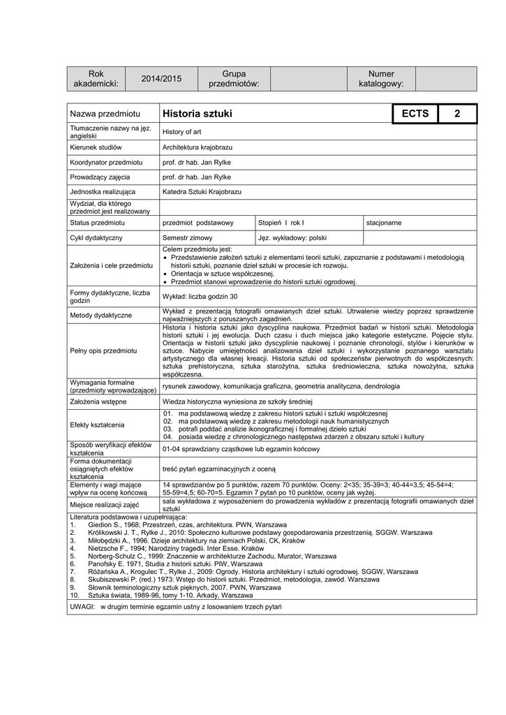 Rok akademicki: 2014/2015 Grupa przedmiotów: Nazwa przedmiotu Historia sztuki Tłumaczenie nazwy na jęz. angielski History of art Kierunek studiów Architektura krajobrazu Koordynator przedmiotu prof. dr hab. Jan Rylke Prowadzący zajęcia prof. dr hab. Jan Rylke Jednostka realizująca Katedra Sztuki Krajobrazu Numer katalogowy: ECTS 2 Wydział, dla którego przedmiot jest realizowany Status przedmiotu przedmiot podstawowy Stopień I rok I Cykl dydaktyczny Semestr zimowy Jęz. wykładowy: polski Założenia i cele przedmiotu Celem przedmiotu jest: Przedstawienie założeń sztuki z elementami teorii sztuki, zapoznanie z podstawami i metodologią historii sztuki, poznanie dzieł sztuki w procesie ich rozwoju. Orientacja w sztuce współczesnej. Przedmiot stanowi wprowadzenie do historii sztuki ogrodowej. Formy dydaktyczne, liczba godzin Wykład: liczba godzin 30 Metody dydaktyczne Pełny opis przedmiotu stacjonarne Wykład z prezentacją fotografii omawianych dzieł sztuki. Utrwalenie wiedzy poprzez sprawdzenie najważniejszych z poruszanych zagadnień. Historia i historia sztuki jako dyscyplina naukowa. Przedmiot badań w historii sztuki. Metodologia historii sztuki i jej ewolucja. Duch czasu i duch miejsca jako kategorie estetyczne. Pojęcie stylu. Orientacja w historii sztuki jako dyscyplinie naukowej i poznanie chronologii, stylów i kierunków w sztuce. Nabycie umiejętności analizowania dzieł sztuki i wykorzystanie poznanego warsztatu artystycznego dla własnej kreacji. Historia sztuki od społeczeństw pierwotnych do współczesnych: sztuka prehistoryczna, sztuka starożytna, sztuka średniowieczna, sztuka nowożytna, sztuka współczesna. Wymagania formalne rysunek zawodowy, komunikacja graficzna, geometria analityczna, dendrologia (przedmioty wprowadzające) Założenia wstępne Wiedza historyczna wyniesiona ze szkoły średniej Efekty kształcenia 01. 02. 03. 04. Sposób weryfikacji efektów kształcenia Forma dokumentacji osiągniętych efektów kształcenia Elementy i wagi mające wpływ na ocenę końcową ma podstawową wiedzę z zakresu historii sztuki i sztuki współczesnej ma podstawową wiedzę z zakresu metodologii nauk humanistycznych potrafi poddać analizie ikonograficznej i formalnej dzieło sztuki posiada wiedzę z chronologicznego następstwa zdarzeń z obszaru sztuki i kultury 01-04 sprawdziany cząstkowe lub egzamin końcowy treść pytań egzaminacyjnych z oceną 14 sprawdzianów po 5 punktów, razem 70 punktów. Oceny: 2<35; 35-39=3; 40-44=3,5; 45-54=4; 55-59=4,5; 60-70=5. Egzamin 7 pytań po 10 punktów, oceny jak wyżej. sala wykładowa z wyposażeniem do prowadzenia wykładów z prezentacją fotografii omawianych dzieł Miejsce realizacji zajęć sztuki Literatura podstawowa i uzupełniająca: 1. Giedion S., 1968; Przestrzeń, czas, architektura. PWN, Warszawa 2. Królikowski J. T., Rylke J., 2010: Społeczno kulturowe podstawy gospodarowania przestrzenią. SGGW. Warszawa 3. Miłobędzki A., 1996. Dzieje architektury na ziemiach Polski, CK, Kraków 4. Nietzsche F., 1994; Narodziny tragedii. Inter Esse. Kraków 5. Norberg-Schulz C., 1999: Znaczenie w architekturze Zachodu, Murator, Warszawa 6. Panofsky E. 1971, Studia z historii sztuki. PIW, Warszawa 7. Różańska A., Krogulec T., Rylke J., 2009: Ogrody. Historia architektury i sztuki ogrodowej. SGGW, Warszawa 8. Skubiszewski P. (red.) 1973: Wstęp do historii sztuki. Przedmiot, metodologia, zawód. Warszawa 9. Słownik terminologiczny sztuk pięknych, 2007. PWN, Warszawa 10. Sztuka świata, 1989-96, tomy 1-10. Arkady, Warszawa UWAGI: w drugim terminie egzamin ustny z losowaniem trzech pytań Wskaźniki ilościowe charakteryzujące moduł/przedmiot Szacunkowa sumaryczna liczba godzin pracy studenta (kontaktowych i pracy własnej) niezbędna dla osiągnięcia zakładanych efektów kształcenia - na tej podstawie należy wypełnić pole ECTS Łączna liczba punktów ECTS, którą student uzyskuje na zajęciach wymagających bezpośredniego udziału nauczycieli akademickich: Łączna liczba punktów ECTS, którą student uzyskuje w ramach zajęć o charakterze praktycznym, takich jak zajęcia laboratoryjne, projektowe, itp.: 50 h 1 ECTS 1 ECTS Tabela zgodności kierunkowych efektów kształcenia efektami przedmiotu Nr /symbol efektu 01 02 03 04 Wymienione w wierszu efekty kształcenia ma podstawową wiedzę z zakresu historii sztuki i sztuki współczesnej ma podstawową wiedzę z zakresu metodologii nauk humanistycznych potrafi poddać analizie ikonograficznej i formalnej dzieło sztuki posiada wiedzę z chronologicznego następstwa zdarzeń z obszaru sztuki i kultury Odniesienie do efektów dla programu kształcenia na kierunku AK1_W03 AK1_W03 AK1_W03 AK1_W03
