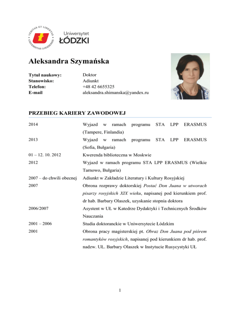 Aleksandra Szymańska Tytuł naukowy: Stanowisko: Telefon: E-mail Doktor Adiunkt +48 42 6655325 [email protected] PRZEBIEG KARIERY ZAWODOWEJ 2014 Wyjazd w ramach programu STA LPP ERASMUS programu STA LPP ERASMUS (Tampere, Finlandia) 2013 Wyjazd w ramach (Sofia, Bułgaria) 01 – 12. 10. 2012 Kwerenda biblioteczna w Moskwie 2012 Wyjazd w ramach programu STA LPP ERASMUS (Wielkie Tarnowo, Bułgaria) 2007 – do chwili obecnej Adiunkt w Zakładzie Literatury i Kultury Rosyjskiej 2007 Obrona rozprawy doktorskiej Postać Don Juana w utworach pisarzy rosyjskich XIX wieku, napisanej pod kierunkiem prof. dr hab. Barbary Olaszek, uzyskanie stopnia doktora 2006/2007 Asystent w UŁ w Katedrze Dydaktyki i Technicznych Środków Nauczania 2001 – 2006 Studia doktoranckie w Uniwersytecie Łódzkim 2001 Obrona pracy magisterskiej pt. Obraz Don Juana pod piórem romantyków rosyjskich, napisanej pod kierunkiem dr hab. prof. nadzw. UŁ. Barbary Olaszek w Instytucie Rusycystyki UŁ 1 PEŁNIONE FUNKCJE od r.a. 2007/2008 do Opiekun r. a. 2010/2011 Kulturologicznego Koła Naukowego Młodych Rusycystów; Koordynator projektów kulturalnych z teatrem Третий этаж z Kaliningradu; Organizator uczelnianych eliminacji do Ogólnopolskiego Konkursu Recytatorskiego w Krakowie 2011/2012 Funkcja kierunkowego koordynatora programu Erasmus 2011/2012 od r.a. 2011/2012, Członek Zespołu ds. programów dydaktycznych Kierunkowy koordynator ECTS, pełnomocnik dziekana ds. 2015/2016 dydaktyki Funkcja sekretarza międzynarodowej konferencji naukowej Współczesny dramat rosyjski: kontynuacje i przemiany (Łódź, 21 – 22. 06. 2012) Funkcja sekretarza międzynarodowej konferencji naukowej Literatura rosyjska XVIII-XXI w. Dialog idei i poetyk (Łódź, 18 – 19. 09. 2014) od 2014 roku Funkcja sekretarza serii Acta Universitatis Lodziensis. Folia Litteraria Rossica od r. a 2016/2017 Członek Rady Instytutu Rusycystyki UŁ od r. a. 2016/2017 Członek Wydziałowej Komisji ds. Jakości i Kształcenia od r. a 2016/2017 Opiekun grupy na kierunku Dziennikarstwo Międzynarodowe (specjalność j. rosyjski) ZAINTERESOWANIA NAUKOWE I BADAWCZE Historia literatury rosyjskiej XIX i XX wieku – intertekstualność jako problem teoretyczno-metodologiczny we współczesnym literaturoznawstwie rosyjskim Semiotyczna koncepcja kultury Badania interkulturowe w kontekście dziedziczenia mitów Motywy hiszpańskie w literaturze rosyjskiej 2 UDZIAŁ W ORGANIZACJACH ZAWODOWYCH, SPOŁECZNYCH I NAUKOWYCH Członek Komisji Okręgowej Olimpiady Języka Rosyjskiego okręgu łódzkiego Organizator uczelnianych eliminacji do Ogólnopolskiego Konkursu Recytatorskiego w Krakowie Funkcja sekretarza w Wydziałowej Komisji Rekrutacyjnej dla doboru kandydatów na studia stacjonarne pierwszego i drugiego stopnia w roku akademickim 2007/2008 Członek „Międzynarodowego Centrum Badań Wschodnioeuropejskich Uniwersytetu Łódzkiego” (od roku akademickiego 2012/2013) Członek Rady Wydziału Filologicznego UŁ na lata 2012 – 2016 Członek komitetu organizacyjnego XII Festiwalu Nauki, Techniki i Sztuki Z wiedzą do sukcesu (kwiecień 2012 Członek Polskiego Towarzystwa Rusycystycznego PROWADZONE ZAJĘCIA Historia literatury rosyjskiej XIX wieku (konwersatorium) Filologiczna analiza tekstu (konwersatorium) Praktyczna nauka języka rosyjskiego (gramatyka funkcjonalna, ćwiczenia) Warsztaty z zakresu dyskursu naukowego (zajęcia fakultatywne) Wstęp do nauki o literaturze (konwersatorium) Kultura rosyjska II połowy XIX-XX ww. (konwersatorium) Kultura rosyjska II połowy XIX-XX ww. z elementami historii (konwersatorium) Realioznawstwo (konwersatorium) Seminarium licencjackie historycznoliterackie Wybrane zagadnienia z historii filmu i teatru rosyjskiego Sceniczne i filmowe adaptacje rosyjskich dzieł literackich NAGRODY I WYRÓŻNIENIA Indywidualna Nagroda Rektora Uniwersytetu Łódzkiego stopnia trzeciego za książkę Postać Don Juana w utworach pisarzy rosyjskich XIX wieku 3 UDZIAŁ W KONFERENCJACH 22-23. 09. 2016 Giessen Międzynarodowa Konferencja Naukowa "Самосознание и (Niemcy) идентичность в русской литературе XVIII-XXI вв." 21-22.10.2014 Gdańsk Międzynarodowa Konferencja Naukowa „Tekst jako kultura. Kultura jako tekst” 18-19.09.2014 Łódź Międzynarodowa Konferencja Naukowa „Literatura rosyjska XVIII – XXI wieku. Dialog idei i poetyk” 10–11.10.2013 Granada Interdyscyplinarna Konferencja Naukowa „El Terrorismo (Hiszpania) del Siglo XXI” 10–12.09.2012 Giessen Międzynarodowa Konferencja Naukowa «Поэтика быта. (Niemcy) Российская литература XVIII–XXI вв.» 21 – 22.06.2012 Łódź Międzynarodowa Konferencja Naukowa „Współczesny dramat rosyjski: kontynuacje i przemiany” 27 – 28.06.2011 Olsztyn Międzynarodowa Konferencja Slawistyczna „Polsko- wschodniosłowiańskie relacje kulturowe, literackie, językowe (Fakty. Stereotypy. Mity)” 26-27.05.2011 Zielona Góra XV Międzynarodowe Sympozjum Slawistyczne „Literatury i języki wschodniosłowiańskie wobec swego czasu historycznego” 19 – 20. 09.2011 Białystok Międzynarodowa Konferencja Naukowa „Feminizm, gender i queer – wczoraj i dziś” 21-23. 09.2010 Łódź Międzynarodowa Konferencja Naukowa „Literatura rosyjska XVIII – XXI wieku. Dialog idei i poetyk” 22 – 23. 09.2009 Opole Międzynarodowa Konferencja Naukowa „Słowianie Wschodni na emigracji: literatura - język – kultura” 10. 2009 Twer Międzynarodowa Konferencja Naukowa „Literatura rosyjska od czasów najdawniejszych po dzień dzisiejszy. Znak i mit” 31.05.– 01.06.2007 Słupsk Międzynarodowa Konferencja Naukowa „Wschód – Zachód. Dialog kultur” 2001 Warszawa Międzynarodowa Konferencja Naukowa 4 ZNAJOMOŚĆ JĘZYKÓW OBCYCH rosyjski, angielski 5 Александра Шиманьска Образование: Окончила отделение русской филологии Лодзинск