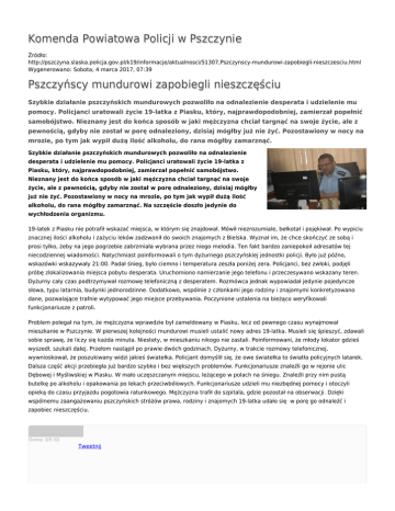 Komenda Powiatowa Policji w Pszczynie Źródło: http://pszczyna.slaska.policja.gov.pl/k19/informacje/aktualnosci/51307,Pszczynscy-mundurowi-zapobiegli-nieszczesciu.html Wygenerowano: Sobota, 4 marca 2017, 07:39 Pszczyńscy mundurowi zapobiegli nieszczęściu Szybkie działanie pszczyńskich mundurowych pozwoliło na odnalezienie desperata i udzielenie mu pomocy. Policjanci uratowali życie 19-latka z Piasku, który, najprawdopodobniej, zamierzał popełnić samobójstwo. Nieznany jest do końca sposób w jaki mężczyzna chciał targnąć na swoje życie, ale z pewnością, gdyby nie został w porę odnaleziony, dzisiaj mógłby już nie żyć. Pozostawiony w nocy na mrozie, po tym jak wypił dużą ilość alkoholu, do rana mógłby zamarznąć. Szybkie działanie pszczyńskich mundurowych pozwoliło na odnalezienie desperata i udzielenie mu pomocy. Policjanci uratowali życie 19-latka z Piasku, który, najprawdopodobniej, zamierzał popełnić samobójstwo. Nieznany jest do końca sposób w jaki mężczyzna chciał targnąć na swoje życie, ale z pewnością, gdyby nie został w porę odnaleziony, dzisiaj mógłby już nie żyć. Pozostawiony w nocy na mrozie, po tym jak wypił dużą ilość alkoholu, do rana mógłby zamarznąć. Na szczęście doszło jedynie do wychłodzenia organizmu. 19-latek z Piasku nie potrafił wskazać miejsca, w którym się znajdował. Mówił niezrozumiale, bełkotał i pojękiwał. Po wypiciu znacznej ilości alkoholu i zażyciu leków zadzwonił do swoich znajomych z Bielska. Wyznał im, że chce skończyć ze sobą i prosi tylko, żeby na jego pogrzebie zabrzmiała wybrana przez niego melodia. Ten fakt bardzo zaniepokoił adresatów tej niecodziennej wiadomości. Natychmiast poinformowali o tym dyżurnego pszczyńskiej jednostki policji. Było już późno, wskazówki wskazywały 21:00. Padał śnieg, było ciemno i temperatura zeszła poniżej zera. Policjanci, bez zwłoki, podjęli próbę zlokalizowania miejsca pobytu desperata. Uruchomiono namierzanie jego telefonu i przeczesywano wskazany teren. Dyżurny cały czas podtrzymywał rozmowę telefoniczną z desperatem. Rozmówca jednak wypowiadał jedynie pojedyncze słowa, typu latarnia, budynki jednorodzinne. Dodatkowo, wspólnie z członkami jego rodziny i znajomymi konkretyzowano dane, pozwalające trafnie wytypować jego miejsce przebywania. Poczynione ustalenia na bieżąco weryfikowali funkcjonariusze z patroli. Problem polegał na tym, że mężczyzna wprawdzie był zameldowany w Piasku, lecz od pewnego czasu wynajmował mieszkanie w Pszczynie. W pierwszej kolejności mundurowi musieli ustalić nowy adres 19-latka. Musieli się śpieszyć, zdawali sobie sprawę, że liczy się każda minuta. Niestety, w mieszkaniu nikogo nie zastali. Poinformowani, że młody lokator gdzieś wyszedł, szukali dalej. Przełom nastąpił po prawie dwóch godzinach. Dyżurny, w trakcie rozmowy telefonicznej, wywnioskował, że poszukiwany widzi jakieś światełka. Policjant domyślił się, że owe światełka to światła policyjnych latarek. Dalsza część akcji przebiegła już bardzo szybko i bez większych problemów. Funkcjonariusze znaleźli go w rejonie ulic Dębowej i Myśliwskiej w Piasku. W mało uczęszczanym miejscu, leżącego w polach na śniegu. Znaleźli przy nim pustą butelkę po alkoholu i opakowania po lekach przeciwbólowych. Funkcjonariusze udzieli mu niezbędnej pomocy i otoczyli opieką do czasu przyjazdu pogotowia ratunkowego. Mężczyzna trafił do szpitala, gdzie pozostał na obserwacji. Dzięki wspólnemu zaangażowaniu pszczyńskich stróżów prawa, rodziny i znajomych 19-latka udało się w porę go odnaleźć i zapobiec nieszczęściu. Ocena: 0/5 (0) Tweetnij
