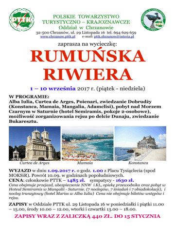 POLSKIE TOWARZYSTWO TURYSTYCZNO – KRAJOZNAWCZE Oddział w Chrzanowie 32-500 Chrzanów, ul. 29 Listopada 16 tel. 694 629 659 www.chrzanow.pttk.pl e-mail: [email protected] zaprasza na wycieczkę: RUMUŃSKA RIWIERA 1 – 10 września 2017 r. (piątek - niedziela) W PROGRAMIE: Alba Iulia, Curtea de Arges, Poienari, zwiedzanie Dobrudży (Konstanca, Mamaia, Mangalia, Adamclisi), pobyt nad Morzem Czarnym w Saturnie (hotel Semiramis, pokoje 2-osobowe), możliwość zorganizowania rejsu po delcie Dunaju, zwiedzanie Bukaresztu. Curtea de Arges Mamaia Konstanca WYJAZD w dniu 1.09.2017 r. o godz. 1.00 z Placu Tysiąclecia (spod MOKSiR). Powrót 10.09. w godzinach popołudniowych. CENA: członkowie PTTK – 1485 zł. sympatycy - 1630 zł. Cena obejmuje przejazd, ubezpieczenie NNW i KL, opiekę przewodnika 0raz pobyt w Hoteul Semiramis w Mangalii - Saturnie. (7 noclegów, 7 śniadań i 7 obiadokolacji), i nocleg tranzytowy (hotel Mariss w Alba Iulia) Cena nie obejmuje biletów wstępów i rejsu. ZAPISY w Oddziale PTTK ul. 29 Listopada 16 w poniedziałki i piątki 11.00 – 15.00, środy 10.00 – 12.00, wtorki i czwartki 13.00 – 18.00. ZAPISY WRAZ Z ZALICZKĄ 440 ZŁ. DO 15 STYCZNIA