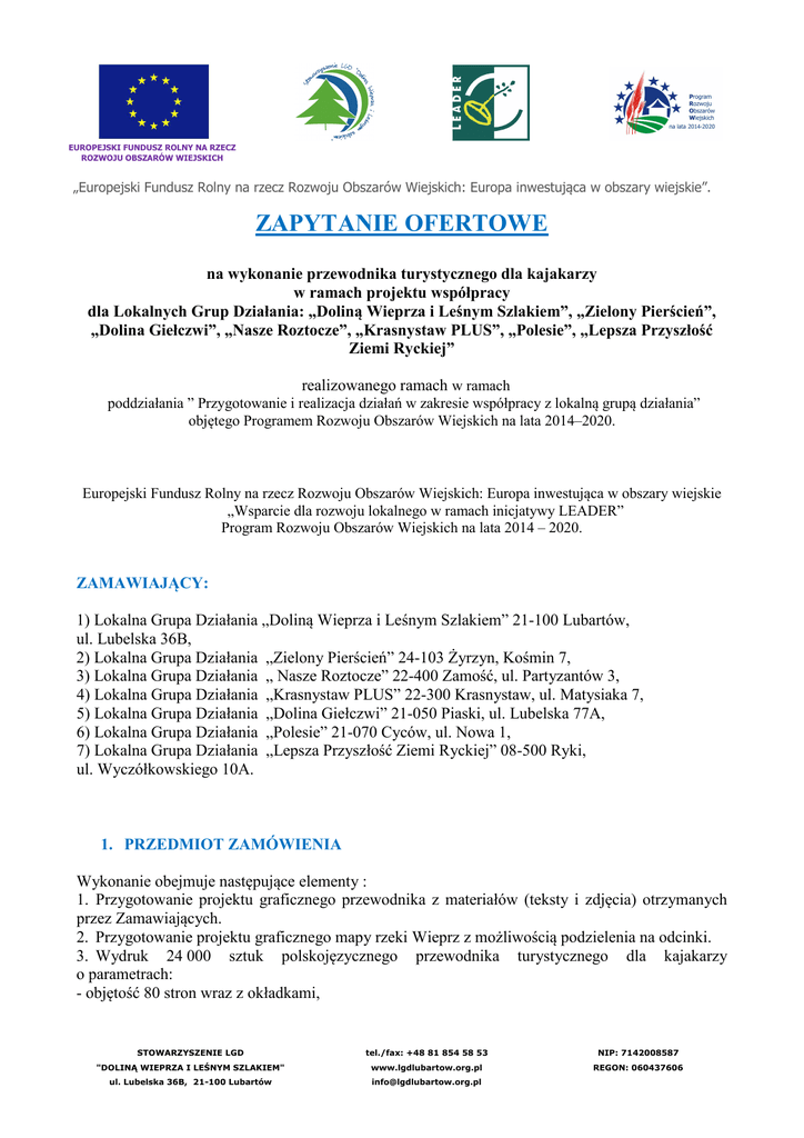 EUROPEJSKI FUNDUSZ ROLNY NA RZECZ ROZWOJU OBSZARÓW WIEJSKICH „Europejski Fundusz Rolny na rzecz Rozwoju Obszarów Wiejskich: Europa inwestująca w obszary wiejskie”. ZAPYTANIE OFERTOWE na wykonanie przewodnika turystycznego dla kajakarzy w ramach projektu współpracy dla Lokalnych Grup Działania: „Doliną Wieprza i Leśnym Szlakiem”, „Zielony Pierścień”, „Dolina Giełczwi”, „Nasze Roztocze”, „Krasnystaw PLUS”, „Polesie”, „Lepsza Przyszłość Ziemi Ryckiej” realizowanego ramach w ramach poddziałania ” Przygotowanie i realizacja działań w zakresie współpracy z lokalną grupą działania” objętego Programem Rozwoju Obszarów Wiejskich na lata 2014–2020. Europejski Fundusz Rolny na rzecz Rozwoju Obszarów Wiejskich: Europa inwestująca w obszary wiejskie „Wsparcie dla rozwoju lokalnego w ramach inicjatywy LEADER” Program Rozwoju Obszarów Wiejskich na lata 2014 – 2020. ZAMAWIAJĄCY: 1) Lokalna Grupa Działania „Doliną Wieprza i Leśnym Szlakiem” 21-100 Lubartów, ul. Lubelska 36B, 2) Lokalna Grupa Działania „Zielony Pierścień” 24-103 Żyrzyn, Kośmin 7, 3) Lokalna Grupa Działania „ Nasze Roztocze” 22-400 Zamość, ul. Partyzantów 3, 4) Lokalna Grupa Działania „Krasnystaw PLUS” 22-300 Krasnystaw, ul. Matysiaka 7, 5) Lokalna Grupa Działania „Dolina Giełczwi” 21-050 Piaski, ul. Lubelska 77A, 6) Lokalna Grupa Działania „Polesie” 21-070 Cyców, ul. Nowa 1, 7) Lokalna Grupa Działania „Lepsza Przyszłość Ziemi Ryckiej” 08-500 Ryki, ul. Wyczółkowskiego 10A. 1. PRZEDMIOT ZAMÓWIENIA Wykonanie obejmuje następujące elementy : 1. Przygotowanie projektu graficznego przewodnika z materiałów (teksty i zdjęcia) otrzymanych przez Zamawiających. 2. Przygotowanie projektu graficznego mapy rzeki Wieprz z możliwością podzielenia na odcinki. 3. Wydruk 24 000 sztuk polskojęzycznego przewodnika turystycznego dla kajakarzy o parametrach: - objętość 80 stron wraz z okładkami, STOWARZYSZENIE LGD tel./fax: +48 81 854 58 53 NIP: 7142008587 "DOLINĄ WIEPRZA I LEŚNYM SZLAKIEM" www.lgdlubartow.org.pl REGON: 060437606 ul. Lubelska 36B, 21-100 Lubartów [email protected] EUROPEJSKI FUNDUSZ ROLNY NA RZECZ ROZWOJU OBSZARÓW WIEJSKICH „Europejski Fundusz Rolny na rzecz Rozwoju Obszarów Wiejskich: Europa inwestująca w obszary wiejskie”. - format A5, - wydruk na permament paper – mark resist gramatura 185 mikronów lub wyższa, - full kolor CMYK dwustronny 4/4, - mocowanie spirala. 4. Przekazanie Zamawiającym wykonanego projektu przewodnika w formacie pdf oraz okładek i map w formacie jpg. 5. Wydruk 2 800 sztuk anglojęzycznego przewodnika turystycznego dla kajakarzy o parametrach: - objętość 80 stron wraz z okładkami, - format A5, - wydruk na permament paper – mark resist gramatura 185 mikronów lub wyższa, - full kolor CMYK dwustronny 4/4, - mocowanie spirala. 6. Przekazanie Zamawiającym wykonanego projektu przewodnika w formacie pdf oraz okładek i map w formacie jpg. 7. Dostarczenie przewodników do Zamawiających pod następujące adresy: - LGD „Doliną Wieprza i Leśnym Szlakiem” 21-100 Lubartów, ul. Lubelska 36B, - LGD „Zielony Pierścień” 24-103 Żyrzyn, Kośmin 7, - LGD „ Nasze Roztocze” 22-400 Zamość, ul. Partyzantów 3, - LGD „Krasnystaw PLUS” 22-300 Krasnystaw, ul. Matysiaka 7, - LGD „Dolina Giełczwi” 21-050 Piaski, ul. Lubelska 77A, - LGD „Polesie” 21-070 Cyców, ul. Nowa 1, - LGD „Lepsza Przyszłość Ziemi Ryckiej” 08-500 Ryki, ul. Wyczółkowskiego 10A. 4. TERMIN WYKONANIA ZAMÓWIENIA 1. 31.12.2017 roku 5. INFORMACJE O WYMAGANYCH DOKUMENTACH Ofertę należy złożyć na: druku zapytania ofertowego do wypełnienia. 6. OSOBA UPRAWNIONA DO POROZUMIEWANIA SIĘ Z OFERENTAMI Osoba do kontaktu: Leszek Zieliński – tel. / fax.: 81 8545853; e-mail: [email protected] 7. MIEJSCE ORAZ TERMIN SKŁADANIA OFERT Ofertę należy złożyć pocztą elektroniczną w formie skanu prawidłowo wypełnionego i opieczętowanego druku zapytania ofertowego wraz z załącznikami z pkt. 8 na dres: [email protected] do dnia 20.09.2016 do godz. 14.00. STOWARZYSZENIE LGD tel./fax: +48 81 854 58 53 NIP: 7142008587 "DOLINĄ WIEPRZA I LEŚNYM SZLAKIEM" www.lgdlubartow.org.pl REGON: 060437606 ul. Lubelska 36B, 21-100 Lubartów [email protected] EUROPEJSKI FUNDUSZ ROLNY NA RZECZ ROZWOJU OBSZARÓW WIEJSKICH „Europejski Fundusz Rolny na rzecz Rozwoju Obszarów Wiejskich: Europa inwestująca w obszary wiejskie”. 8. KRYTERIA, KTÓRYMI BĘDĄ SIĘ KIEROWALI ZAMAWIAJĄCY PRZY WYBORZE OFERTY, WRAZ Z PODANIEM ZNACZENIA TYCH KRYTERIÓW Zamawiający zleci wykonanie przedmiotu zamówienia wykonawcy, co do którego ustalono: 1) wykaże doświadczenie w realizacji podobnych, jak przedmiot zamówienia projektów przedstawiając portfolio min. trzech zrealizowanych przewodników (kajakowych lub rowerowych) potwierdzonych pozytywnymi referencjami o nakładzie minimum 5 tysięcy egzemplarzy i objętości minimum 50 stron (10 % pkt – maksymalnie 10 punktów); 2) przedstawi Zamawiającym trzy wizualizacje koncepcji graficznej okładek i standardowego modułu rozdziału na realizację w/w przewodnika turystycznego dla kajakarzy (30% pkt – maksymalnie 30 punktów). Ocena przedstawiony wizualizacji odbywać się w następujący sposób: - przedstawiciele Zamawiających wybiorą po jednej wizualizacji od każdego Wykonawcy ich zdaniem najbardziej odpowiadającej koncepcji zamówienia, - następnie z tej puli zostaną wybrane trzy najbardziej odpowiadające Zamawiającym wizualizacje, które podlegać będą punktacji ( I miejsce – 30 pkt.; II miejsce – 20 pkt.; III miejsce – 10 pkt.). 3) zaoferuje najkorzystniejszą – najniższą cenę ofertową brutto za wykonanie całości zamówienia (60% pkt – maksymalnie 60 punktów). 9. INFORMACJE DODATKOWE: 1. Zamawiający zastrzegają sobie prawo do unieważnienia wyników zapytania bez podawania przyczyn. 2. Podpisanie umowy między Zamawiającymi a