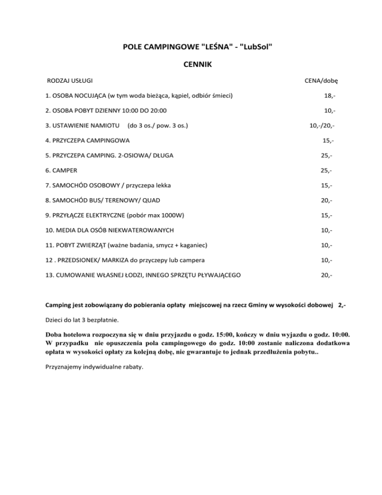 POLE CAMPINGOWE "LEŚNA" - "LubSol" CENNIK RODZAJ USŁUGI CENA/dobę 1. OSOBA NOCUJĄCA (w tym woda bieżąca, kąpiel, odbiór śmieci) 18,- 2. OSOBA POBYT DZIENNY 10:00 DO 20:00 10,- 3. USTAWIENIE NAMIOTU (do 3 os./ pow. 3 os.) 10,-/20,- 4. PRZYCZEPA CAMPINGOWA 15,- 5. PRZYCZEPA CAMPING. 2-OSIOWA/ DŁUGA 25,- 6. CAMPER 25,- 7. SAMOCHÓD OSOBOWY / przyczepa lekka 15,- 8. SAMOCHÓD BUS/ TERENOWY/ QUAD 20,- 9. PRZYŁĄCZE ELEKTRYCZNE (pobór max 1000W) 15,- 10. MEDIA DLA OSÓB NIEKWATEROWANYCH 10,- 11. POBYT ZWIERZĄT (ważne badania, smycz + kaganiec) 10,- 12 . PRZEDSIONEK/ MARKIZA do przyczepy lub campera 10,- 13. CUMOWANIE WŁASNEJ ŁODZI, INNEGO SPRZĘTU PŁYWAJĄCEGO 20,- Camping jest zobowiązany do pobierania opłaty miejscowej na rzecz Gminy w wysokości dobowej 2,Dzieci do lat 3 bezpłatnie. Doba hotelowa rozpoczyna się w dniu przyjazdu o godz. 15:00, kończy w dniu wyjazdu o godz. 10:00. W przypadku nie opuszczenia pola campingowego do godz. 10:00 zostanie naliczona dodatkowa opłata w wysokości opłaty za kolejną dobę, nie gwarantuje to jednak przedłużenia pobytu.. Przyznajemy indywidualne rabaty.