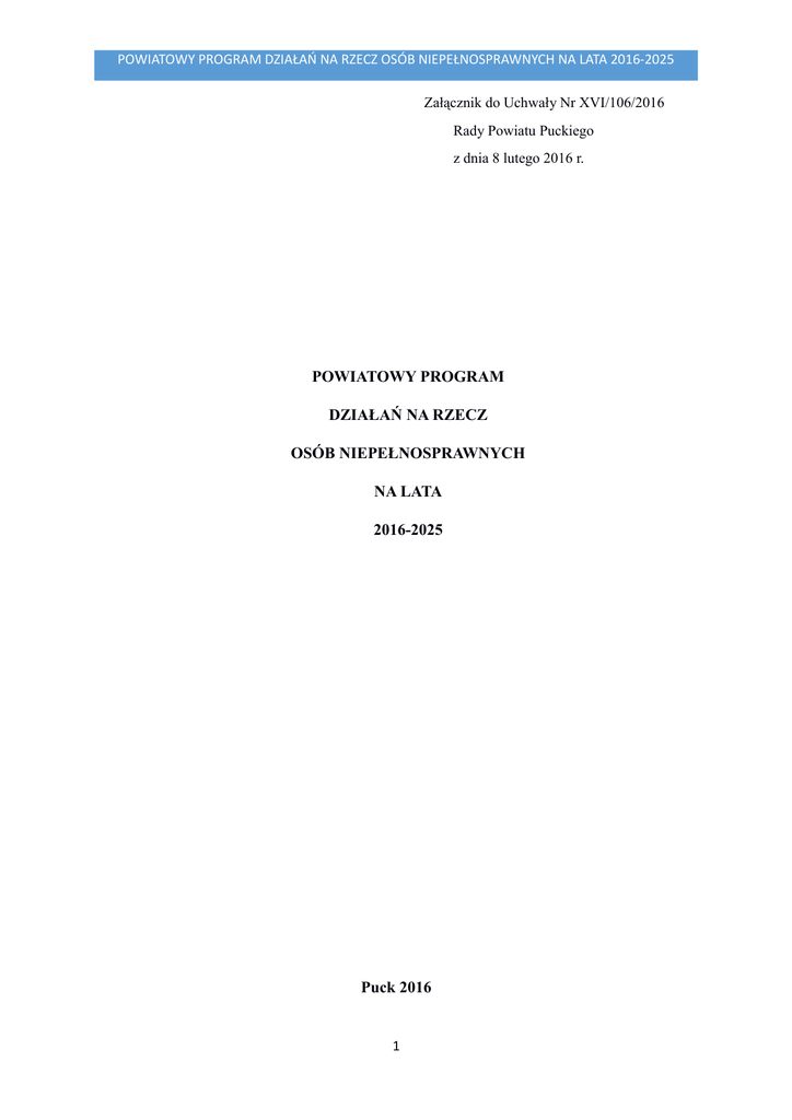 POWIATOWY PROGRAM DZIAŁAŃ NA RZECZ OSÓB NIEPEŁNOSPRAWNYCH NA LATA 2016-2025 Załącznik do Uchwały Nr XVI/106/2016 Rady Powiatu Puckiego z dnia 8 lutego 2016 r. POWIATOWY PROGRAM DZIAŁAŃ NA RZECZ OSÓB NIEPEŁNOSPRAWNYCH NA LATA 2016-2025 Puck 2016 1 POWIATOWY PROGRAM DZIAŁAŃ NA RZECZ OSÓB NIEPEŁNOSPRAWNYCH NA LATA 2016-2025 SPIS TREŚCI 1. Wstęp 3 2. Opis problemu – niepełnosprawność jako problem społeczny 5 3. Diagnoza istniejącego stanu w zakresie infrastruktury działającej na rzecz osób niepełnosprawnych 9 4. Cel szczegółowy 1 15 Inicjowanie, prowadzenie i wspieranie działań zmierzających do likwidacji barier (m.in. architektonicznych, komunikacyjnych, społecznych) utrudniających osobom niepełnosprawnym pełne uczestnictwo w życiu społecznym 5. Cel szczegółowy 2 19 Rozwój usług rehabilitacyjnych 6. Cel szczegółowy 3 22 Integracja społeczna, zapobieganie społecznemu wykluczeniu – wspieranie aktywnego udziału osób niepełnosprawnych w życiu społecznym (kultura, sport, turystyka) 7. Cel szczegółowy 4 25 Integracja i aktywizacja zawodowa osób niepełnosprawnych 8. Podsumowanie 29 2 POWIATOWY PROGRAM DZIAŁAŃ NA RZECZ OSÓB NIEPEŁNOSPRAWNYCH NA LATA 2016-2025 1. Wstęp Zgodnie z danymi Światowej Organizacji Zdrowia prawie miliard ludzi na świecie (15 proc. ludności globu) cierpi na różne niepełnosprawności. Spośród nich prawie 200 milionów osób cierpi z powodu niepełnosprawności w stopniu ciężkim. Jedna na 6 osób w Unii Europejskiej jest niepełnosprawna, w stopniu od lekkiego do znacznego, co oznacza, że około 80 mln Europejczyków ma ograniczone możliwości pełnego uczestnictwa w życiu społecznym i gospodarczym. Powszechność zjawiska stawia przed poszczególnymi państwami obowiązek podejmowania działań zapobiegających powstawaniu oraz łagodzenia jej skutków. Działania na rzecz osób niepełnosprawnych są zadaniem ogólnospołecznym, bowiem skutki niepełnosprawności dotyczą wszystkich dziedzin życia. W Polsce według wyników Narodowego Spisu Powszechnego Ludności i Mieszkań z 2011 roku liczba osób niepełnosprawnych wynosiła na koniec marca 2011r. około 4,7 mln (dokładnie 4 697,0 tys.). Tym samym liczba osób niepełnosprawnych w Polsce stanowiła 12,2% ludności kraju. Spośród nich pracuje zaledwie 465 tys. – wynika z danych GUS za III kwartał 2011 roku. Choć wskaźnik ten z każdym rokiem się poprawia, to wciąż daleko nam do innych krajów Unii Europejskiej, gdzie zatrudnienie niepełnosprawnych wynosi około 50%. Podstawą opracowania „Powiatowego Programu Działań Na Rzecz Osób Niepełnosprawnych na lata 2016-2025” (zwanego dalej „Programem”) jest art. 35a pkt 1) ustawy z dnia 27 sierpnia 1997 r. o rehabilitacji zawodowej i społecznej oraz zatrudnianiu osób niepełnosprawnych (t.j. Dz.U. z 2011 r. Nr 127 poz. 721 z poźn.zm.), który stanowi, że do zadań powiatu należy – opracowywanie i realizacja, zgodnych z powiatową strategią dotyczącą rozwiązywania problemów społecznych, powiatowych programów działań na rzecz osób niepełnosprawnych w zakresie: a) rehabilitacji społecznej, b) rehabilitacji zawodowej i zatrudnienia, c) przestrzegania praw osób niepełnosprawnych. Dokument ten wyznacza założenia polityki samorządu powiatowego w zakresie: a) rehabilitacji społecznej, b) rehabilitacji zawodowej i zatrudnienia, c) przestrzegania praw osób niepełnosprawnych. Standardy światowe i europejskie sformułowane w licznych dokumentach międzynarodowych określają, że osoby niepełnosprawne mają prawo do pełnego uczestnictwa i równych szans w życiu społecznym i zawodowym. Program jest zgodny z programami i ustawodawstwem polskim zawartym w szczególności w następujących aktach: 1) Konstytucji RP zawierającej zapisy zapobiegające praktykom dyskryminacyjnym wobec osób niepełnosprawnych, 3 POWIATOWY PROGRAM DZIAŁAŃ NA RZECZ OSÓB NIEPEŁNOSPRAWNYCH NA LATA 2016-2025 2) Karcie Praw Osób Niepełnosprawnych – uchwała Sejmu RP z dnia 1 sierpnia 1997 r. (M.P. Nr 50, poz. 475), 3) uchwale Sejmu Rzeczypospolitej Polskiej w sprawie przeciwdziałania wykluczeniu społecznemu osób niepełnosprawnych z dnia 7 grudnia 2012 r. (M.P. z 2012 r., poz. 991), 4) ustawie z dnia 27 sierpnia 1997r. o rehabilitacji zawodowej i społecznej oraz zatrudnianiu osób niepełnosprawnych (Dz.U. z 2011 Nr 127, poz. 721 z późn.zm.), 5) Kodeksie pracy w zapisach zabraniających praktyk dyskryminacyjnych wobec osób niepełnosprawnych. Program jest zgodny z: 1) Powiatową Strategią Rozwiązywania problemów społecznych 2016-2025, 2) Programem Operacyjnym Kapitał Ludzki, 3) Strategią Polityki Społecznej Województwa Pomorskiego 2014-2020 (zał. nr 1 do uchwały 763/XXXVI/13 Sejmiku Województwa Pomorskiego z dnia 20.12.2013) Opracowany Program jest dokumentem służącym realizacji polityki socjalnej. Stanowi podstawę do opracowania i realizacji programów celowych na rzecz osób niepełnosprawnych i pozyskania dodatkowych środków na programy z Państwowego Funduszu Osób Niepełnosprawnych, jak również umożliwiające wykorzystanie środków z Unii Europejskiej, a w szczególności Europejskiego Funduszu Społecznego. Program jest kontynuacją działań, które podjęto w ramach realizacji poprzedniego programu dla powiatu puckiego na rzecz poprawy warunków życia społecznego, zawodowego osób niepełnosprawnych na lata 2004-2014. Rozpoznanie i zdiagnozowanie potrzeb osób niepełnosprawnych, a także podejmowanie działań mających na celu wyeliminowanie przeszkód utrudniających osobom niepełnosprawnym aktywny udział w życiu społecznym zapobiega marginalizowaniu i wykluczeniu społecznemu tej grupy osób. Program na rzecz osób niepełnosprawnych ma na celu zminimalizowanie skutków niepełnosprawności oraz umożliwienie zaspokojenia potrzeb osób niepełnosprawnych we wszystkich obszarach życia. Program ma charakter otwarty, a stopień ogólnoś