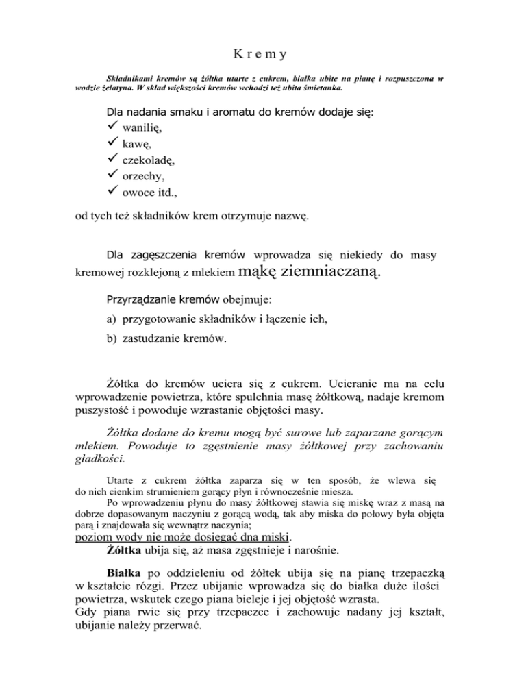 Kremy Składnikami kremów są żółtka utarte z cukrem, białka ubite na pianę i rozpuszczona w wodzie żelatyna. W skład większości kremów wchodzi też ubita śmietanka. Dla nadania smaku i aromatu do kremów dodaje się: wanilię, kawę, czekoladę, orzechy, owoce itd., od tych też składników krem otrzymuje nazwę. Dla zagęszczenia kremów wprowadza się niekiedy do masy kremowej rozklejoną z mlekiem mąkę ziemniaczaną. Przyrządzanie kremów obejmuje: a) przygotowanie składników i łączenie ich, b) zastudzanie kremów. Żółtka do kremów uciera się z cukrem. Ucieranie ma na celu wprowadzenie powietrza, które spulchnia masę żółtkową, nadaje kremom puszystość i powoduje wzrastanie objętości masy. Żółtka dodane do kremu mogą być surowe lub zaparzane gorącym mlekiem. Powoduje to zgęstnienie masy żółtkowej przy zachowaniu gładkości. Utarte z cukrem żółtka zaparza się w ten sposób, że wlewa się do nich cienkim strumieniem gorący płyn i równocześnie miesza. Po wprowadzeniu płynu do masy żółtkowej stawia się miskę wraz z masą na dobrze dopasowanym naczyniu z gorącą wodą, tak aby miska do połowy była objęta parą i znajdowała się wewnątrz naczynia; poziom wody nie może dosięgać dna miski. Żółtka ubija się, aż masa zgęstnieje i narośnie. Białka po oddzieleniu od żółtek ubija się na pianę trzepaczką w kształcie rózgi. Przez ubijanie wprowadza się do białka duże ilości powietrza, wskutek czego piana bieleje i jej objętość wzrasta. Gdy piana rwie się przy trzepaczce i zachowuje nadany jej kształt, ubijanie należy przerwać. Pianę utrwala dodatek cukru. W tym celu do ubitej piany należy dodawać po łyżeczce część cukru przeznaczonego do kremu i ubijać ją nadal, aż do uzyskania sztywności. Następnie należy pianę wymieszać lekko z resztą składników. Śmietanka wchodzi w skład kremów po uprzednim ubiciu na pianę. Do ubijania nadaje się śmietanka 30-procentowa, tzw. kremowa. Śmietankę należy ubijać schłodzoną, najlepiej na lodzie. Ubijanie odbywa się przy użyciu trzepaczki i stosowaniu jednostajnych i szerokich ruchów w kształcie ósemki, przy obracaniu miski. Mąka ziemniaczana używana do zagęszczania kremów powinna być wymieszana z zimnym mlekiem i zagotowana. Owoce przeznaczone do kremów gotuje się lub piecze i przeciera. Owoce surowe miażdży się lub przeciera. Żelatynę należy moczyć w wodzie od 30 minut do godziny, po czym lekko odcisnąć z wody, włożyć do rondelka i mieszając podgrzewać do rozpuszczenia. Rondelek z rozpuszczoną żelatyną należy przetrzymać w gorącej wodzie, aby nie skrzepła. Kawa wchodzi do kremu w postaci naparu, czekoladę rozgrzewa się do miękkości, uciera z żółtkiem, orzechy miele się w maszynce. Z cytryny należy zetrzeć skórkę, a sok odcisnąć. Kakao należy wymieszać z wodą na gęstą papkę, zagotować i dodać do masy żółtkowej; kolejność łączenia składników podają przepisy szczegółowe. Po połączeniu składników ubija się masę kremową – gdy zacznie krzepnąć, natychmiast napełnia się nią zwilżone, wysypane cukrempudrem formy i zostawia w chłodnym miejscu do wystudzenia. Przed podaniem krem należy okrążyć dookoła nożem i wyłożyć na okrągły półmisek. Gdyby przywarł do formy, należy ją zanurzyć na moment w gorącej wodzie, po czym przykryć półmiskiem, odwrócić go wraz z formą do góry dnem, wstrząsnąć i zdjąć formę. Kremy przybiera się surowymi, osuszonymi owocami, konfiturami, waflami, biszkoptami. Praca zbiorowa pod redakcją S. Bergera, Kuchnia polska, Państwowe Wydawnictwo Ekonomiczne, wyd. XI, Warszawa 1967; tekst dostosowano do celów dydaktycznych.