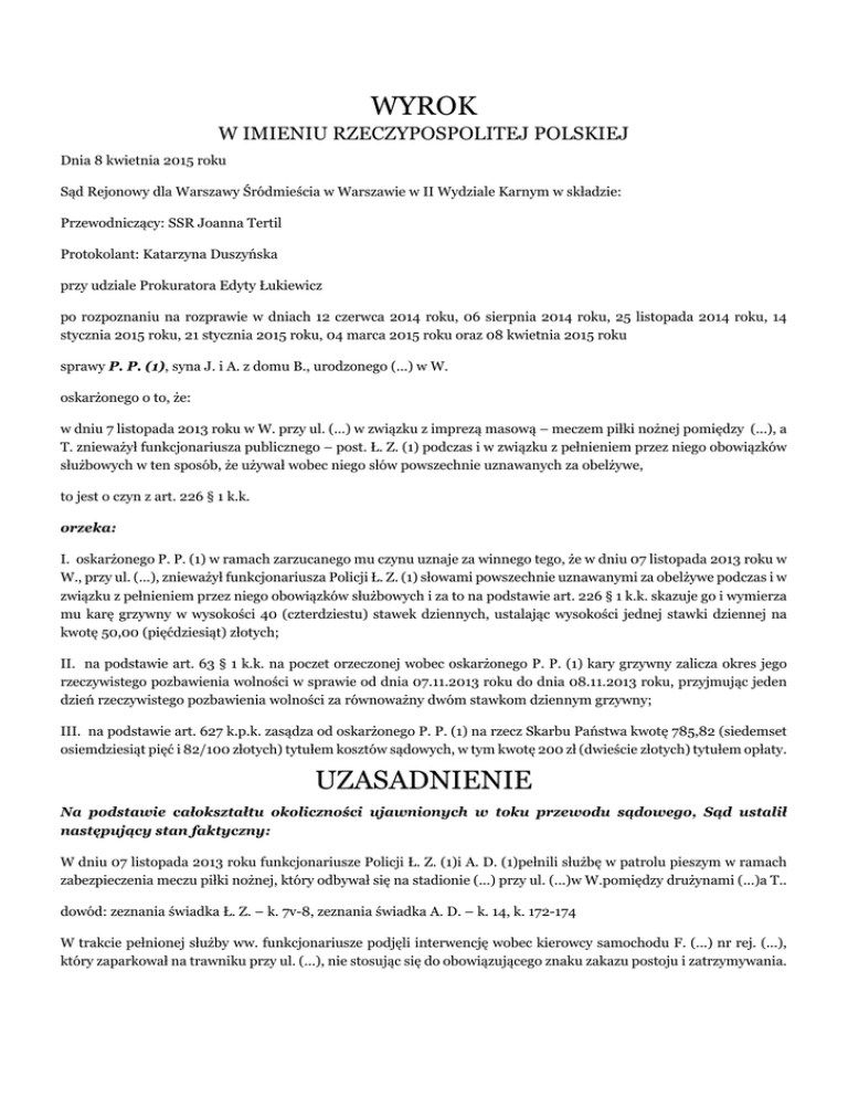 WYROK W IMIENIU RZECZYPOSPOLITEJ POLSKIEJ Dnia 8 kwietnia 2015 roku Sąd Rejonowy dla Warszawy Śródmieścia w Warszawie w II Wydziale Karnym w składzie: Przewodniczący: SSR Joanna Tertil Protokolant: Katarzyna Duszyńska przy udziale Prokuratora Edyty Łukiewicz po rozpoznaniu na rozprawie w dniach 12 czerwca 2014 roku, 06 sierpnia 2014 roku, 25 listopada 2014 roku, 14 stycznia 2015 roku, 21 stycznia 2015 roku, 04 marca 2015 roku oraz 08 kwietnia 2015 roku sprawy P. P. (1), syna J. i A. z domu B., urodzonego (...) w W. oskarżonego o to, że: w dniu 7 listopada 2013 roku w W. przy ul. (...) w związku z imprezą masową – meczem piłki nożnej pomiędzy (...), a T. znieważył funkcjonariusza publicznego – post. Ł. Z. (1) podczas i w związku z pełnieniem przez niego obowiązków służbowych w ten sposób, że używał wobec niego słów powszechnie uznawanych za obelżywe, to jest o czyn z art. 226 § 1 k.k. orzeka: I. oskarżonego P. P. (1) w ramach zarzucanego mu czynu uznaje za winnego tego, że w dniu 07 listopada 2013 roku w W., przy ul. (...), znieważył funkcjonariusza Policji Ł. Z. (1) słowami powszechnie uznawanymi za obelżywe podczas i w związku z pełnieniem przez niego obowiązków służbowych i za to na podstawie art. 226 § 1 k.k. skazuje go i wymierza mu karę grzywny w wysokości 40 (czterdziestu) stawek dziennych, ustalając wysokości jednej stawki dziennej na kwotę 50,00 (pięćdziesiąt) złotych; II. na podstawie art. 63 § 1 k.k. na poczet orzeczonej wobec oskarżonego P. P. (1) kary grzywny zalicza okres jego rzeczywistego pozbawienia wolności w sprawie od dnia 07.11.2013 roku do dnia 08.11.2013 roku, przyjmując jeden dzień rzeczywistego pozbawienia wolności za równoważny dwóm stawkom dziennym grzywny; III. na podstawie art. 627 k.p.k. zasądza od oskarżonego P. P. (1) na rzecz Skarbu Państwa kwotę 785,82 (siedemset osiemdziesiąt pięć i 82/100 złotych) tytułem kosztów sądowych, w tym kwotę 200 zł (dwieście złotych) tytułem opłaty. UZASADNIENIE Na podstawie całokształtu okoliczności ujawnionych w toku przewodu sądowego, Sąd ustalił następujący stan faktyczny: W dniu 07 listopada 2013 roku funkcjonariusze Policji Ł. Z. (1)i A. D. (1)pełnili służbę w patrolu pieszym w ramach zabezpieczenia meczu piłki nożnej, który odbywał się na stadionie (...) przy ul. (...)w W.pomiędzy drużynami (...)a T.. dowód: zeznania świadka Ł. Z. – k. 7v-8, zeznania świadka A. D. – k. 14, k. 172-174 W trakcie pełnionej służby ww. funkcjonariusze podjęli interwencję wobec kierowcy samochodu F. (...) nr rej. (...), który zaparkował na trawniku przy ul. (...), nie stosując się do obowiązującego znaku zakazu postoju i zatrzymywania. Kierowcą tym był P. S. (1). Oprócz kierowcy w pojeździe znajdowało się również czterech innych mężczyzn, tj. P. P. (1), P. P. (2), M. E. (1) oraz Ł. K. (1). dowód: zeznania świadka Ł. Z. – k. 7v-8, k. 134-137, zeznania świadka A. D. – k. 14, k. 172-174, zeznania świadka M. E. – k. 230-232, k. 26, zeznania świadka P. S. – k. 28v, k. 228-230, zeznania świadka Ł. K. – k. 30v-31, k. 209-211, zeznania świadka P. P. – k. 32v-33, k. 206-209, wyjaśnienia oskarżonego – k. 37v-38 Podczas przeprowadzanej interwencji pasażerowie samochodu F. (...) nr rej. (...) wysiedli z pojazdu i podjęli próbę skłonienia funkcjonariuszy do odstąpienia od wykonywanych czynności, mówiąc, że spieszą się na mecz. Z uwagi na powyższe, drogą radiową Ł. Z. (1) wezwał do pomocy patrol zmotoryzowany składający się z dowódcy S. G. (1) i S. K. (1). dowód: zeznania świadka Ł. Z. – k. 7v-8, zeznania świadka A. D. – k. 172-174, zeznania świadka S. G. – k. 9v-10, k. 151-155, zeznania świadka S. K. – k. 12, k. 171-172, zeznania świadka M. E. – k. 26, k. 230-232 zeznania świadka Ł. K. – k. 30v-31, k. 209-211zeznania świadka P. P. – k. 32v-33 k. 206-209 Po przybyciu na miejsce S. G. (1), P. P. (1) zwrócił się do niego o podanie imienia i nazwiska, co ten uczynił. W tym czasie Ł. Z. (1) kontynuował czynności wobec kierowcy samochodu F. (...) nr rej. (...). P. S. (1) oświadczył, że przyjmuje nałożony na niego mandat oraz punkt karny za popełnione wykroczenie. W momencie, gdy Ł. Z. (1) udał się do radiowozu celem wypisania mandatu, P. P. (1) wyjął telefon i przykładając aparat do ucha w sposób wskazujący na prowadzenie rozmowy telefonicznej, powiedział „sprawdź mi nazwisko G., bo gość jest do upierdolenia”. dowód: zeznania świadka Ł. Z. – k. 7v-8, k. 134-137, zeznania świadka S. G. – k. 9v-10, k. 151-155, zeznania świadka S. K. – k. 171-172 Następnie, podszedł do siedzącego w radiowozie Ł. Z. (1) i zwrócił się do niego o przyspieszenie wypisywania mandatu słowami „pisz pierdolony psie ten mandat, bo za chwilę mecz się zaczyna”. Słysząc te słowa, Ł. Z. (1) nie zareagował, wówczas P. P. (1) zapytał go „co kurwo nie reagujesz na moje wyzwiska”, po czym machnął ręką i powiedział do niego „chuj ci w dupę”. dowód: zeznania świadka Ł. Z. – k. 7v-8, k. 134-137, zeznania świadka S. G. – k. 9v-10, k. 151-155, zeznania świadka S. K. – k. 12, zeznania świadka A. D. – k. 14 Cała grupa: P. P. (1), P. P. (2), Ł. K. (1), M. E. (1) i P. S. (1) stała w tym czasie w pobliżu radiowozu. dowód: zeznania świadka Ł. Z. – k. 7v-8, k. 134-137, zeznania świadka Ł. K. (1), k. 30v-31, 209-211, częściowo zeznania świadka M. E. (1), k. 231, częściowo zeznania świadka P. S. (1), k. 28v, k. 228-230 Po wypowiedzianych słowach P. P. (1)został zatrzymany przez S. G. (1), a następnie przewieziony do Komendy Rejonowej Policji W.I. W trakcie czynności przeszukania funkcjonariusze ujawnili przy nim legitymację Inspektora (...) wystawioną na jego dane. dowód: zeznania świadka Ł. Z. – k. 7v-8, k. 134-137, zeznania świadka S. G. – k. 9v-10, k. 151-155, zeznania świadka S. K. –
