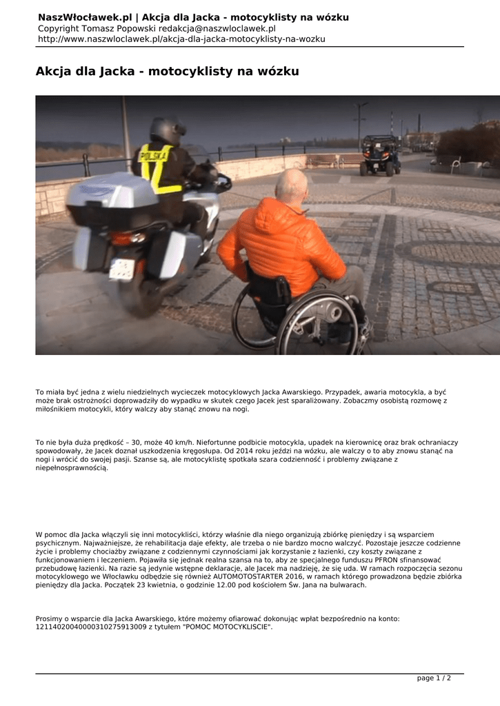 NaszWłocławek.pl | Akcja dla Jacka - motocyklisty na wózku Copyright Tomasz Popowski [email protected] http://www.naszwloclawek.pl/akcja-dla-jacka-motocyklisty-na-wozku Akcja dla Jacka - motocyklisty na wózku To miała być jedna z wielu niedzielnych wycieczek motocyklowych Jacka Awarskiego. Przypadek, awaria motocykla, a być może brak ostrożności doprowadziły do wypadku w skutek czego Jacek jest sparaliżowany. Zobaczmy osobistą rozmowę z miłośnikiem motocykli, który walczy aby stanąć znowu na nogi. To nie była duża prędkość – 30, może 40 km/h. Niefortunne podbicie motocykla, upadek na kierownicę oraz brak ochraniaczy spowodowały, że Jacek doznał uszkodzenia kręgosłupa. Od 2014 roku jeździ na wózku, ale walczy o to aby znowu stanąć na nogi i wrócić do swojej pasji. Szanse są, ale motocyklistę spotkała szara codzienność i problemy związane z niepełnosprawnością. W pomoc dla Jacka włączyli się inni motocykliści, którzy właśnie dla niego organizują zbiórkę pieniędzy i są wsparciem psychicznym. Najważniejsze, że rehabilitacja daje efekty, ale trzeba o nie bardzo mocno walczyć. Pozostaje jeszcze codzienne życie i problemy chociażby związane z codziennymi czynnościami jak korzystanie z łazienki, czy koszty związane z funkcjonowaniem i leczeniem. Pojawiła się jednak realna szansa na to, aby ze specjalnego funduszu PFRON sfinansować przebudowę łazienki. Na razie są jedynie wstępne deklaracje, ale Jacek ma nadzieję, że się uda. W ramach rozpoczęcia sezonu motocyklowego we Włocławku odbędzie się również AUTOMOTOSTARTER 2016, w ramach którego prowadzona będzie zbiórka pieniędzy dla Jacka. Początek 23 kwietnia, o godzinie 12.00 pod kościołem Św. Jana na bulwarach. Prosimy o wsparcie dla Jacka Awarskiego, które możemy ofiarować dokonując wpłat bezpośrednio na konto: 12114020040000310275913009 z tytułem "POMOC MOTOCYKLISCIE". page 1 / 2 NaszWłocławek.pl | Akcja dla Jacka - motocyklisty na wózku Copyright Tomasz Popowski [email protected] http://www.naszwloclawek.pl/akcja-dla-jacka-motocyklisty-na-wozku Przypominamy również, że możemy przekazywać 1% podatku KRS 0000270809 – jako cel proszę wpisać AWARSKI,4305 page 2 / 2