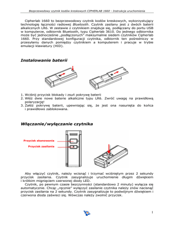 Bezprzewodowy czytnik kodów kreskowych CIPHERLAB 1660 - Instrukcja uruchomienia Cipherlab 1660 to bezprzewodowy czytnik kodów kreskowych, wykorzystujący technologię łączności radiowej Bluetooth. Czytnik zasilany jest z dwóch baterii alkalicznych LR6. W zestawie z czytnikiem znajduje się, podłączany do portu USB w komputerze, odbiornik Bluetooth, typu Cipherlab 3610. Do jednego odbiornika moŜe być jednocześnie „podłączonych” maksymalnie siedem czytników Cipherlab 1660. Przy standardowej konfiguracji czytnika, odbiornik ten pośredniczy w przesyłaniu danych pomiędzy czytnikiem a komputerem i pracuje w trybie emulacji klawiatury (HID). Instalowanie baterii 1. Wciśnij przycisk blokady i zsuń pokrywę baterii 2. WłóŜ dwie nowe baterie alkaliczne typu LR6. Zwróć uwagę na prawidłową polaryzację! 3. ZałóŜ pokrywę baterii, upewniając się, Ŝe jest ona nasunięta do końca i prawidłowo zablokowana. Włączanie/wyłączanie czytnika Przycisk skanowania Przycisk zasilania Aby włączyć czytnik, naleŜy wcisnąć i trzymać wciśniętym przez 2 sekundy przycisk zasilania. Czytnik zasygnalizuje uruchomienie długim dźwiękiem i krótkim mignięciem czerwonej diody LED. Czytnik, po pewnym czasie bezczynności (standardowo 2 minuty) wyłącza się automatycznie. Chcąc „ręcznie” wyłączyć zasilanie czytnika naleŜy znów nacisnąć przycisk zasilania na 2 sekundy. Czytnik zasygnalizuje to podwójnym dźwiękiem i czerwona dioda zaświeci się. Wówczas naleŜy zwolnić przycisk. 1 Bezprzewodowy czytnik kodów kreskowych CIPHERLAB 1660 - Instrukcja uruchomienia Uruchomienie łącza radiowego („parowanie”) Po włączeniu zasilania czytnika, próbuje on nawiązać połączenie odbiornikiem. Jeśli czytnik jest nowy, to naleŜy przeprowadzić jednorazową operacją tzw. „parowania” czytnika z odbiornikiem (tzn. zaprogramowania w czytniku identyfikatora odbiornika, z którym ma on się łączyć). Procedura jest następująca: 1. Odczytać z odbiornika kod kreskowy „SET CONNECTION”. 2. Odczytać z odbiornika kod kreskowy „SERIAL”. 3. Jeśli nie wykonano tego wcześniej, podłączyć odbiornik Cipherlab 3610 do portu USB w komputerze. 4. Potrójny dźwięk i migająca niebieska dioda LED na czytniku oznaczają, Ŝe „parowanie” się powiodło. Zasięg Czytnik będzie przesyłał dane do komputera, jeśli będzie się znajdował w tzw. zasięgu. Nominalny zasięg to 10m, choć w realnych warunkach, m.in. ze względu na zakłócenia sieci radiowych WiFi czy przeszkody (metalowe regały, ściany) realny zasięg moŜe być znacznie mniejszy. Utrata zasięgu jest sygnalizowana przez czytnik potrójnym dźwiękiem (wysoki, średni, niski ton). KaŜdy odczyt kodu, przez czytnik znajdujący się „poza zasięgiem” będzie sygnalizowany podwójnym dźwiękiem (wysoki i niski ton) a dane będą gromadzone w pamięci czytnika. Jeśli czytnik znajdzie się z powrotem w zasięgu, dane zgromadzone w jego pamięci będą automatycznie przesłane do komputera. Przepełnienie pamięci czytnika ( kb) jest sygnalizowane długim dźwiękiem (niski ton) i krótkim mignięciem czerwonej diody LED. W takiej sytuacji trzeba przybliŜyć się do odbiornika (wejść w jego zasięg) by czytnik mógł przesłać dane do komputera. Konfigurowanie czytnika Jak kaŜdy czytnik, równieŜ Cipherlab 1660 jest urządzeniem konfigurowalnym. MoŜna w nim zmieniać wiele róŜnych parametrów, m.in. dotyczących transmisji, poszczególnych rodzajów kodów kreskowych, formatu danych wyjściowych, itp. Szczegółowe informacje na ten temat moŜna znaleźć w oryginalnej angielskojęzycznej instrukcji obsługi/programowania, znajdującej się na płycie CD, dołączonej do czytnika. 2