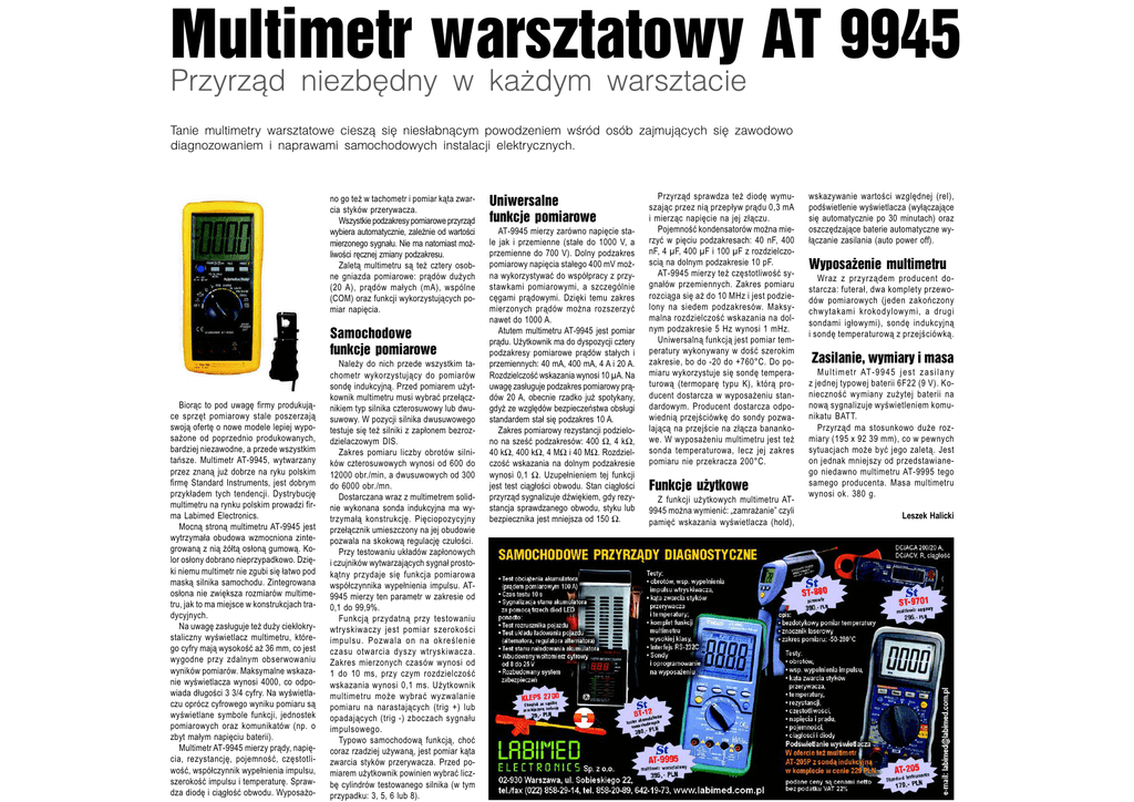 Multimetr warsztatowy AT 9945 Przyrz¹d niezbêdny w ka¿dym warsztacie Tanie multimetry warsztatowe ciesz¹ siê nies³abn¹cym powodzeniem wród osób zajmuj¹cych siê zawodowo diagnozowaniem i naprawami samochodowych instalacji elektrycznych. no go te¿ w tachometr i pomiar k¹ta zwarcia styków przerywacza. Wszystkie podzakresy pomiarowe przyrz¹d wybiera automatycznie, zale¿nie od wartoci mierzonego sygna³u. Nie ma natomiast mo¿liwoci rêcznej zmiany podzakresu. Zalet¹ multimetru s¹ te¿ cztery osobne gniazda pomiarowe: pr¹dów du¿ych (20 A), pr¹dów ma³ych (mA), wspólne (COM) oraz funkcji wykorzystuj¹cych pomiar napiêcia. Samochodowe funkcje pomiarowe Bior¹c to pod uwagê firmy produkuj¹ce sprzêt pomiarowy stale poszerzaj¹ swoj¹ ofertê o nowe modele lepiej wyposa¿one od poprzednio produkowanych, bardziej niezawodne, a przede wszystkim tañsze. Multimetr AT-9945, wytwarzany przez znan¹ ju¿ dobrze na ryku polskim firmê Standard Instruments, jest dobrym przyk³adem tych tendencji. Dystrybucjê multimetru na rynku polskim prowadzi firma Labimed Electronics. Mocn¹ stron¹ multimetru AT-9945 jest wytrzyma³a obudowa wzmocniona zintegrowan¹ z ni¹ ¿ó³t¹ os³on¹ gumow¹. Kolor os³ony dobrano nieprzypadkowo. Dziêki niemu multimetr nie zgubi siê ³atwo pod mask¹ silnika samochodu. Zintegrowana os³ona nie zwiêksza rozmiarów multimetru, jak to ma miejsce w konstrukcjach tradycyjnych. Na uwagê zas³uguje te¿ du¿y ciek³okrystaliczny wywietlacz multimetru, którego cyfry maj¹ wysokoæ a¿ 36 mm, co jest wygodne przy zdalnym obserwowaniu wyników pomiarów. Maksymalne wskazanie wywietlacza wynosi 4000, co odpowiada d³ugoci 3 3/4 cyfry. Na wywietlaczu oprócz cyfrowego wyniku pomiaru s¹ wywietlane symbole funkcji, jednostek pomiarowych oraz komunikatów (np. o zbyt ma³ym napiêciu baterii). Multimetr AT-9945 mierzy pr¹dy, napiêcia, rezystancjê, pojemnoæ, czêstotliwoæ, wspó³czynnik wype³nienia impulsu, szerokoæ impulsu i temperaturê. Sprawdza diodê i ci¹g³oæ obwodu. Wyposa¿o- Nale¿y do nich przede wszystkim tachometr wykorzystuj¹cy do pomiarów sondê indukcyjn¹. Przed pomiarem u¿ytkownik multimetru musi wybraæ prze³¹cznikiem typ silnika czterosuwowy lub dwusuwowy. W pozycji silnika dwusuwowego testuje siê te¿ silniki z zap³onem bezrozdzielaczowym DIS. Zakres pomiaru liczby obrotów silników czterosuwowych wynosi od 600 do 12000 obr./min, a dwusuwowych od 300 do 6000 obr./mn. Dostarczana wraz z multimetrem solidnie wykonana sonda indukcyjna ma wytrzyma³¹ konstrukcjê. Piêciopozycyjny prze³¹cznik umieszczony na jej obudowie pozwala na skokow¹ regulacjê czu³oci. Przy testowaniu uk³adów zap³onowych i czujników wytwarzaj¹cych sygna³ prostok¹tny przydaje siê funkcja pomiarowa wspó³czynnika wype³nienia impulsu. AT9945 mierzy ten parametr w zakresie od 0,1 do 99,9%. Funkcj¹ przydatn¹ przy testowaniu wtryskiwaczy jest pomiar szerokoci impulsu. Pozwala on na okrelenie czasu otwarcia dyszy wtryskiwacza. Zakres mierzonych czasów wynosi od 1 do 10 ms, przy czym rozdzielczoæ wskazania wynosi 0,1 ms. U¿ytkownik multimetru mo¿e wybraæ wyzwalanie pomiaru na narastaj¹cych (trig +) lub opadaj¹cych (trig -) zboczach sygna³u impulsowego. Typowo samochodow¹ funkcj¹, choæ coraz rzadziej u¿ywan¹, jest pomiar k¹ta zwarcia styków przerywacza. Przed pomiarem u¿ytkownik powinien wybraæ liczbê cylindrów testowanego silnika (w tym przypadku: 3, 5, 6 lub 8). Uniwersalne funkcje pomiarowe AT-9945 mierzy zarówno napiêcie stale jak i przemienne (sta³e do 1000 V, a przemienne do 700 V). Dolny podzakres pomiarowy napiêcia sta³ego 400 mV mo¿na wykorzystywaæ do wspó³pracy z przystawkami pomiarowymi, a szczególnie cêgami pr¹dowymi. Dziêki temu zakres mierzonych pr¹dów mo¿na rozszerzyæ nawet do 1000 A. Atutem multimetru AT-9945 jest pomiar pr¹du. U¿ytkownik ma do dyspozycji cztery podzakresy pomiarowe pr¹dów sta³ych i przemiennych: 40 mA, 400 mA, 4 A i 20 A. Rozdzielczoæ wskazania wynosi 10 µA. Na uwagê zas³uguje podzakres pomiarowy pr¹dów 20 A, obecnie rzadko ju¿ spotykany, gdy¿ ze wzglêdów bezpieczeñstwa obs³ugi standardem sta³ siê podzakres 10 A. Zakres pomiarowy rezystancji podzielono na szeæ podzakresów: 400 Ω, 4 kΩ, 40 kΩ, 400 kΩ, 4 MΩ i 40 MΩ. Rozdzielczoæ wskazania na dolnym podzakresie wynosi 0,1 Ω. Uzupe³nieniem tej funkcji jest test ci¹g³oci obwodu. Stan ci¹g³oci przyrz¹d sygnalizuje dwiêkiem, gdy rezystancja sprawdzanego obwodu, styku lub bezpiecznika jest mniejsza od 150 Ω. Przyrz¹d sprawdza te¿ diodê wymuszaj¹c przez ni¹ przep³yw pr¹du 0,3 mA i mierz¹c napiêcie na jej z³¹czu. Pojemnoæ kondensatorów mo¿na mierzyæ w piêciu podzakresach: 40 nF, 400 nF, 4 µF, 400 µF i 100 µF z rozdzielczosci¹ na dolnym podzakresie 10 pF. AT-9945 mierzy te¿ czêstotliwoæ sygna³ów przemiennych. Zakres pomiaru rozci¹ga siê a¿ do 10 MHz i jest podzielony na siedem podzakresów. Maksymalna rozdzielczoæ wskazania na dolnym podzakresie 5 Hz wynosi 1 mHz. Uniwersaln¹ funkcj¹ jest pomiar temperatury wykonywany w doæ szerokim zakresie, bo do -20 do +760°C. Do pomiaru wykorzystuje siê sondê temperaturow¹ (termoparê typu K), któr¹ producent dostarcza w wyposa¿eniu standardowym. Producent dostarcza odpowiedni¹ przejciówkê do sondy pozwalaj¹c¹ na przejcie na z³¹cza banankowe. W wyposa¿eniu multimetru jest te¿ sonda temperaturowa, lecz jej zakres pomiaru nie przekracza 200°C. Funkcje u¿ytkowe Z funkcji u¿ytkowych multimetru AT9945 mo¿na wymieniæ: zamra¿anie czyli pamiêæ wskazania wywietlacza (hold), wskazywanie wartoci wzglêdnej (rel), podwietlenie wywietlacza (wy³¹czaj¹ce siê automatycznie po 30 minutach) oraz oszczêdzaj¹ce baterie automatyczne wy³¹czanie zasilania (auto power off). Wyposa¿enie multimetru Wraz z przyrz¹dem producent dostarcza: futera³, dwa komplety przewodów pomiarowych (jeden zakoñczony chwytakami krokodylowy