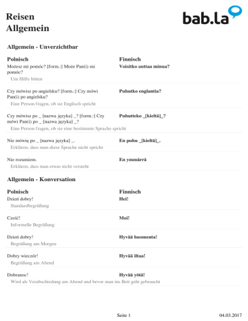 Reisen Allgemein Allgemein - Unverzichtbar Polnisch Finnisch Możesz mi pomóc? [form.:] Może Pan(i) mi pomóc? Um Hilfe bitten Voisitko auttaa minua? Czy mówisz po angielsku? [form.:] Czy mówi Pan(i) po angielsku? Eine Person fragen, ob sie Englisch spricht Puhutko englantia? Czy mówisz po _ [nazwa języka] _? [form.:] Czy Puhutteko _[kieltä]_? mówi Pan(i) po _ [nazwa języka] _? Eine Person fragen, ob sie eine bestimmte Sprache spricht Nie mówię po _ [nazwa języka] _. Erklären, dass man diese Sprache nicht spricht En puhu _[kieltä]_. Nie rozumiem. Erklären, dass man etwas nicht versteht En ymmärrä Allgemein - Konversation Polnisch Finnisch Dzień dobry! Standardbegrüßung Hei! Cześć! Informelle Begrüßung Moi! Dzień dobry! Begrüßung am Morgen Hyvää huomenta! Dobry wieczór! Begrüßung am Abend Hyvää iltaa! Dobranoc! Hyvää yötä! Wird als Verabschiedung am Abend und bevor man ins Bett geht gebraucht Seite 1 04.03.2017 Reisen Allgemein Jak się masz? [form.:] Jak się Pan(i) ma? Mitä kuuluu? Frage nach dem Befinden der Person am Anfang des Gesprächs Dobrze, dziękuję. Hyvää, kiitos kysymästä. Eine höfliche Antwort auf die Frage "Wie geht es Dir?" Jak się nazywasz? [form.:] Jak się Pan(i) nazywa? Eine andere Person nach dem Namen fragen Mikä nimesi on? Nazywam się ___. Einer Person den eigenen Namen sagen Nimeni on ___. Skąd pochodzisz? [form.:] Skąd Pan(i) pochodzi? Fragen, woher jemand kommt Mistä olet kotoisin? Pochodzę z ___. Antworten, woher du kommst Olen ___. Ile masz lat? [form.:] Ile ma Pan(i) lat? Fragen, wie alt jemand ist Kuinka vanha olet? Mam ___ lat(a). Antworten, wie alt du bist Olen __ vuotta vanha. Tak Positive Antwort Kyllä Nie Negative Antwort Ei Proszę Kiitos Höflichkeitsformel zur Unterstreichung einer Aufforderung oder Frage Proszę bardzo! Tässä ole hyvä! Wird gebraucht, wenn eine Person einer anderen etwas gibt Dziękuję. Jemanden danken Kiitos. Seite 2 04.03.2017 Reisen Allgemein Dziękuję bardzo. Kiitos oikein paljon. Wird gebraucht, wenn man jemanden herzlich dankt Proszę bardzo! / Nie ma za co! Höfliche Antwort auf "Danke" Ole hyvä. Przepraszam. Sich für etwas entschuldigen Olen pahoillani. Przepraszam. Um die Aufmerksamkeit von jemanden bitten Anteeksi. Nic się nie stało. Ei se mitään. Auf eine Entschuldigung antworten, falls Du sie akzeptiert hast Nie ma sprawy. Ei haittaa. Auf eine Entschuldigung antworten, falls Du sie akzeptiert hast Uwaga! Jemanden auf eine Gefahr aufmerksam machen Varo! Jestem głodny/-a. Wird gebraucht, wenn man hungrig ist Minulla on nälkä. Chce mi się pić. Wird gebraucht, wenn man durstig ist Minulla on jano. Jestem zmęczony/-a. Wird gebraucht, wenn man müde ist Olen väsynyt Źle się czuję. Wird gebraucht, wenn man krank ist Olen kipeä. Nie wiem. Du weißt die Antwort auf eine Frage nicht En tiedä Miło było cię poznać. [form.:] Miło było Panią/Pana poznać. Höflicher Abschiedssatz nach einem ersten Treffen Oli mukava tavata. Seite 3 04.03.2017 Reisen Allgemein Do widzenia! Sich höflich verabschieden Näkemiin! Allgemein - Beschwerden Polnisch Finnisch Chciał(a)bym złożyć skargę. Haluaisin tehdä valituksen Auf höfliche Art und Weise eine Beschwerde äußern Kto tu rządzi? Herausfinden, wer zuständig ist Kuka täällä on vastuussa? To jest absolutnie niedopuszczalne! Tätä en voi hyväksyä! Nachdrücklich seine Unzufriedenheit zum Ausdruck bringen Żądam zwrotu pieniędzy! Eine Rückerstattung fordern Haluan rahani takaisin! Czekamy ponad godzinę. Sich über lange Wartezeiten beschweren Olemme odottaneet yli tunnin. Allgemein - Fluchen Polnisch Finnisch To jedzenie smakuje jak gówno! Tämä ruoka maistuu ihan paskalta! Auf unhöfliche Art und Weise seine Unzufriedenheit mit dem Essen ausdrücken Ten napój/drink smakuje jak szczyny! Tämä juoma maistuu ihan kuselta! Auf unhöfliche Art und Weise seine Unzufriedenheit über ein Getränk ausdrücken To miejsce to obrzydliwa nora! Tämä paikka on oikea persläpi! Sich auf unhöfliche Art und Weise über einen Ort äußern Ten samochód to wrak! Tämä auto on kauhea romu! Fluchend zum Ausdruck bringen, dass ein Auto in keinem guten Zustand ist Obsługa jest do dupy! Palvelu on täällä ihan perseestä! Auf unhöfliche Art und Weise seine Unzufriedenheit mit dem Service ausdrücken Seite 4 04.03.2017 Reisen Allgemein To jest totalne zdzierstwo! Tämähän on täyttä riistoa! Sich auf unhöfliche Art und Weise über den Preis beschweren Gówno prawda! Älä puhu paskaa! Unglaube über etwas ausdrücken, das jemand gesagt hat Kretyn/Kretynka! Olet idiootti! Eine Person beleidigen indem man ihre/seine Intelligenz kritisiert Gówno wiesz! Sinä et tiedä paskan vertaa! Eine Person beleidigen indem man ihr/sein sein Wissen kritisiert Odwal się! Painu helvettiin! Auf unhöfliche Art und Weise einer Person mitteilen, sofort zu gehen Załatwmy to na zewnątrz! Sovitaan tämä ulkopuolella! Einer Person sagen, außerhalb einer Bar oder Diskothek zu kämpfen Seite 5 Powered by TCPDF (www.tcpdf.org) 04.03.2017