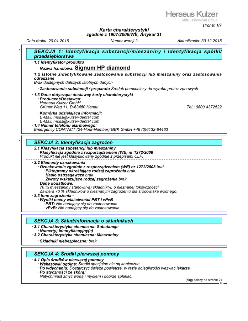 42.0.8 strona: 1/7 Karta charakterystyki zgodnie z 1907/2006/WE, Artykuł 31 Data druku: 20.01.2016 * Numer wersji 2 Aktualizacja: 30.12.2015 SEKCJA 1: Identyfikacja substancji/mieszaniny i identyfikacja spółki/ przedsiębiorstwa · 1.1 Identyfikator produktu · Nazwa handlowa: Signum HP diamond · 1.2 Istotne zidentyfikowane zastosowania substancji lub mieszaniny oraz zastosowania odradzane Brak dostępnych dalszych istotnych danych · Zastosowanie substancji / preparatu Środek pomocniczy do wyrobu protez zębowych · 1.3 Dane dotyczące dostawcy karty charakterystyki · Producent/Dostawca: Heraeus Kulzer GmbH Grüner Weg 11, D-63450 Hanau Tel.: 0800 4372522 · Komórka udzielająca informacji: E-Mail: [email protected] E-Mail: [email protected] · 1.4 Numer telefonu alarmowego: Emergency CONTACT (24-Hour-Number):GBK GmbH +49 (0)6132-84463 * SEKCJA 2: Identyfikacja zagrożeń · 2.1 Klasyfikacja substancji lub mieszaniny · Klasyfikacja zgodnie z rozporządzeniem (WE) nr 1272/2008 Produkt nie jest klasyfikowany zgodnie z przepisami CLP. · 2.2 Elementy oznakowania · Oznakowanie zgodnie z rozporządzeniem (WE) nr 1272/2008 brak · Piktogramy określające rodzaj zagrożenia brak · Hasło ostrzegawcze brak · Zwroty wskazujące rodzaj zagrożenia brak · Dane dodatkowe: 70 % mieszaniny stanowi(-ą) składnik(-i) o nieznanej toksyczności Zawiera 70 % składników o nieznanym zagrożeniu dla środowiska wodnego. · 2.3 Inne zagrożenia · Wyniki oceny właściwości PBT i vPvB · PBT: Nie nadający się do zastosowania. · vPvB: Nie nadający się do zastosowania. SEKCJA 3: Skład/informacja o składnikach · 3.1 Charakterystyka chemiczna: Substancje · Numer(y) identyfikacyjny(e) · 3.2 Charakterystyka chemiczna: Mieszaniny · Składniki niebezpieczne: brak SEKCJA 4: Środki pierwszej pomocy · 4.1 Opis środków pierwszej pomocy · Wskazówki ogólne: Środki specjalne nie są konieczne. · Po wdychaniu: Dostarczyć świeże powietrze, w razie dolegliwości wezwać lekarza. · Po styczności ze skórą: Natychmiast zmyć wodą i mydłem i dobrze spłukać. (ciąg dalszy na stronie 2) PL 42.0.8 Karta charakterystyki strona: 2/7 zgodnie z 1907/2006/WE, Artykuł 31 Data druku: 20.01.2016 Nazwa handlowa: Signum Numer wersji 2 Aktualizacja: 30.12.2015 HP diamond (ciąg dalszy od strony 1) W przypadku trwałego podrażnienia skóry zgłosić się do lekarza. · Po styczności z okiem: Płukać oczy z otwartą powieką przez kilka minut pod bieżącą wodą. W przypadku utrzymującej się dolegliwości zasięgnąć porady lekarza. · Po przełknięciu: Przepłukać jamę ustną i obficie popić wodą. Przy trwałych dolegliwościach porozumieć się z lekarzem. · 4.2 Najważniejsze ostre i opóźnione objawy oraz skutki narażenia Brak dostępnych dalszych istotnych danych · 4.3 Wskazania dotyczące wszelkiej natychmiastowej pomocy lekarskiej i szczególnego postępowania z poszkodowanym Brak dostępnych dalszych istotnych danych * SEKCJA 5: Postępowanie w przypadku pożaru · 5.1 Środki gaśnicze · Przydatne środki gaśnicze: CO2, proszek gaśniczy lub strumień wody. Większy pożar zwalczać strumieniem wody lub pianą odporną na działanie alkoholu. Zabiegi gaszenia ognia dostosować do otoczenia. · 5.2 Szczególne zagrożenia związane z substancją lub mieszaniną Podczas pożaru mogą uwolnić się: Tlenek węgla (CO) · 5.3 Informacje dla straży pożarnej · Specjalne wyposażenie ochronne: Nosić urządzenie ochrony dróg oddechowych niezależnie od powietrza otoczenia. · Inne dane - SEKCJA 6: Postępowanie w przypadku niezamierzonego uwolnienia do środowiska · 6.1 Indywidualne środki ostrożności, sprzęt ochronny i procedury w sytuacjach awaryjnych Nosić ubranie ochronne. Osoby żagrozone przenieść w bezpieczne miejsce. · 6.2 Środki ostrożności w zakresie ochrony środowiska: Szczególne środki nie są konieczne. · 6.3 Metody i materiały zapobiegające rozprzestrzenianiu się skażenia i służące do usuwania skażenia: Zdjąć mechanicznie. Materiał zebrany usunąć w sposób zgodny z przepisami. · 6.4 Odniesienia do innych sekcji Informacje na temat bezpiecznej obsługi patrz rozdział 7. Informacje na temat osobistego wyposażenia ochronnego patrz rozdział 8. - SEKCJA 7: Post ępowanie z substancjami i mieszaninami oraz ich magazynowanie · 7.1 Środki ostrożności dotyczące bezpiecznego postępowania Nosić ubranie ochronne. Osoby żagrozone przenieść w bezpieczne miejsce. (ciąg dalszy na stronie 3) PL 42.0.8 Karta charakterystyki strona: 3/7 zgodnie z 1907/2006/WE, Artykuł 31 Data druku: 20.01.2016 Nazwa handlowa: Signum Numer wersji 2 Aktualizacja: 30.12.2015 HP diamond · Wskazówki dla ochrony przeciwpożarowej i przeciwwybuchowej: Nie są potrzebne szczególne zabiegi. (ciąg dalszy od strony 2) · 7.2 Warunki bezpiecznego magazynowania, w tym informacje dotyczące wszelkich wzajemnych niezgodności · Składowanie: · Wymagania w stosunku do pomieszczeń składowych i zbiorników: Przechowywać tylko w oryginalnych beczkach. · Wskazówki odnośnie wspólnego składowania: Nie konieczne. · Dalsze wskazówki odnośnie warunków składowania: Keep receptacle tightly sealed. Zbiornik przechowywać w dobrze przewietrzanym miejscu. · 7.3 Szczególne zastosowanie(-a) końcowe Brak dostępnych dalszych istotnych danych SEKCJA 8: Kontrola narażenia/środki ochrony indywidualnej · Dodatkowe wskazówki dla wykonania urządzeń technicznych: Brak dalszych danych, patrz punkt 7. · 8.1 Parametry dotyczące kontroli · Składniki wraz z kontrolowanymi wartościami granicznymi zależnymi od miejsca pracy: Produkt nie zawiera znaczących ilości materiałów, których wartości graniczne musiałyby być kontrolowane pod kątem warunków miejsca pracy. · Wskazówki dodatkowe: Podstawą były aktualnie obowiązujące wykazy. · 8.2 Kontrola narażenia · Osobiste wyposażenie ochronne: · Ogólne środki ochrony i higieny: Należy przestrzegać zw