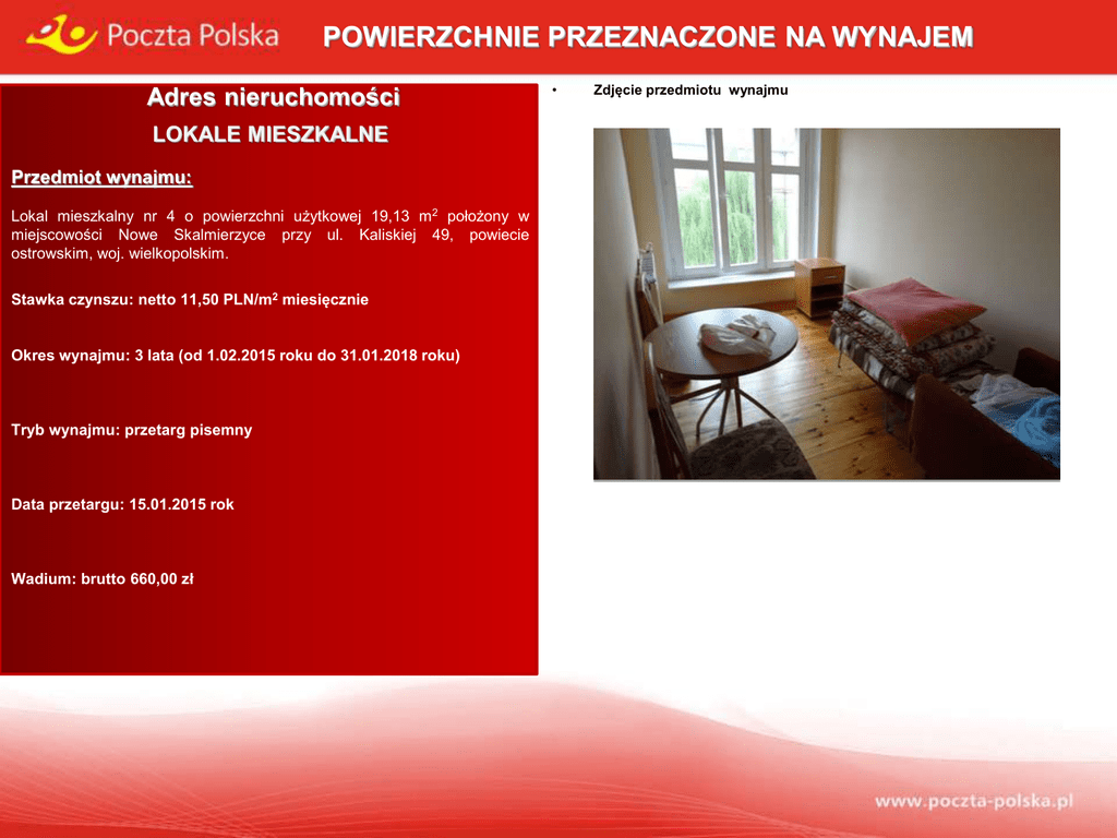 POWIERZCHNIE PRZEZNACZONE NA WYNAJEM Adres nieruchomości LOKALE MIESZKALNE Przedmiot wynajmu: Lokal mieszkalny nr 4 o powierzchni użytkowej 19,13 m2 położony w miejscowości Nowe Skalmierzyce przy ul. Kaliskiej 49, powiecie ostrowskim, woj. wielkopolskim. Stawka czynszu: netto 11,50 PLN/m2 miesięcznie Okres wynajmu: 3 lata (od 1.02.2015 roku do 31.01.2018 roku) Tryb wynajmu: przetarg pisemny Data przetargu: 15.01.2015 rok Wadium: brutto 660,00 zł • Zdjęcie przedmiotu wynajmu Kliknij i zlokalizuj na mapie Opis przedmiotu wynajmu: • Pokój • Toaleta • Wejście do mieszkania Lokal mieszkalny usytuowany jest na II piętrze budynku stanowiącego własność Poczty Polskiej S.A. Składa się z 2 pomieszczeń: pokój o powierzchni 15,80 m², toaleta o powierzchni 3,33 m². Lokal wyposażony jest w instalacje: energetyczną, wodną, kanalizacyjną. System centralnego ogrzewania – własna kotłownia olejowa. Łączna powierzchnia użytkowa lokalu mieszkalnego wynosi – 19,13 m2, na którą składają się 2 pomieszczenia: pokój o powierzchni 15,80 m², toaleta o powierzchni 3,33 m². W pomieszczeniach lokalu zamontowane są grzejniki konwektorowe, płytowe. Stolarka okienna drewniana, oszklenie pełne. Drzwi wejściowe drewniane w stanie dobrym. Podłogi – w pokojach podłoga drewniana, w łazience płytki ceramiczne w stanie dobrym. Otynkowanie ścian i sufitów w stanie dobrym. Lokal wyposażony w instalacje: elektryczną, wodno-kanalizacyjną, centralnego ogrzewania z lokalnej kotłowni olejowej – wszystkie instalacje są sprawne. Lokal wyposażony w podlicznik wodomierzowy i energii elektrycznej. Ogólny stan techniczny określić można jako dobry. Opis nieruchomości: Miejscowość Nowe Skalmierzyce Ulica, nr budynku Kaliska 49 Powierzchnia budynku, w których zlokalizowany jest przedmiot wynajmu 544 Nr działki ewidencyjnej, obręb 116, Nowe Skalmierzyce Księga wieczysta, Sąd Rejonowy, Nr Wydziału KZ1W/00070552/3 prowadzona przez Są Rejonowy w Ostrowie Wielkopolskim Wydział Ksiąg Wieczystych Stan prawny gruntu Użytkowanie wieczyste stanowiące własność Poczty Polskiej S.A. Lokalizacja i dostępność komunikacyjna: Nieruchomość położona jest w Nowych Skalmierzycach, obręb Nowe Skalmierzyce przy ul. Kaliskiej 49 – w centrum miasta – w odległości około 9 km od Kalisza i 12 km od Ostrowa Wielkopolskiego. Od północy działka graniczy z ulicą Kaliską, od zachodu – z ulicą Kaliską, od południa do nieruchomości sąsiedniej oraz budynku gospodarczego. Od strony wschodniej z ogrodem, wzdłuż ulicy kaliskiej dominuje zabudowa zwarta – budynki prywatne i użyteczności publicznej, szkoła, kościół. Miejscowość ma bezpośrednie połączenie z miastem Kaliszem i Ostrowem Wlkp. poprzez komunikację miejską i kolej. • Mapa sytuacyjna miejscowości Opis nieruchomości: Nieruchomość zabudowana jest budynkiem głównym usługowo-mieszkalnych oraz dwoma budynkami gospodarczymi. Na terenie posesji znajduje się ogród oraz z dwóch stron budynku na jego ścianach bocznych trawniki. • Zdjęcia budynków • Zdjęcia nieruchomości OBWIESZCZENIE O PRZETARGU NA NAJEM CZĘŚCI NIERUCHOMOŚCI Wynajmujący: POCZTA POLSKA S.A. z siedzibą w Warszawie, 00-940 Warszawa, ul. Stawki 2. Prowadzący przetarg: Poczta Polska S.A., Pion Infrastruktury Obszar Operacyjny ds. Nieruchomości w Poznaniu ul. Głogowska 17, 60-943 Poznań Miejsce składania ofert: Poczta Polska S.A. Pion Infrastruktury, Obszar Operacyjny ds. Nieruchomości w Poznaniu Dział Administrowania Nieruchomościami i Konserwacji, ul. Zamkowa 18-20, 62-800 Kalisz, pokój nr 7 (wejście od ul. Grodzkiej). Poczta Polska S.A. Pion Infrastruktury Obszar Operacyjny ds. Nieruchomości w Poznaniu ogłasza przetarg pisemny na najem lokalu mieszkalnego o powierzchni użytkowej 19,13 m² zlokalizowanego na II piętrze budynku mieszkalno-usługowego położonego na nieruchomości gruntowej zabudowanej w miejscowości Nowe Skalmierzyce, ul. Kaliska 49, pod działalność nie kolidującą z działalnością i wizerunkiem Poczty Polskiej S.A. Okres trwania umowy - Okres trwania umowy - 3 lata (od 01.02.2015 roku do 31.01.2018 roku). Charakterystyka nieruchomości: Nieruchomość znajduje się w centrum miasta. W sąsiedztwie nieruchomości znajduje się zabudowa usługowo-handlowa, mieszkalna oraz oświatowa. Na parterze budynku znajduje się Urząd Pocztowy Nowe Skalmierzyce. Przedmiot najmu: Łączna powierzchnia użytkowa lokalu mieszkalnego wynosi – 19,13 m2, na którą składają się 2 pomieszczenia: pokój o powierzchni 15,80 m², toaleta o powierzchni 3,33 m². W pomieszczeniach lokalu zamontowane są grzejniki konwektorowe, płytowe. Stolarka okienna drewniana, oszklenie pełne. Drzwi wejściowe drewniane w stanie dobrym. Podłogi – w pokojach podłoga drewniana, w łazience płytki ceramiczne w stanie dobrym. Otynkowanie ścian i sufitów w stanie dobrym. Lokal wyposażony w instalacje: elektryczną, wodno-kanalizacyjną, centralnego ogrzewania z lokalnej kotłowni olejowej – wszystkie instalacje są sprawne. Lokal wyposażony w podlicznik wodomierzowy i energii elektrycznej. Ogólny stan techniczny określić można jako dobry. Wywoławcza stawka czynszu netto: 11,50 PLN/m2 miesięcznie Postąpienia: nie dotyczy Wadium: 660,00 zł (słownie: sześćset sześćdziesiąt złotych) Szczegółowe informacje na temat przetargu i warunków najmu zostały zawarte w projekcie umowy najmu, z którymi można się zapoznać siedzibach Poczta Polska S.A. Pion Infrastruktury, Obszar Operacyjny ds. Nieruchomości w Poznaniu Dział Administrowania Nieruchomościami i Konserwacji, ul. Zamkowa 18-20, 62-800 Kalisz, pokój nr 7 (wejście od ul. Grodzkiej)., tel. 62 76-77-591 lub 76-77-435 w godzinach od 8:00 do 14:00. Termin składania ofert: 15.01.2015 roku do godz. 9:00. Miejsce składania ofert: Poczta Polska S.A. Pion Infrastruktury, Obszar Operacyjny ds. Nieruchomości w Poznaniu Dział Administrow