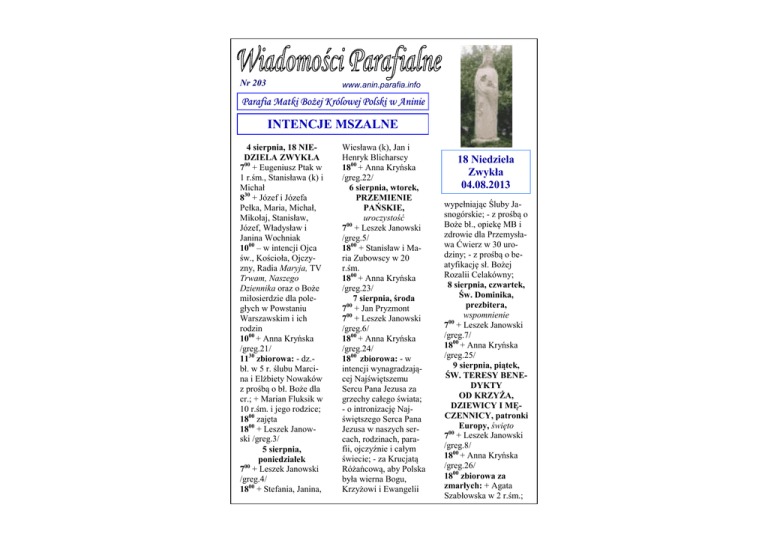 Nr 203 www.anin.parafia.info Parafia Matki BoŜej Królowej Polski w Aninie INTENCJE MSZALNE 4 sierpnia, 18 NIEDZIELA ZWYKŁA 700 + Eugeniusz Ptak w 1 r.śm., Stanisława (k) i Michał 830 + Józef i Józefa Pełka, Maria, Michał, Mikołaj, Stanisław, Józef, Władysław i Janina Wochniak 1000 – w intencji Ojca św., Kościoła, Ojczyzny, Radia Maryja, TV Trwam, Naszego Dziennika oraz o Boże miłosierdzie dla poległych w Powstaniu Warszawskim i ich rodzin 1000 + Anna Kryńska /greg.21/ 1130 zbiorowa: - dz.bł. w 5 r. ślubu Marcina i Elżbiety Nowaków z prośbą o bł. Boże dla cr.; + Marian Fluksik w 10 r.śm. i jego rodzice; 1800 zajęta 1800 + Leszek Janowski /greg.3/ 5 sierpnia, poniedziałek 700 + Leszek Janowski /greg.4/ 1800 + Stefania, Janina, Wiesława (k), Jan i Henryk Blicharscy 1800 + Anna Kryńska /greg.22/ 6 sierpnia, wtorek, PRZEMIENIE PAŃSKIE, uroczystość 700 + Leszek Janowski /greg.5/ 1800 + Stanisław i Maria Zubowscy w 20 r.śm. 1800 + Anna Kryńska /greg.23/ 7 sierpnia, środa 700 + Jan Pryzmont 700 + Leszek Janowski /greg.6/ 1800 + Anna Kryńska /greg.24/ 1800 zbiorowa: - w intencji wynagradzającej Najświętszemu Sercu Pana Jezusa za grzechy całego świata; - o intronizację Najświętszego Serca Pana Jezusa w naszych sercach, rodzinach, parafii, ojczyźnie i całym świecie; - za Krucjatą Różańcową, aby Polska była wierna Bogu, Krzyżowi i Ewangelii 18 Niedziela Zwykła 04.08.2013 wypełniając Śluby Jasnogórskie; - z prośbą o Boże bł., opiekę MB i zdrowie dla Przemysława Ćwierz w 30 urodziny; - z prośbą o beatyfikację sł. Bożej Rozalii Celakówny; 8 sierpnia, czwartek, Św. Dominika, prezbitera, wspomnienie 700 + Leszek Janowski /greg.7/ 1800 + Anna Kryńska /greg.25/ 9 sierpnia, piątek, ŚW. TERESY BENEDYKTY OD KRZYŻA, DZIEWICY I MĘCZENNICY, patronki Europy, święto 700 + Leszek Janowski /greg.8/ 1800 + Anna Kryńska /greg.26/ 1800 zbiorowa za zmarłych: + Agata Szabłowska w 2 r.śm.; Liturgia Słowa Bożego Koh 1,2;2,21-23 Słysząc głos Pana, serc nie zatwardzajcie Kol 3,1-5.9-11 Łk 12,13-21 Ktoś z tłumu rzekł do Jezusa: Nauczycielu, powiedz mojemu bratu, żeby się podzielił ze mną spadkiem. Lecz On mu odpowiedział: Człowieku, któż Mię ustanowił sędzią albo rozjemcą nad wami? Powiedział też do nich: Uważajcie i strzeżcie się wszelkiej chciwości, bo nawet gdy ktoś opływa [we wszystko], życie jego nie jest zależne od jego mienia. I opowiedział im przypowieść: Pewnemu zamożnemu człowiekowi dobrze obrodziło pole. I rozważał sam w sobie: Co tu począć? Nie mam gdzie pomieścić moich zbiorów. I rzekł: Tak zrobię: zburzę moje spichlerze, a pobuduję większe i tam zgromadzę całe zboże i moje dobra. I powiem sobie: Masz wielkie zasoby dóbr, na długie lata złożone; odpoczywaj, jedz, pij i używaj! Lecz Bóg rzekł do niego: Głupcze, jeszcze tej nocy zażądają twojej duszy od ciebie; komu więc przypadnie to, coś przygotował? Tak dzieje się z każdym, kto skarby gromadzi dla siebie, a nie jest bogaty przed Bogiem. Ogłoszenia na 18 Niedzielę Zwykłą 04.08.2013 r. • Wszystkich sierpniowych pielgrzymów zmierzających z różnych miejsc Polski do sanktuariów maryjnych polecamy wspólnym modlitwom wiernych. • Wszystkim wyjeżdżającym na wakacje chcemy życzyć pomyślnego wypoczynku i radosnego odkrywania obecności Boga w przyrodzie i czasie wolnym. Jednocześnie przypominamy o obowiązku uczestniczenia w niedzielnej mszy św. i uczulamy na godny strój w czasie obecności w świątyni. • Z racji też na sierpień weźmy sobie do serca słowa Apelu Trzeźwości. • W najbliższy wtorek - 06.08 - uroczystość Przemienienia Pańskiego, a w piątek 09.07 - święto Św. Teresy Benedykty od Krzyża - patronki Europy. Msze św. w tych dniach o godz. 7.00 i 18.00. • W najbliższe niedziele 11 i 18 sierpnia Parafialny Caritas organizuje zbiórkę artykułów i przyborów szkolnych dla dzieci potrzebujących wsparcia z naszej Parafii. Do kosza wystawionego przy wejściu do kościoła można też włożyć szampon lub inny środek czystości. Dziękujemy za okazaną pomoc w rozpoczynającym się Nowym Roku Szkolnym. • Na zakończenie Roku Wiary, który ogłosił Ojciec Święty nasza parafia organizuje w dniach 5-12 października pielgrzymkę do Ziemi Św. i Jordanii. Bliższe informacje można znaleźć na ulotce na stolikach przy wyjściu z kościoła. Zapisy na pielgrzymkę rozpoczną się od połowy sierpnia. Zmysłowa miłość Stwórcy Najbardziej drogocenne prezenty jakie dajemy ludziom szczególnie przez nas kochanym, odbijają w sobie blask naszej twórczości, są bardzo osobiste: ręcznie zrobiona papeteria, namalowany obrazek. Prezenty kupowane w sklepie mogą być również bardzo osobiste, jeśli tylko są znakiem naszej uważności na obdarowywanego, na jego pragnienia, marzenia, z którymi się nie obnosi, lecz może je uchwycić spostrzegawcze serce. Rzeczy więc mają w sobie pojemność na miłość, mogą stawać się wyrazami miłości. Gdy Bóg stwarza wszechświat – daje wyraz swojej miłości do człowieka. Stworzenie jest przeniknięte miłością Boga. Nie taką jednak miłością, która dokonała stworzenia kiedyś, u zarania dziejów, lecz miłością świeżą, na dziś, na ten moment, na tu i teraz. Słońce nie jest lampą kiedyś zapaloną przez Boga – jego jasność i siła jest budzona i podtrzymywana przez Niego nieprzerwanie. Tak bliska św. Tomaszowi prawda o tym, że stworzenie dokonuje się aktualnie, oznacza stale odnawianą zmysłową miłość do nas. Bóg nie jest rodzicem, którego czułe gesty dziecko musi nieustannie wydobywać z mroków przeszłości. Nie jest oddalonym kochankiem, którego pieszczoty są tylko nostalgicznym wspomnieniem. Nasz Stwórca dziś, tu i teraz gładzi moją twarz podmuchem wiatru, głaszcze nim moje włosy; deszczem łaskocze moje policzki, a ciepłem słońca pieści moją skórę. Światłem, kt