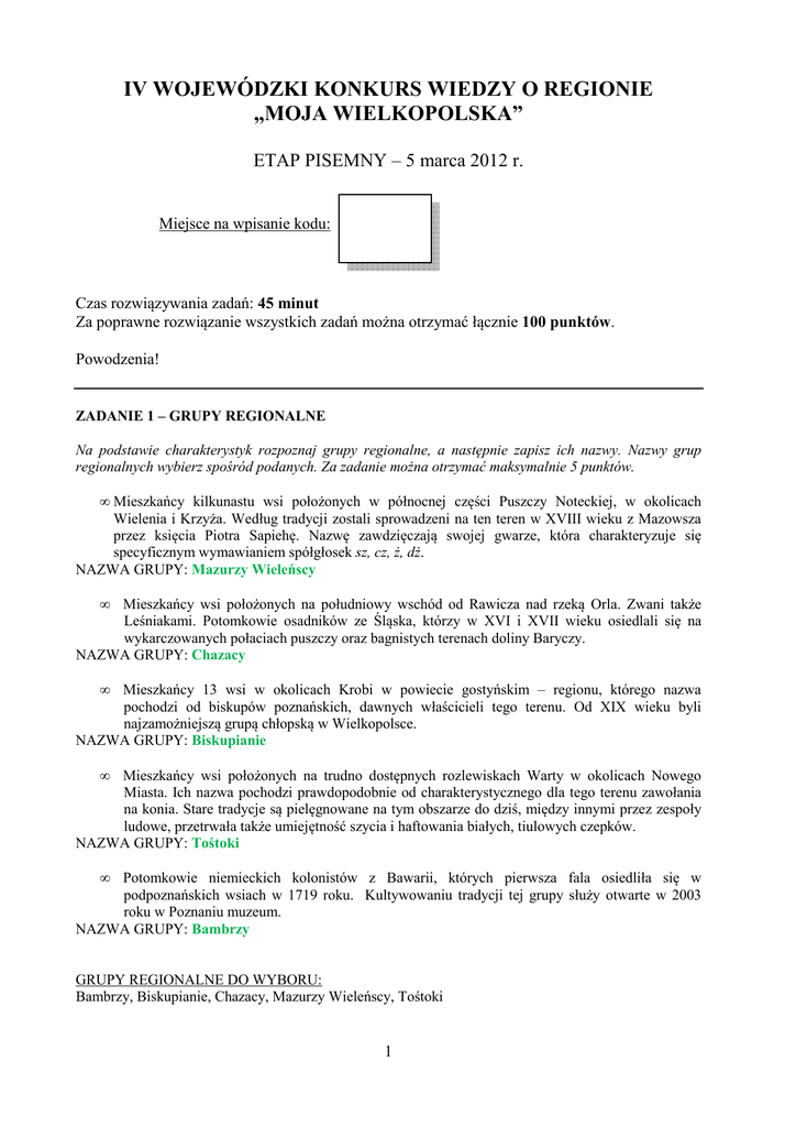 IV WOJEWÓDZKI KONKURS WIEDZY O REGIONIE „MOJA WIELKOPOLSKA” ETAP PISEMNY – 5 marca 2012 r. Miejsce na wpisanie kodu: Czas rozwiązywania zadań: 45 minut Za poprawne rozwiązanie wszystkich zadań można otrzymać łącznie 100 punktów. Powodzenia! ZADANIE 1 – GRUPY REGIONALNE Na podstawie charakterystyk rozpoznaj grupy regionalne, a następnie zapisz ich nazwy. Nazwy grup regionalnych wybierz spośród podanych. Za zadanie można otrzymać maksymalnie 5 punktów. • Mieszkańcy kilkunastu wsi położonych w północnej części Puszczy Noteckiej, w okolicach Wielenia i Krzyża. Według tradycji zostali sprowadzeni na ten teren w XVIII wieku z Mazowsza przez księcia Piotra Sapiehę. Nazwę zawdzięczają swojej gwarze, która charakteryzuje się specyficznym wymawianiem spółgłosek sz, cz, ż, dż. NAZWA GRUPY: Mazurzy Wieleńscy • Mieszkańcy wsi położonych na południowy wschód od Rawicza nad rzeką Orla. Zwani także Leśniakami. Potomkowie osadników ze Śląska, którzy w XVI i XVII wieku osiedlali się na wykarczowanych połaciach puszczy oraz bagnistych terenach doliny Baryczy. NAZWA GRUPY: Chazacy • Mieszkańcy 13 wsi w okolicach Krobi w powiecie gostyńskim – regionu, którego nazwa pochodzi od biskupów poznańskich, dawnych właścicieli tego terenu. Od XIX wieku byli najzamożniejszą grupą chłopską w Wielkopolsce. NAZWA GRUPY: Biskupianie • Mieszkańcy wsi położonych na trudno dostępnych rozlewiskach Warty w okolicach Nowego Miasta. Ich nazwa pochodzi prawdopodobnie od charakterystycznego dla tego terenu zawołania na konia. Stare tradycje są pielęgnowane na tym obszarze do dziś, między innymi przez zespoły ludowe, przetrwała także umiejętność szycia i haftowania białych, tiulowych czepków. NAZWA GRUPY: Tośtoki • Potomkowie niemieckich kolonistów z Bawarii, których pierwsza fala osiedliła się w podpoznańskich wsiach w 1719 roku. Kultywowaniu tradycji tej grupy służy otwarte w 2003 roku w Poznaniu muzeum. NAZWA GRUPY: Bambrzy GRUPY REGIONALNE DO WYBORU: Bambrzy, Biskupianie, Chazacy, Mazurzy Wieleńscy, Tośtoki 1 ZADANIE 2 – ATRAKCJE PRZYRODNICZE Uzupełnij tabelę, wpisując obok atrakcji przyrodniczej nazwę miejscowości, w której się ona znajduje. Miejscowości wybierz spośród podanych (uwaga: jedna z miejscowości nie jest związana z żadną z wymienionych atrakcji przyrodniczych). Za zadanie można otrzymać maksymalnie 5 punktów. Atrakcja przyrodnicza Arboretum Polskiej Akademii Nauk Stacja doświadczalna prowadząca hodowlę wilków Palmiarnia Skrzyżowanie rzek Wełny i Nielby Zagroda żubrów Miejscowość Kórnik Stobnica Poznań Wągrowiec Gołuchów MIEJSCOWOŚCI DO WYBORU: Gołuchów, Kórnik, Międzychód, Poznań, Stobnica, Wągrowiec ZADANIE 3 – RZEKI Część I Na mapie oznaczono literami od A do F wybrane rzeki przepływające przez Wielkopolskę. Uzupełnij tabelę, wpisując obok oznaczeń literowych nazwy rzek. Nazwy rzek wybierz spośród podanych na końcu zadania (uwaga: jedna z wymienionych rzek nie została zaznaczona na mapie). Za tę część zadania można otrzymać maksymalnie 6 punktów. Litera A B C Nazwa rzeki Noteć Gwda Wełna Litera D E F 2 Nazwa rzeki Warta Prosna Obra Część II Uzupełnij tabelę, wpisując obok nazwy miejscowość nazwę rzeki (lub w jednym przypadku dwóch rzek!), która przez nią przepływa. Nazwy rzek wybierz spośród podanych na końcu zadania (uwaga: jedna z wymienionych rzek nie przepływa przez żadną z podanych miejscowości; pozostałe rzeki mogą się powtarzać). Za tę część zadania można otrzymać maksymalnie 10 punktów. Rzeka Noteć Prosna Warta Obra Warta Warta i Wełna Gwda Warta Wełna Miejscowość Czarnków Kalisz Konin Kościan Międzychód Oborniki Piła Śrem Wągrowiec RZEKI DO WYBORU: Gwda, Noteć, Obra, Prosna, Warta, Wełna, Wrześnica ZADANIE 4 – STYLE ARCHITEKTONICZNE Przyporządkuj każdemu z wymienionych styli architektonicznych dwa budynki, które go reprezentują. Uzupełnij tabelę, wpisując obok nazwy stylu oznaczenia literowe odpowiadające wybranym obiektom. Za zadanie można otrzymać maksymalnie 10 punktów. Styl architektoniczny Oznaczenie literowe budynku Romański C D Gotycki A G Renesansowy B I Barokowy H J Klasycystyczny E F A – Baszta Halszki w Szamotułach B – Kościół farny pw. św. Jadwigi w Grodzisku Wielkopolskim C – Kościół pw. św. Jana Jerozolimskiego w Poznaniu D – Kościół pw. Świętej Trójcy w Strzelnie E – Pałac Jabłonowskich w Racocie F – Pałac Węsierskich w Objezierzu G – Pobernardyński zespół klasztorny w Kazimierzu Biskupim H – Pocysterski kościół pw. NMP i św. Mikołaja w Lądzie nad Wartą I – Ratusz w Poznaniu J – Zamek w Rydzynie 3 ZADANIE 5 – KRZYŻÓWKA Rozwiąż krzyżówkę, a następnie odpowiedz na pytanie dotyczące hasła głównego utworzonego przez litery w wyróżnionych kratkach. Za zadanie można otrzymać maksymalnie 14 punktów. P 1 I 2 A S T O W S K ó R N I K L O T N 3 4 D O 7 N O I S K O I T K A D R A W I E Ń S K S Z Y M B O R S K A W O W I E J S K I P E G A Z N O T E C K E N I G M A I A Z D O R 8 9 10 11 I O R 5 6 K G W A (1) Nazwa szlaku przebiegającego m.in. przez Poznań, Gniezno, Kruszwicę i Biskupin. (2) Wielkopolska miejscowość z zamkiem i Białą Damą. (3) Wojskowe w Powidzu i poznańskich Krzesinach. (4) Popularna nazwa ceglanej baszty w Kaliszu, z którą związana jest legenda. (5) Nazwa parku narodowego tylko częściowo położonego w granicach województwa wielkopolskiego. (6) Nazwisko urodzonej w 1923 roku w Bninie (obecnie część Kórnika) noblistki. (7) Nazwisko kompozytora „Roty”. (8) Usadowił się na dachu poznańskiej opery. (9) Puszcza rozciągająca się od Skwierzyny i Santoka na zachodzie po Oborniki i Rogoźno na wschodzie. (10) Nazwa maszyny szyfrującej, której szyfr złamali Marian Rejewski, Jerzy Różycki i Henryk Zygalski. (11) Zostawia w Wielkopolsce prezenty pod choinką. HAS