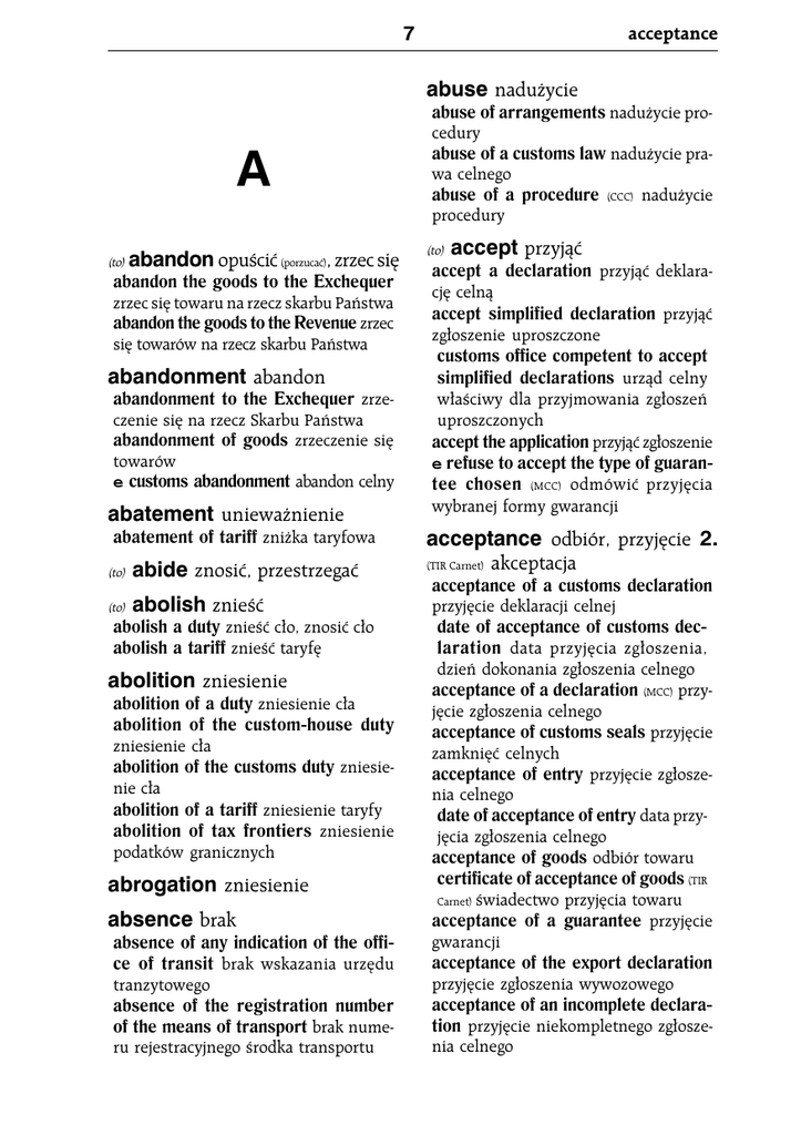 acceptance 7 abuse nadużycie A (to) abandon opuścić (porzucać), zrzec się abandon the goods to the Exchequer zrzec się towaru na rzecz skarbu Państwa abandon the goods to the Revenue zrzec się towarów na rzecz skarbu Państwa abandonment abandon abandonment to the Exchequer zrzeczenie się na rzecz Skarbu Państwa abandonment of goods zrzeczenie się towarów e customs abandonment abandon celny abatement unieważnienie abatement of tariff zniżka taryfowa (to) abide znosić, przestrzegać (to) abolish znieść abolish a duty znieść cło, znosić cło abolish a tariff znieść taryfę abolition zniesienie abolition of a duty zniesienie cła abolition of the custom-house duty zniesienie cła abolition of the customs duty zniesienie cła abolition of a tariff zniesienie taryfy abolition of tax frontiers zniesienie podatków granicznych abrogation zniesienie absence brak absence of any indication of the office of transit brak wskazania urzędu tranzytowego absence of the registration number of the means of transport brak numeru rejestracyjnego środka transportu abuse of arrangements nadużycie procedury abuse of a customs law nadużycie prawa celnego abuse of a procedure (CCC) nadużycie procedury (to) accept przyjąć accept a declaration przyjąć deklarację celną accept simplified declaration przyjąć zgłoszenie uproszczone customs office competent to accept simplified declarations urząd celny właściwy dla przyjmowania zgłoszeń uproszczonych accept the application przyjąć zgłoszenie e refuse to accept the type of guarantee chosen (MCC) odmówić przyjęcia wybranej formy gwarancji acceptance odbiór, przyjęcie 2. (TIR Carnet) akceptacja acceptance of a customs declaration przyjęcie deklaracji celnej date of acceptance of customs declaration data przyjęcia zgłoszenia, dzień dokonania zgłoszenia celnego acceptance of a declaration (MCC) przyjęcie zgłoszenia celnego acceptance of customs seals przyjęcie zamknięć celnych acceptance of entry przyjęcie zgłoszenia celnego date of acceptance of entry data przyjęcia zgłoszenia celnego acceptance of goods odbiór towaru certificate of acceptance of goods (TIR Carnet) świadectwo przyjęcia towaru acceptance of a guarantee przyjęcie gwarancji acceptance of the export declaration przyjęcie zgłoszenia wywozowego acceptance of an incomplete declaration przyjęcie niekompletnego zgłoszenia celnego 8 accepted acceptance of the re-export notification (MCC) przyjęcie powiadomienia o powrotnym wywozie acceptance of TIR Carnet przyjęcie Karnetu TIR falsification acceptance of TIR Carnet fałszowanie karnetów TIR acceptance of the transit declaration przyjęcie zgłoszenia tranzytowego (to) accepted przyjęty accepted by the customs office at … (TIR Carnet) przyjęty przez urząd celny w …. accepted customs-approved treatment or use zatwierdzone przeznaczenie celne accepted for transport under customs seals przyjęty do transportu pod zamknięciem celnym access dostęp access to the TIR procedure prawo do korzystania z procedury TIR e Authorization for access to the TIR Pozwolenie na korzystanie z procedury TIR accessories akcesoria accessories of the container akcesoria kontenera accessories and equipment of the container akcesoria i wyposażenie kontenera accessory dodatkowy accessory charges opłaty dodatkowe accident wypadek place of the accident wypadku administrative accompanying document (ADD) towarzyszący dokument urzędowy authenticity of the accompanying documents autentyczność załączonych dokumentów transit accompanying document (TAD) tranzytowy dokument towarzyszący (TAD) (TIR Carnet) miejsce accompanied towarzyszący accompanied baggage bagaż towarzyszący passengers' accompanied baggage bagaż towarzyszący pasażerom accompanying załączony accompanying document dokument załączony, dokument towarzyszący accomplish dopełnić accomplish a formalities dopełnić formalności accomplishment dopełnienie accomplishment of formalities dopełnienie formalności (to) accord przyznać accord an concession przyznać ulgę account bilans, rachunek 2. zaksięgowanie account number numer rachunku bank account number numer konta bankowego e bank account rachunek bankowy duty for consignee's account cło na rachunek wysyłającego entry in the accounts zaksięgowanie customs office of entry in the accounts urząd celny zaksięgowania time of entry in the accounts (MCC) termin zaksięgowania entry in the accounts of the amount of duty (MCC) zaksięgowanie kwoty należności celnej entry in the accounts of import duties zaksięgowanie należności celnych decide on entry in the accounts of import duties decyzja o zaksięgowaniu należności celnych entry of the duties in the accounts (import or export duties) zaksięgowanie należności celnych office of entry in the accounts urząd celny zaksięgowania proforma account rachunek pro forma 9 receiver's account rachunek odbiorcy duty for receiver's account cło na rachunek odbiorcy remission on account of error by the customs authorities (MCC) umorzenie z powodu błędu popełnionego przez organy celne repayment on account of error by the customs authorities (MCC) zwrot z powodu błędu popełnionego przez organy celne accounting księgowy accounting documents dokumenty księgowe accuracy prawdziwość, dokładność accuracy of the information given in the declaration prawdziwość informacji podanych w zgłoszeniu acknowledge potwierdzać acknowledge the receipt potwierdzać otrzymanie acknowledgment potwierdzenie acknowledgement of receipt powiadomienie o odbiorze e partial acknowledgement uznanie częściowe lack of acknowledgment brak potwierdzenia take acknowledgment uzyskać potwierdzenie (to) acquire nabywać acquire goods nabywać towary acquisition nabycie acquisition of goods nabycie towarów intra-community acquisition of goods wewnątrzwspólnotowe nabycie towarów acquisition of origin (MCC) nabywanie pochodzenia governing acquisition of