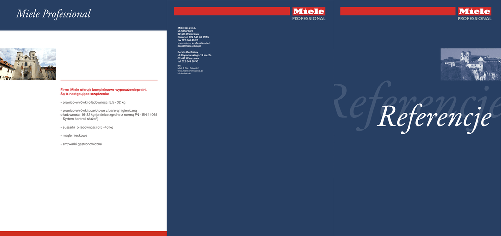 Miele Professional Miele Sp. z o.o. ul. Gotarda 9 02-683 Warszawa Biuro tel. 022 548 40 11/15 fax 022 548 40 20 www.miele-professional.pl [email protected] Serwis Centralny ul. Rzymowskiego 19 lok. 2a 02-697 Warszawa tel. 022 543 36 30 (D) Miele & Cie., Gütersloh www.miele-professional.de [email protected] Firma Miele oferuje kompleksowe wyposażenie pralni. Są to następujące urządzenia: - pralnico-wirówki o ładowności 5,5 - 32 kg - pralnico-wirówki przelotowe z barierą higieniczną o ładowności 16-32 kg (pralnice zgodne z normą PN - EN 14065 - System kontroli skażeń) - suszarki o ładowności 6,5 -40 kg - magle nieckowe - zmywarki gastronomiczne Referencje Referencje Zakład Opiekuńczo – Leczniczy Ojców Kamilianów w Hutkach Ul. Jurajska 36 32-329 Bolesław Referencje Hutki, 22.04.2010 Zakład Opiekuńczo – Leczniczy Ojców Kamilianów w Hutkach od wielu lat współpracuje z firmą Miele Professional. Z biegiem lat sukcesywnie wymieniany jest sprzęt pralniczy w naszej zakładowej pralni. Jesteśmy bardzo zadowoleni z doskonałej współpracy z firmą Miele Professional. W czasie wprowadzania nowych maszyn personel na nich pracujący jest odpowiednio szkolony w obsłudze nowych urządzeń a w czasie ich użytkowania serwis firmy Miele przyjeżdża na każde wezwanie, udzielając fachowych porad. Urządzenia jakie posiadamy to sprzęt profesjonalny, spełniający wszystkie wymagane warunki i nasze oczekiwania. Polecamy wszystkim urządzenia i usługi firmy Miele Professional z uwagi na dobry sprzęt i fachową obsługę serwisową. Dyrektor O. Józef Chomik Dom Pomocy Społecznej Kurozwęki ul. Kościelna 4 28-200 Staszów Kurozwęki, 20.04.2010 Dom Pomocy Społecznej w Kurozwękach, ul. Kościelna 4, 28-200 Staszów prowadzący dzieło dla osób starszych i przewlekle somatycznie chorych, niniejszym zaświadcza, że od wielu lat współpracujemy z firmą Miele zaopatrując się w różne ich artykuły – m.in. pralnice małe i duże, suszarki... Do tej pory współpraca układała się dobrze, firma zawsze była obowiązkowa, terminowa. Możemy polecić osobom i firmom, którzy planują zakup podobnego sprzętu. Z poszanowaniem S. Halina Romanowska na zdjęciu: Opactwo Benedyktynów w Tyńcu Z urządzeń Miele korzystają również: „BENEDICITE” Jednostka Gospodarcza Opactwa Benedyktynów w Tyńcu Ul. Benedyktyńska 37 30-398 Kraków Zgromadzenie Sióstr św. Jadwigi Prowincja Wrocławska Specjalny ośrodek Wychowawczy im. Ks. L. Markiefki prowadzony przez Zgromadzenie Sióstr św. Jadwigi w Katowicach Dom Pomocy Społecznej dla Dorosłych Niepełnosprawnych Intelektualnie w Siemianowicach Śląskich Zespół Działu Miele Professional Klasztor o. Benedyktynów w Tyńcu posiada pralnię wyposażoną w profesjonalne maszyny pralnicze firmy MieleProffesional. Urządzenia tej firmy to sprzęt wysokiej jakości, spełniający wszystkie wymagane warunki i nasze oczekiwania. Polecamy wszystkim urządzenia i usługi firmy Miele Proffesional z uwagi na niezawodność jak i fachową obsługę serwisową. Piotr Fugiel Wicedyrektor Dom Pomocy Społecznej prowadzony przez Zakon Kamilianów w Zabrzu ul. Cisowa 5 Zabrze 14.05.2010 Szczęść Boże! Dom Pomocy Społecznej prowadzony przez Zakon Kamilianów w Zabrzu przy ul. Cisowej 5 potwierdza, iż od 13 lat (tj. Od 1997 roku) korzysta z urządzeń firmy Miele. Te urządzenia to termodezynfekatory do mycia naczyń, profesjonalne pralnice, maglownica i suszarka. Bardzo jesteśmy zadowoleni z tych urządzeń, ale niezbędnym w korzystaniu z w/w urządzeń jest bardzo dobra współpraca z firmą Eltar, której właściciel i wszyscy pracownicy służą nam niezbędną pomocą, doradą i wsparciem technicznym, za co szczególnie wyrażamy im naszą wdzięczność. Nasza współpraca jest modelowa w takiego rodzaju działaniach. Piękne Bóg zapłać! Dom Pomocy Społecznej prowadzony przez Zgromadzenie Sióstr św. Jadwigi w Czarnowąsach Za przesłane referencje serdecznie dziękujemy. 19.05.2010 O. Andrzej Chorążykiewicz Dyrektor Domu Zakład Opiekuńczo-Leczniczy prowadzony przez Zgromadzenie Sióstr Miłosierdzia św. Karola Boromeusza 41-940 Piekary Śląskie ul. ks. J. Ficka Piekary Śląskie, 18.05.2010 Mamy okazję współpracować z firmą Miele od dłuższego czasu. Jesteśmy zadowoleni ze współpracy z nimi. Profesjonalne podejście, szybka realizacja zleceń. Chcielibyśmy dodać, że oprócz fachowości i kompetencji firmę wyróżnia otwarty i serdeczny stosunek do klienta. Gorąco polecamy. Mgr Lucyna Suchodolska Dyrektor
