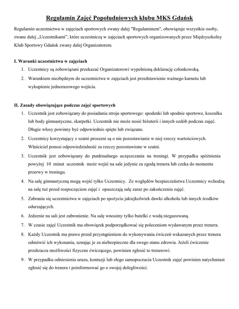 Regulamin Zajęć Popołudniowych klubu MKS Gdańsk Regulamin uczestnictwa w zajęciach sportowych zwany dalej "Regulaminem", obowiązuje wszystkie osoby, zwane dalej „Uczestnikami”, które uczestniczą w zajęciach sportowych organizowanych przez Międzyszkolny Klub Sportowy Gdańsk zwany dalej Organizatorem. I. Warunki uczestnictwa w zajęciach 1. Uczestnicy są zobowiązani przekazać Organizatorowi wypełnioną deklarację członkowską. 2. Warunkiem niezbędnym do uczestnictwa w zajęciach jest przedstawienie ważnego karnetu lub wykupienie jednorazowego wejścia. II. Zasady obowiązujące podczas zajęć sportowych 1. Uczestnik jest zobowiązany do posiadania stroju sportowego: spodenki lub spodnie sportowe, koszulka lub body gimnastyczne, skarpetki. Uczestnik nie może nosić biżuterii i innych ozdób podczas zajęć. Długie włosy powinny być odpowiednio spięte lub związane. 2. Uczestnicy korzystający z szatni proszeni są o nie pozostawianie w niej rzeczy wartościowych. Właściciel ponosi odpowiedzialność za rzeczy pozostawione w szatni. 3. Uczestnik jest zobowiązany do punktualnego uczęszczania na treningi. W przypadku spóźnienia powyżej 10 minut uczestnik może wejść na sale jedynie za zgodą trenera lub czeka do momentu przerwy w treningu. 4. Na salę gimnastyczną mogą wejść tylko Uczestnicy. Ze względów bezpieczeństwa Uczestnicy wchodzą na salę tuż przed rozpoczęciem zajęć i opuszczają salę zaraz po zakończeniu zajęć. 5. Zabrania się uczestnictwa w zajęciach po spożyciu jakiejkolwiek dawki alkoholu lub innych środków odurzających. 6. Jedzenie na sali jest zabronienie. Na salę wnosimy tylko butelki z wodą niegazowaną. 7. W czasie zajęć Uczestnik ma obowiązek podporządkować się poleceniom wydawanym przez trenera. 8. Każdy Uczestnik ma prawo przed przystąpieniem do wykonywania ćwiczeń wskazanych przez trenera odmówić ich wykonania, uznając je za niebezpieczne dla swego stanu zdrowia. Jeżeli ćwiczenie przekracza możliwości fizyczne ćwiczącego, powinien zgłosić to trenerowi. 9. W przypadku odniesienia urazu, kontuzji lub złego samopoczucia Uczestnik zajęć powinien natychmiast zgłosić się do trenera i poinformować go o swojej dolegliwości. 10. Organizator nie ponosi odpowiedzialności za ewentualne negatywne następstwa dla zdrowia Uczestnika wynikające z uczestnictwa w wykonywaniu ćwiczeń w czasie zajęć sportowych organizowanych zgodnie z wszelkimi zasadami sportowymi. 11. W razie niewłaściwego zachowania Uczestnika zajęć, w tym zachowania zagrażającego zdrowiu, życiu, bezpieczeństwu swojemu i innych uczestników lub zachowania dezorganizujące i utrudniające prowadzenie zajęć dla grupy, prowadzący zajęcia ma prawo do wyciągnięcia wobec niego konsekwencji obejmujących wykluczenie z wykonywania wybranych przez trenera ćwiczeń, zakaz uczestnictwa w danym treningu aż do usunięcia z zajęć włącznie. W takim przypadku nie przysługuje Uczestnikowi zwrot kosztów, jeśli usuniecie uczestnika z zajęć nastąpiło z jego winy. 12. Uczestnika obowiązuje dbałość o dobry stan urządzeń, udostępnianego sprzętu sportowego oraz miejsca treningowego. Za wszelkie szkody powstałe z winy Uczestnika ponosi on odpowiedzialność finansową, a w przypadku osób niepełnoletnich jego rodzice lub opiekun prawny. 13. Uczestnik ma prawo do udziału w zawodach organizowanych przez Organizatora. 14. Uczestnik ma prawo do odrobienia zajęć w innym terminie niż wskazuje na to zakupiony przez niego karnet, jeżeli pozwala na to liczebność grupy danego dnia. 15. Przed i po zajęciach odpowiedzialność za nieletnich w pełni ponoszą rodzice (opiekunowie). 16. Organizator zastrzega sobie prawo do odwołania zajęć III. Postanowienia końcowe 1. Organizator zastrzega sobie prawo do ostatecznej interpretacji regulaminu. 2. Wszystkie kwestie sporne nieujęte w niniejszym regulaminie rozstrzyga Organizator. 3. Organizator zastrzega sobie prawo do zmiany niniejszego regulaminu. 4. Organizator każdorazowo poinformuje uczestników o zmianie regulaminu przez zamieszczenie jego nowej wersji na stronie internetowej.