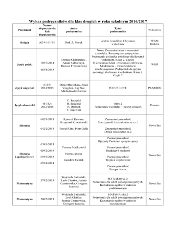 Wykaz podręczników dla klas drugich w roku szkolnym 2016/2017 Przedmiot Numer dopuszczenia Rok dopuszczenia Autor podręcznika Tytuł podręcznika Wydawnictwo Religia AZ-41-01/1-1 Red. Z. Marek Jestem świadkiem Chrystusa w Kościele WAM Kraków Dariusz Chemperek , Adam Kalbarczyk, Dariusz Trześniowski Nowe Zrozumieć tekst - zrozumieć człowieka. Romantyzm- pozytywizm . Podręcznik do języka polskiego dla liceum i technikum. Klasa 2. Część1 2) Zrozumieć tekst - zrozumieć człowieka. Modernizm – dwudziestolecie międzywojenne. Podręcznik do języka polskiego dla liceum i technikum. Klasa 2. Część 2 Daniel Brayshaw, Jones Vaughan, Kay Sue, Michałowski Bartosz FOCUS 3 INT. PEARSON C. Serzyski B. Sekulski N. Drabich T. Gajownik Infos 2 Podręcznik wieloletni + zeszyt ćwiczeń. Pearson 642/1/2013 Ryszard Kulesza, Krzysztof Kowalewski Zrozumieć przeszłość Starożytność i średniowiecze cz.1 642/2/2014 Paweł Klint, Piotr Galik Zrozumieć przeszłość Dzieje nowożytne cz.2 Język polski 703/3/2014 463/4/2013 Język angielski 672/3/ 2014/2015 Język niemiecki 451/3,4/ 2012/2015 WSiP Nowa Era Historia Poznać przeszłość Ojczysty Panteon i ojczyste spory 659/1/2013 Tomasz Maćkowski 659/2/2014 Historia i społeczeństwo Poznać przeszłość Rządzący i rządzeni Iwona Janicka 659/3/2013 Jarosław Centek Poznać przeszłość Wojna i wojskowość Nowa Era 659/4/2014 Poznać przeszłość Europa i świat 378/2/2013 Matematyka Matematyka 360/2/2013 Wojciech Babiański, Lech Chańko, Joanna Czarnowska, Grzegorz Janocha Wojciech Babiański, Lech Chańko, Joanna Czarnowska, Grzegorz Janocha MATeMAtyka 2. Podręcznik dla szkół ponadgimnazjalnych. Kształcenie ogólne w zakresie podstawowym Nowa Era MATeMAtyka 2 Podręcznik dla szkół ponadgimnazjalnych. Kształcenie ogólne w zakresie rozszerzonym Nowa Era Chemia 528/1/2013 Przyroda 658/1/e/2013 Geografia 501/2012/ 2015 564/1/ 2012/2015 Biologia 564/2/ 2013/2016 WOS Zajęcia artystyczne 630/1/2012 Maria Litwin, Szarota Styka-Wlazło, Joanna Szymońska Tytuł: To jest chemia 1 Chemia ogólna i nieorganiczna Zakres rozszerzony Mirosław Galikowski, Romuald Hassa, Marek Kaczmarzyk, Aleksandra Mrzigod, Janusz Mrzigod, Marek Więckowski Klasa realizująca przyrodę jako przedmiot uzupełniającym dla szkół ponadgimnazjalnych Tytuł: Przyroda 1 Roman Malarz Marek Więckowski M Guzik E Jastrzębska R Kozik R Matuszewska E Pyłka – Gutowska W Zamachowski F Dubert R Kozik S Krawczyk A Kula M Marko – Worłowska W Zamachowski Arkadiusz Janicki Justyna Kięczkowska Mariusz Menz Magdalena Bochan-Jachimek Oblicza geografii cz. 1 Nowa Era Nowa Era Nowa Era Biologia na czasie cz. 1 Nowa Era Biologia na czasie cz. 2 W centrum uwagi cz. 1 Zajęcia artystyczne. Zajęcia teatralno-aktorskie Nowa Era Operon