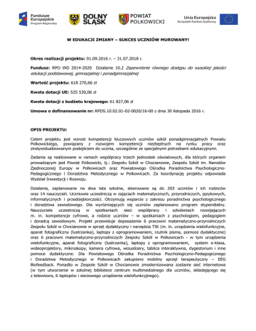 W EDUKACJI ZMIANY – SUKCES UCZNIÓW MUROWANY! Okres realizacji projektu: 01.09.2016 r. – 31.07.2018 r. Działanie 10.2 Zapewnienie równego dostępu do wysokiej jakości edukacji podstawowej, gimnazjalnej i ponadgimnazjalnej Fundusz: RPO WD 2014-2020 Wartość projektu: 618 270,66 zł Kwota dotacji UE: 525 530,06 zł Kwota dotacji z budżetu krajowego: 61 827,06 zł Umowa o dofinansowanie nr: RPDS.10.02.01-02-0020/16-00 z dnia 30 listopada 2016 r. OPIS PROJEKTU: Celem projektu jest wzrost kompetencji kluczowych uczniów szkół ponadgimnazjalnych Powiatu Polkowickiego, powiązany z rozwojem kompetencji niezbędnych na rynku pracy oraz zindywidualizowanym podejściem do ucznia, szczególnie ze specjalnymi potrzebami edukacyjnymi. Zadania są realizowane w ramach współpracy trzech jednostek oświatowych, dla których organem prowadzącym jest Powiat Polkowicki, tj.: Zespołu Szkół w Chocianowie, Zespołu Szkół im. Narodów Zjednoczonej Europy w Polkowicach oraz Powiatowego Ośrodka Poradnictwa PsychologicznoPedagogicznego i Doradztwa Metodycznego w Polkowicach. Za koordynację projektu odpowiada Wydział Inwestycji i Rozwoju. Działania, zaplanowane na dwa lata szkolne, skierowane są do 203 uczniów i ich rodziców oraz 14 nauczycieli. Uczniowie uczestniczą w zajęciach matematycznych, przyrodniczych, językowych, informatycznych i przedsiębiorczości. Otrzymują wsparcie z zakresu poradnictwa psychologicznego i doradztwa zawodowego. Dla wyróżniających się uczniów zaplanowano program stypendialny. Nauczyciele uczestniczą w spotkaniach sieci współpracy i szkoleniach rozwijających m. in. kompetencje cyfrowe, a rodzice uczniów – w spotkaniach z psychologiem, pedagogiem i doradcą zawodowym. Projekt przewiduje doposażenie 6 pracowni matematyczno-przyrodniczych Zespołu Szkół w Chocianowie w sprzęt dydaktyczny i narzędzia TIK (m. in. urządzenia wielofunkcyjne, aparat fotograficzny (lustrzanka), laptopy z oprogramowaniem, rzutnik pisma, pomoce dydaktyczne) oraz 6 pracowni matematyczno-przyrodniczych Zespołu Szkół w Polkowicach - w tym urządzenia wielofunkcyjne, aparat fotograficzny (lustrzanka), laptopy z oprogramowaniem, system e-klasa, wideoprojektory, mikroskopy, kamera cyfrowa, wizualizery, tablica interaktywna, dygestorium i inne pomoce dydaktyczne. Dla Powiatowego Ośrodka Poradnictwa Psychologiczno-Pedagogicznego i Doradztwa Metodycznego w Polkowicach zakupiono mobilny sprzęt terapeutyczny – EEG Biofeedback. Ponadto w Zespole Szkół w Chocianowie zmodernizowana zostanie sieć internetowa (w tym utworzenie w szkolnej bibliotece centrum multimedialnego dla uczniów, składającego się z telewizora, 6 laptopów i sieciowego urządzenia wielofunkcyjnego).