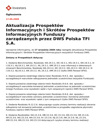 Ogłoszenia 17.09.2009 Aktualizacja Prospektów Informacyjnych i Skrótów Prospektów Informacyjnych Funduszy zarządzanych przez DWS Polska TFI S.A. Uprzejmie informujemy, że 17 września 2009 roku nastąpiła aktualizacja Prospektów Informacyjnych i Skrótów Prospektów Informacyjnych wszystkich Funduszy DWS. Zmiany w Prospektach dotyczą: 1. Dodania Benchmarków, Rozdziały: IIIA.19.3.1, IIIC.19.3.1, IIIG.19.3.1, IIIH.19.3.1, III I.19.3.1, IIIJ.19.3.1, IIIK.19.3.1, IIIL.19.3.1, IIIM.19.3.1 oraz informacji o dokonanych zmianach Benchmarków, Rozdziały IIIA.19.3.2, IIIC.19.3.2, IIIG.19.3.2, IIIH.19.3.2, III I.19.3.2, IIIJ.19.3.2, IIIK.19.3.2, IIIL.19.3.2, IIIM.19.3.2 (tylko DWS Parasol SFIO). 2. Doprecyzowania ostatniego zdania treści Rozdziału III.6.5. dot. sposobu i szczegółowych warunków odkupywania jednostek uczestnictwa (wszyskie Fundusze). 3. Doprecyzowania ostatniego zdania treści Rozdziału III.6.6. dot. sposobu i szczegółowych warunków konwersji jednostek uczestnictwa na jednostki uczestnictwa innego Funduszu oraz wysokości opłat z tym związanych (oprócz DWS Parasol SFIO). 4. Doprecyzowania ostatniego zdania treści Rozdziału III.6.6. dot. sposobu i szczegółowych warunków zamiany jednostek uczestnictwa i konwersji jednostek uczestnictwa oraz wysokości opłat z tym związanych (tylko DWS Parasol SFIO). 5. Dodania Rozdziału III.12.2.6. dotyczącego ryzyka zmiany terminu realizacji zlecenia odkupienia lub konwersji jednostek uczestnictwa w przypadku zagrożenia płynności Funduszu (oprócz DWS Parasol SFIO). 6. Dodania Rozdziałów: IIIA.15.3.6, IIIB.15.3.6, IIIC.15.3.6, IIID.15.3.6, IIIE.15.3.6, IIIF.15.3.6, IIIG.15.3.6, IIIH.15.3.6, III I.15.3.6, IIIJ.15.3.6, IIIK.15.3.6, IIIL.15.3.6, IIIM.15.3.6, IIIN.15.3.6, IIIO.15.3.6 dotyczących ryzyka zmiany terminu realizacji zlecenia odkupienia, zamiany lub konwersji jednostek uczestnictwa w przypadku zagrożenia płynności Subfunduszu (tylko DWS Parasol SFIO). 7. Doprecyzowania treści Rozdziału III.6.3.1. dotyczącego minimalnych wpłat na nabycia jednostek uczestnictwa Subfunduszu (tylko DWS Parasol SFIO). Zmiany w Skrótach Prospektów dotyczą: 1. Dodania Benchmarków, Rozdziały: IA.12.3.1, IC.12.3.1, IG.12.3.1, IH.12.3.1, I I.12.3.1, IJ.12.3.1, IK.12.3.1, IL.12.3.1, IM.12.3.1 oraz informacji o dokonanych zmianach Benchmarków, Rozdziały IA.12.3.2, IC.12.3.2, IG.12.3.2, IH.12.3.2, I I.12.3.2, IJ.12.3.2, IK.12.3.2, IL.12.3.2, IM.12.3.2 (tylko DWS Parasol SFIO). 2. Doprecyzowania ostatniego zdania treści Rozdziału I.11.5. dot. sposobu i szczegółowych warunków odkupywania jednostek uczestnictwa (oprócz DWS Parasol SFIO). 3. Doprecyzowania ostatniego zdania treści Rozdziału I.5.5. dot. sposobu i szczegółowych warunków odkupywania jednostek uczestnictwa (tylko DWS Parasol SFIO). 4. Doprecyzowania ostatniego zdania treści Rozdziału I.11.6. dot. sposobu i szczegółowych warunków konwersji jednostek uczestnictwa na jednostki uczestnictwa innego Funduszu oraz wysokości opłat z tym związanych (oprócz DWS Parasol SFIO). 5. Doprecyzowania ostatniego zdania treści Rozdziału I.5.6. dot. sposobu i szczegółowych warunków zamiany jednostek uczestnictwa i konwersji jednostki uczestnictwa oraz wysokości opłat z tym związanych (tylko DWS Parasol SFIO). 6. Dodania Ryzyka zmiany terminu realizacji zlecenia odkupienia lub konwersji jednostek uczestnictwa w przypadku zagrożenia płynności Funduszu, Rozdział I.5.2. (oprócz DWS Parasol SFIO). 7. Dodania Rozdziałów: IA.9.3.6, IB.9.3.6, IC.9.3.6, ID.9.3.6, IE.9.3.6, IF.9.3.6, IG.9.3.6, IH.9.3.6, I I.9.3.6, IJ.9.3.6, IK.9.3.6, IL.9.3.6, IM.9.3.6, IN.9.3.6, IO.9.3.6 dotyczących ryzyka zmiany terminu realizacji zlecenia odkupienia, zamiany lub konwersji jednostek uczestnictwa w przypadku zagrożenia płynności Subfunduszu (tylko DWS Parasol SFIO). 8. Doprecyzowania treści Rozdziału I.5.3.1. dotyczącego minimalnych wpłat na nabycia jednostek uczestnictwa Subfunduszu (tylko DWS Parasol SFIO).