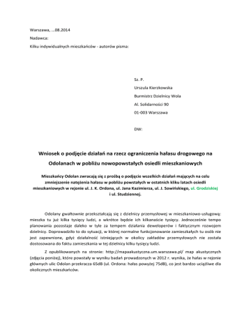 Warszawa, ...08.2014 Nadawca: Kilku indywidualnych mieszkańców ‐ autorów pisma: Sz. P. Urszula Kierzkowska Burmistrz Dzielnicy Wola Al. Solidarności 90 01‐003 Warszawa DW: Wniosek o podjęcie działań na rzecz ograniczenia hałasu drogowego na Odolanach w pobliżu nowopowstałych osiedli mieszkaniowych Mieszkańcy Odolan zwracają się z prośbą o podjęcie wszelkich działań mających na celu zmniejszenie natężenia hałasu w pobliżu powstałych w ostatnich kliku latach osiedli mieszkaniowych w rejonie ul. J. K. Ordona, ul. Jana Kazimierza, ul. J. Sowińskiego, ul. Grodziskiej i ul. Studziennej. Odolany gwałtownie przekształcają się z dzielnicy przemysłowej w mieszkaniowo‐usługową: mieszka tu już kilka tysięcy ludzi, a wkrótce będzie ich kilkanaście tysięcy. Jednocześnie tempo planowania pozostaje daleko w tyle za tempem działania deweloperów i faktycznym rozwojem dzielnicy. Doprowadziło to do sytuacji, w której normalne funkcjonowanie zamieszkałych tu osób nie jest zapewnione, gdyż działalność istniejących w okolicy zakładów przemysłowych nie została dostosowana do faktu zamieszkania w tej dzielnicy kilku tysięcy ludzi. Z opublikowanych na stronie: http://mapaakustyczna.um.warszawa.pl/ map akustycznych (zdjęcia poniżej), które powstały w wyniku badań prowadzonych w 2012 r. wynika, że hałas w rejonie głównych ulic Odolan przekracza 65dB (ul. Ordona: hałas powyżej 75dB), co jest bardzo uciążliwe dla okolicznych mieszkańców. Hałas drogowy w ciągu całej doby Hałas drogowy w godzinach nocnych Niestety, w 2012 r. podczas przygotowywania w/w mapy akustycznej, tereny, na których w ciągu ostatnich 2‐3 lat powstały nowe osiedla mieszkaniowe, nie zostały określone jako tereny o charakterze mieszkalno‐usługowym. W związku z tym, pomimo znacznych przekroczeń dopuszczanego natężenia hałasu nowe budynki mieszkalne nie zostały objęte Programem ochrony środowiska przed hałasem dla m.st. Warszawy. Zgodnie z informacją, jaką uzyskaliśmy z Biura Ochrony Środowiska, kolejne pomiary są przewidywane na rok 2017, a kolejny Program ochrony środowiska przed hałasem opracowany będzie w 2018 roku. W obliczu opisanego wyżej stanu rozwoju dzielnicy czekanie z działaniami zapobiegającymi ogólnemu problemowi nadmiernego hałasu na Odolanach do roku 2017 byłoby ze strony gminy niedopuszczalne. Hałas, o którym mówimy, jest szczególnego i bardzo uciążliwego rodzaju. Nie jest to zwykły hałas drogowy, jaki występuje przy ulicach o natężonym ruchu i ma postać w miarę jednostajnego szumu, do którego można się przyzwyczaić. Hałas w naszej dzielnicy ma postać ogromnego huku i dudnienia generowanego przez wielotonowe (powyżej 10 T) pojazdy, podczas przedzierania się przez wielkie wyboje na nawierzchni ulic, o których mowa. Wiele z tych pojazdów, oprócz tego że ma nieporównywalnie głośniejsze niż auta osobowe silniki, przewozi metalowe kontenery lub złom albo ciągnie metalowe naczepy. Co więcej, najbardziej wzmożony ruch obserwujemy w głębokich godzinach nocnych, np. o godzinie 1.00 czy 4.00‐5.00 nad ranem. W efekcie względna cisza trwająca, gdy akurat wspomnianymi ulicami nie jeżdżą auta, jest potem przerywana nagłym, bardzo silnym, nieregularnym hukiem, który uniemożliwia sen, powoduje ogromny dyskomfort, wywołuje stres i uczucie ciągłego zagrożenia, narusza ciszę nocną mieszkańców. Mówiąc obrazowo: człowiek wybudzony ze snu w środku nocy ma wrażenie, jakby właśnie walił się budynek bądź jakby znajdował się w strefie działań wojennych. W ciągu dnia hałas ma podobny charakter. Na ul. Sowińskiego, która jest jedynym dojazdem do zakładów zlokalizowanych na końcu ul. Grodziskiej, średnio podczas dnia miedzy godzinami 5 rano a 22 przejeżdża tam ok. 40‐50 ciężarówek na godzinę, (co daje 680 – 850 ciężarówek na dobę). Z kolei ul. Ordona jest jedynym dojazdem do zakładów przy ul. Ordona i Gniewkowskiej, a pojazdy pow. 16T kursują średnio 15‐20 na godzinę przez całą dobę. Takie natężenie ruchu ciężkich pojazdów na drogach przebiegających przez tereny z zabudową wielorodzinną oprócz wspomnianego nadmiernego hałasu generuje niebezpieczeństwo wypadków z udziałem pieszych lub innych pojazdów. Ciężarówki nie przestrzegają ustalonych ograniczeń prędkości, a na skrzyżowaniach ulic Sowińskiego i Jana Kazimierza oraz Ordona i Jana Kazimierza często dochodzi do wymuszeń pierwszeństwa przejazdu przez pojazdy ciężarowe. W ciągu całego tygodnia jedynym czasem, kiedy można odpocząć od uciążliwego hałasu jest niecała doba od sobotniego wieczoru do niedzielnego popołudnia. Chcieliśmy zwrócić uwagę, że nie mówimy o hałasie związanym z okolicznymi budowami czy z ruchem pojazdów osobowych, które nagminnie używają zdemolowanej ul. J. K. Ordona jako skrótu, by dojechać do Al. Prymasa Tysiąclecia. Ponadto, część z zakładów, zarówno na ul. J.K. Ordona jak i ul. Grodziskiej które generują ruch drogowy powodujący problem, zaczęła lub wzmożyła swoją działalność już po wprowadzeniu się obecnych mieszkańców. Samochody ciężarowe z kruszywami, betoniarki, przyczepy do przewozu złomu oraz tiry z kontenerami stopniowo dewastują nawierzchnie ulic, co z miesiąca na miesiąc wzmaga hałas. Z tych względów nie są dla nas argumentami stwierdzenia, jakie dotąd słyszeliśmy od urzędników: że osoby decydujące się na zamieszkanie na Odolanach powinny być wcześniej świadome tego problemu, albo że jest wiele miejsc w Warszawie, gdzie natężenie hałasu jest jeszcze wyższe, a mieszkańcy się nie skarżą, albo że problem jest przejściowy i skończy się wraz z zakończeniem budów. Nie jest koniecznie przekonywanie, jak bardzo negatywny wpływ na zdrowie i samopoczucie ludzi ma nadmierny hałas i brak możliwości normalnego wypoczynku nocnego. Ekspozycja na zwiększony hałas nocą powodu