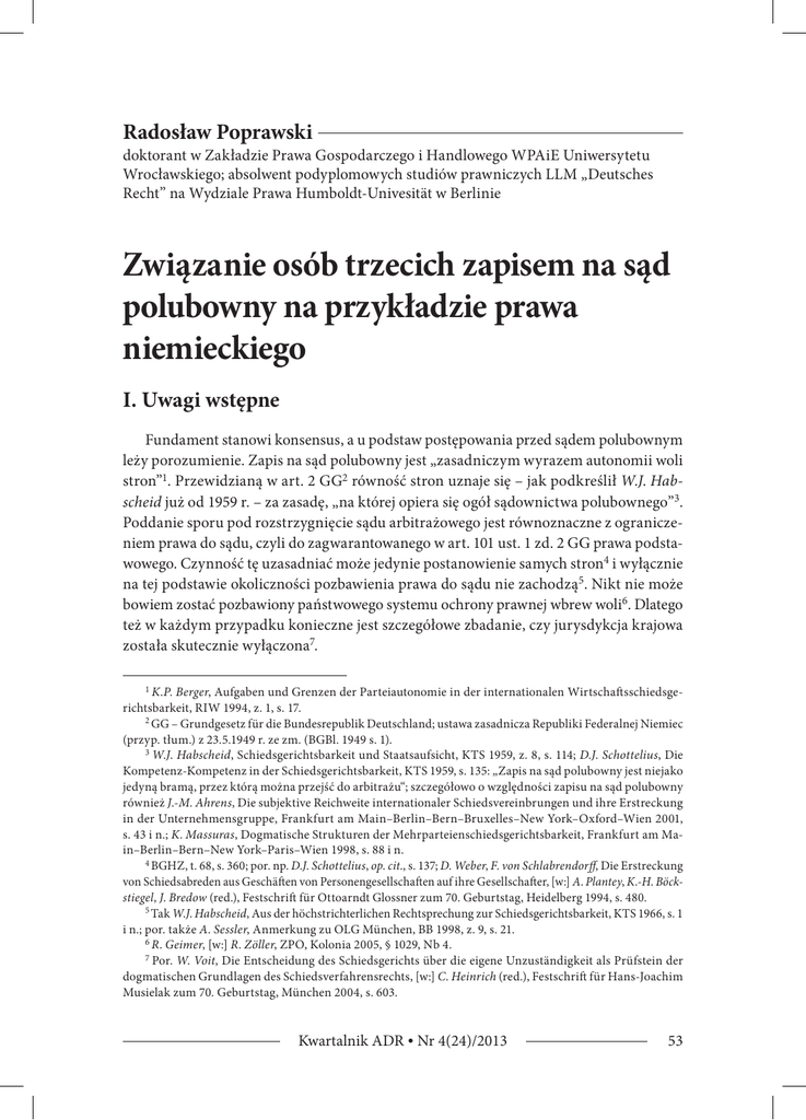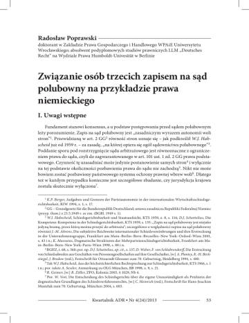 Radosław Poprawski doktorant w Zakładzie Prawa Gospodarczego i Handlowego WPAiE Uniwersytetu Wrocławskiego; absolwent podyplomowych studiów prawniczych LLM „Deutsches Recht” na Wydziale Prawa Humboldt-Univesität w Berlinie Związanie osób trzecich zapisem na sąd polubowny na przykładzie prawa niemieckiego I. Uwagi wstępne Fundament stanowi konsensus, a u podstaw postępowania przed sądem polubownym leży porozumienie. Zapis na sąd polubowny jest „zasadniczym wyrazem autonomii woli stron”1. Przewidzianą w art. 2 GG2 równość stron uznaje się – jak podkreślił W.J. Habscheid już od 1959 r. – za zasadę, „na której opiera się ogół sądownictwa polubownego”3. Poddanie sporu pod rozstrzygnięcie sądu arbitrażowego jest równoznaczne z ograniczeniem prawa do sądu, czyli do zagwarantowanego w art. 101 ust. 1 zd. 2 GG prawa podstawowego. Czynność tę uzasadniać może jedynie postanowienie samych stron4 i wyłącznie na tej podstawie okoliczności pozbawienia prawa do sądu nie zachodzą5. Nikt nie może bowiem zostać pozbawiony państwowego systemu ochrony prawnej wbrew woli6. Dlatego też w każdym przypadku konieczne jest szczegółowe zbadanie, czy jurysdykcja krajowa została skutecznie wyłączona7. 1 K.P. Berger, Aufgaben und Grenzen der Parteiautonomie in der internationalen Wirtschaftsschiedsgerichtsbarkeit, RIW 1994, z. 1, s. 17. 2 GG – Grundgesetz für die Bundesrepublik Deutschland; ustawa zasadnicza Republiki Federalnej Niemiec (przyp. tłum.) z 23.5.1949 r. ze zm. (BGBl. 1949 s. 1). 3 W.J. Habscheid, Schiedsgerichtsbarkeit und Staatsaufsicht, KTS 1959, z. 8, s. 114; D.J. Schottelius, Die Kompetenz-Kompetenz in der Schiedsgerichtsbarkeit, KTS 1959, s. 135: „Zapis na sąd polubowny jest niejako jedyną bramą, przez którą można przejść do arbitrażu“; szczegółowo o względności zapisu na sąd polubowny również J.-M. Ahrens, Die subjektive Reichweite internationaler Schiedsvereinbrungen und ihre Erstreckung in der Unternehmensgruppe, Frankfurt am Main–Berlin–Bern–Bruxelles–New York–Oxford–Wien 2001, s. 43 i n.; K. Massuras, Dogmatische Strukturen der Mehrparteienschiedsgerichtsbarkeit, Frankfurt am Main–Berlin–Bern–New York–Paris–Wien 1998, s. 88 i n. 4 BGHZ, t. 68, s. 360; por. np. D.J. Schottelius, op. cit., s. 137; D. Weber, F. von Schlabrendorff, Die Erstreckung von Schiedsabreden aus Geschäften von Personengesellschaften auf ihre Gesellschafter, [w:] A. Plantey, K.-H. Böckstiegel, J. Bredow (red.), Festschrift für Ottoarndt Glossner zum 70. Geburtstag, Heidelberg 1994, s. 480. 5 Tak W.J. Habscheid, Aus der höchstrichterlichen Rechtsprechung zur Schiedsgerichtsbarkeit, KTS 1966, s. 1 i n.; por. także A. Sessler, Anmerkung zu OLG München, BB 1998, z. 9, s. 21. 6 R. Geimer, [w:] R. Zöller, ZPO, Kolonia 2005, § 1029, Nb 4. 7 Por. W. Voit, Die Entscheidung des Schiedsgerichts über die eigene Unzuständigkeit als Prüfstein der dogmatischen Grundlagen des Schiedsverfahrensrechts, [w:] C. Heinrich (red.), Festschrift für Hans-Joachim Musielak zum 70. Geburtstag, München 2004, s. 603. Kwartalnik ADR • Nr 4(24)/2013 53 Poprawski Niemiecki ustawodawca zmieniając brzmienie Księgi 10 ZPO8 znowelizował w 1997 r. przepisy arbitrażu handlowego9. Nowa regulacja szczegółowo określa m.in. zasady zawierania zapisu na sąd polubowny10. Przepisy precyzują wymogi formy zapisu w § 1031 ZPO. Oprócz wyraźnego rozgraniczenia właściwości sądów normuje on także zakres ochrony osób, których postępowanie dotyczy11. Paragraf 1031 ust. 5 ZPO przewiduje bardziej rygorystyczne wymogi formalne przy zawieraniu zapisu, którego jedna ze stron jest konsumentem12. W związku z tym zapis na sąd, w zawieraniu którego bierze udział konsument, powinien być sporządzony w dokumencie podpisanym własnoręcznie przez strony. Forma pisemna może być zastąpiona przez formę elektroniczną zgodnie z § 126a BGB13. Z tego względu wątpliwości budzi udział w postępowaniu przed sądem polubownym niebędącej sygnatariuszem zapisu osoby trzeciej wbrew jej woli. Niemniej jednak praktyka arbitrażu wydaje się być odmienna14. Powyższa konstatacja odnosi się przede wszystkim do międzynarodowej praktyki sądownictwa polubownego, która w myśl doktryny „grupy spółek” (ang. Group of companies doctrine) dopuszcza rozszerzenie skuteczności zapisu na sąd polubowny na osoby trzecie15. Zbliżone są także kierunki rozwoju w Niemczech, co potwierdza literatura i orzecznictwo. W piśmiennictwie jako przykłady rozszerzenia skuteczności zapisu wskazuje się odpowiedzialność przebijającą oraz cywilną współodpowiedzialność spółek należących do koncernu. A. Holeweg opowiada się także za rozciągnięciem skuteczności zapisu w przypadku nadużycia instytucji tzw. spółki podstawionej (niem. Strohmanngesellschaft16)17. Kolejni przedstawiciele nauki prawa niemieckiego związanie spółki-matki koncernu zapisem jej spółki-córki argumentują tzw. fikcją prawną jedności (niem. Rechtsschein der Einheit)18 8 ZPO – Zivilprozessordnung; niemiecki kodeks postępowania cywilnego (przyp. tłum.) z 30.1.1877 r. ze zm. (BGBl. I s. 3202, ber. 2006 s. 431, u. 2007 s. 1781). 9 BGBl 1997 I s. 3224, weszła w życie 1.1.1999 r. 10 „Treść zapisu na sąd polubowny powinna być interpretowana w drodze wykładni zawężającej”, tak O. Sandrock, Arbitration Agreements and Group of Companies, [w:] Ch. Dominicé, R. Patry, C. Reymond (red.), Études de Droit International en l’honneur de Pierre Lalive, Basel–Frankfurt am Main 1993, s. 634 i n.; por. O. Sandrock, “Intra” and “Extra-Entity” Agreements to Arbitrate and their Extension to Non-Signatories Under German Law, JIntArb 2002, t. 19, z. 5, s. 430. 11 BGHZ, t. 36, s. 278. 12 J. Münch, [w:] Münchener Kommentar, ZPO, München 2001, § 1031, Nb 3. 13 BGB – Bürgerliches Gesetzbuch; niemiecki kodeks cywilny (przyp. tłum.) z 18.8.1896 r. ze z