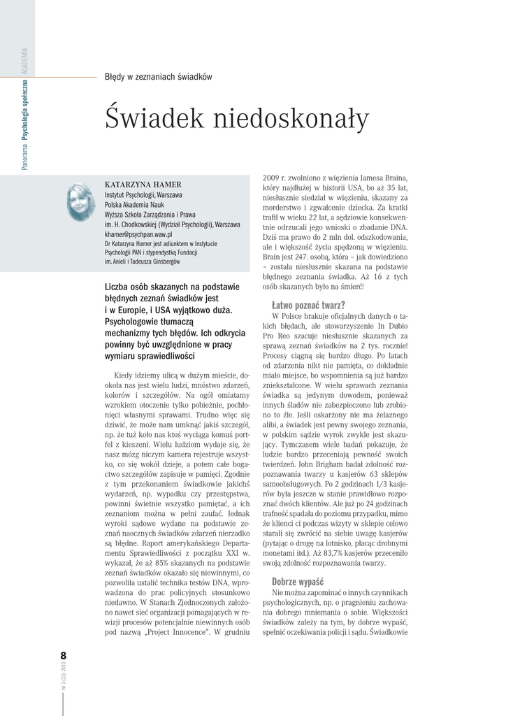 Panorama Psychologia społeczna ACADEMIA Błędy w zeznaniach świadków Świadek niedoskonały KATARZYNA HAMER Instytut Psychologii, Warszawa Polska Akademia Nauk Wyższa Szkoła Zarządzania i Prawa im. H. Chodkowskiej (Wydział Psychologii), Warszawa [email protected] Dr Katarzyna Hamer jest adiunktem w Instytucie Psychologii PAN i stypendystką Fundacji im. Anieli i Tadeusza Ginsbergów Liczba osób skazanych na podstawie błędnych zeznań świadków jest i w Europie, i USA wyjątkowo duża. Psychologowie tłumaczą mechanizmy tych błędów. Ich odkrycia powinny być uwzględnione w pracy wymiaru sprawiedliwości Kiedy idziemy ulicą w dużym mieście, dookoła nas jest wielu ludzi, mnóstwo zdarzeń, kolorów i szczegółów. Na ogół omiatamy wzrokiem otoczenie tylko pobieżnie, pochłonięci własnymi sprawami. Trudno więc się dziwić, że może nam umknąć jakiś szczegół, np. że tuż koło nas ktoś wyciąga komuś portfel z kieszeni. Wielu ludziom wydaje się, że nasz mózg niczym kamera rejestruje wszystko, co się wokół dzieje, a potem całe bogactwo szczegółów zapisuje w pamięci. Zgodnie z tym przekonaniem świadkowie jakichś wydarzeń, np. wypadku czy przestępstwa, powinni świetnie wszystko pamiętać, a ich zeznaniom można w pełni zaufać. Jednak wyroki sądowe wydane na podstawie zeznań naocznych świadków zdarzeń nierzadko są błędne. Raport amerykańskiego Departamentu Sprawiedliwości z początku XXI w. wykazał, że aż 85% skazanych na podstawie zeznań świadków okazało się niewinnymi, co pozwoliła ustalić technika testów DNA, wprowadzona do prac policyjnych stosunkowo niedawno. W Stanach Zjednoczonych założono nawet sieć organizacji pomagających w rewizji procesów potencjalnie niewinnych osób pod nazwą „Project Innocence”. W grudniu Nr 3 (23) 2010 8 2009 r. zwolniono z więzienia Jamesa Braina, który najdłużej w historii USA, bo aż 35 lat, niesłusznie siedział w więzieniu, skazany za morderstwo i zgwałcenie dziecka. Za kratki trafił w wieku 22 lat, a sędziowie konsekwentnie odrzucali jego wnioski o zbadanie DNA. Dziś ma prawo do 2 mln dol. odszkodowania, ale i większość życia spędzoną w więzieniu. Brain jest 247. osobą, która – jak dowiedziono – została niesłusznie skazana na podstawie błędnego zeznania świadka. Aż 16 z tych osób skazanych było na śmierć! Łatwo poznać twarz? W Polsce brakuje oficjalnych danych o takich błędach, ale stowarzyszenie In Dubio Pro Reo szacuje niesłusznie skazanych za sprawą zeznań świadków na 2 tys. rocznie! Procesy ciągną się bardzo długo. Po latach od zdarzenia nikt nie pamięta, co dokładnie miało miejsce, bo wspomnienia są już bardzo zniekształcone. W wielu sprawach zeznania świadka są jedynym dowodem, ponieważ innych śladów nie zabezpieczono lub zrobiono to źle. Jeśli oskarżony nie ma żelaznego alibi, a świadek jest pewny swojego zeznania, w polskim sądzie wyrok zwykle jest skazujący. Tymczasem wiele badań pokazuje, że ludzie bardzo przeceniają pewność swoich twierdzeń. John Brigham badał zdolność rozpoznawania twarzy u kasjerów 63 sklepów samoobsługowych. Po 2 godzinach 1/3 kasjerów była jeszcze w stanie prawidłowo rozpoznać dwóch klientów. Ale już po 24 godzinach trafność spadała do poziomu przypadku, mimo że klienci ci podczas wizyty w sklepie celowo starali się zwrócić na siebie uwagę kasjerów (pytając o drogę na lotnisko, płacąc drobnymi monetami itd.). Aż 83,7% kasjerów przeceniło swoją zdolność rozpoznawania twarzy. Dobrze wypaść Nie można zapominać o innych czynnikach psychologicznych, np. o pragnieniu zachowania dobrego mniemania o sobie. Większości świadków zależy na tym, by dobrze wypaść, spełnić oczekiwania policji i sądu. Świadkowie www.sxc.hu poddawani są silnemu naciskowi, by „współpracować” z organami ścigania. Na prośbę, by wskazać winnego, często się kogoś wybiera, nawet gdy nie ma 100% pewności. Gdy pokazywałam badanym twarz mężczyzny na fotografii, a potem prosiłam o rozpoznanie go wśród czterech zdjęć, niemal wszyscy wskazywali jedno z nich. Tyle że w rzeczywistości nie było go na żadnym... Ludziom trudno się przyznać, że nie wiedzą. Czują się wtedy trochę tak, jakby oblewali ważny egzamin. Błędy często są nieświadome, trudno więc spodziewać się, że świadek się do nich przyzna. A nawet jeśli je sobie uświadomi, nie zawsze o tym powie, choćby z powodu lęku przed możliwą kompromitacją w oczach innych. Poza tym ludziom zależy, by ukarać winnego. Inaczej nie czuliby się bezpiecznie. Nieświadomie wybierany jest ten, kto choć trochę pasuje. Sprawa zostaje zamknięta, a porządek świata przywrócony. Nieświadomy transfer Nie chodzi o to, że świadkowie naoczni kłamią – wręcz przeciwnie, na ogół są przekonani, że mówią prawdę. Tyle że wspomnienia podczas wielokrotnego odtwarzania, zeznań, rozpoznań, słuchania o sprawie od innych itp. ulegają modyfikacjom. Błędy we wspomnieniach biorą się, po pierwsze, z wiedzy ogólnej, którą mamy na temat tego, jak dane zdarzenia (np. wypadek, morderstwo, napad na bank) zwykle przebiegają, czyli ze schematów i stereotypów w naszych umysłach. Wiedza prowokuje do dopowiadania szczegółów, których tak naprawdę nie było, ale pasują do schematu. Po drugie, błędy są wynikiem łączenia prawdziwych elementów w nieprawdziwą całość. W tym drugim przypadku dochodzi do dwóch zjawisk: włączania w dane wspomnienie informacji zasłyszanych (np. od policjantów, innych świadków, z telewizji, przeczytanych w gazecie relacji ze sprawy itp.) oraz łącze- nia w jedno fragmentów różnych zdarzeń. Elisabeth Loftus nazywa to zjawisko „nieświadomym transferem pamięciowym”. W badaniu Roberta Buckhouta przeprowadzonym na campusie uniwersyteckim zaatakowany profesor wskazał jako sprawcę niewinnego świadka napadu, bo połączył ze zd