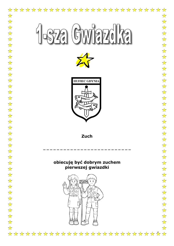 Zuch __________________________ obiecuję być dobrym zuchem pierwszej gwiazdki 1 1-szą gwiazdkę może otrzymać zuch, który wykonał warunki próby na zdobycie 1 gwiazdki. 1. 2. 3. 4. 5. 6. Przychodzi regularnie na zbiórki w mundurku. Mówi na zbiórkach po polsku (jeśli nie umie – uczy się mówić po polsku). Jest pożyteczny/a w domu; stara się wyręczyć mamę, tatę i rodzeństwo. Jest grzeczny/a i pomaga wszystkim. Dba o swój mundurek. Ma czyste ręce i paznokcie, myje codzień zęby. Zdobył/a jedną sprawność indywidualną oraz jedną sprawność cyklową z całą gromadą. Wykona warunki próby. Z wychowania narodowego: 1. Zna flagę i godło Polski. ____________________ zna nazwę stolicy Polski: 2. ________________________ dwa inne miasta: ________________________ oraz główną rzekę Polski: ________________________ Zna jedną legendę z historii Polski. ______________________________________ 2 Smok Wawelski Dawno, dawno temu, za czasów panowania Księcia Kraka - legendarnego założyciela miasta Krakowa - nieustannie znikały młode dziewczyny, a nikt z Krakowian nie wiedział, co się z nimi stało. Aż pewnego razu okazało się, że u stóp Wawelskiego Wzgórza w ogromnej pieczarze żył straszliwy smok. Porywał on nie tylko bydło, trzodę chlewną i wszelaką zwierzynę, ale jego przysmakiem jednak były te młode dziewczyny. Książe Krak zatem ogłosił: "Kto zabije smoka, dostanie ode mnie pół królestwa i moja córkę za żonę". Wielu dzielnych rycerzy stawało do walki z smokiem. Żadnemu jednak nie udało się mu pokonać. W końcu młody szewczyk wpadł na wspaniały pomysł! Wypchał skórę owcy siarką i podrzucił pod pieczarę smoka. Głodny potwór zobaczywszy smakowitą owieczkę nie zastanawiał się długo - pożarł ją jednym tchem. Zaraz potem poczuł pieczenie w brzuchu. Z każdą chwilą piekło go coraz bardziej. Spragniony pobiegł na brzeg Wisły i począł łapczywie pić wodę z rzeki. Wypił jeden łyk, drugi, trzeci, ale ciągle nie mógł ugasić pragnienia. Pił więc dalej, pił, aż pękł! Miasto zostało uwolnione od straszliwego smoka, a szewczyk otrzymał od króla obiecaną nagrodę i poślubił jego córkę. 3. Zna jedną piosenkę ludową. ______________________________________ Z wychowania religijnego: 1. Mówi pacierz po polsku. 2. Umie zachować się w kościele. Śpiewa jedną pieśń kościelną: ______________________________________ 3. Opowie w kilku słowach o Bożym Narodzeniu i Wielkanocy. Boże Narodzenie: Rozpoczynamy Wigilię gdy zabłyśnie pierwsza gwiazda na niebie. Zostawiamy jedno miejsce przy stole dla niespodziewanego gościa. Układamy siano pod obrusem na pamiątkę, że Pan Jezus leżał na sianie. Podajemy 12 potraw na stół Wigilijny. Nie jemy mięsa. Opłatek: Przed rozpoczęciem kolacji wigilijnej rodzina powinna podzielić się opłatkiem. Łamanie się nim symbolizuje łamanie się chlebem Jezusa z apostołami podczas ostatniej wieczerzy. Msza świąteczna w noc Wigilijna nazywa się pasterka. Świateczne pioseniki nazywają się kolędy. 3 Wielkanoc Najstarsze i najważniejsze święto chrześcijańskie (obok Bożego Narodzenia) pamiętniające śmierć krzyżową i zmartwychwstanie Jezusa Chrystusa. Niedziela Palmowa upamiętniać ma wjazd Chrystusa do Jerozolimy. W tym dniu przynoszimi do kościoła palemki. Tydzień przed Wielkanocą nazywany jest Wielkim Tygodniem. W Wielką Sobotę w kościele zostaje poświęcone jedzenie. Do koszyczka dajemy chleb, sól, jajka (jako symbol nowego życia) lub pisanki, wędlinę, babkę i baranka Tradycje: Tłuczenie jaj. Istnieje gra, w której należy stukać się jajkiem. Ten, któremu pierwsza pęknie skorupka, musi oddać swoją pisankę rywalowi. Drugi dzień świąt jest zwany Śmingus Dyngus. Ten dzień przeznaczony jest na oblewanie osób, nawet nieznajomych. Aby panna wyszła za mąż, musi być ona oblana przez kawalera. Z wychowania zuchowego: 1. Zna nazwę i godło swojej gromady i umie wytłumaczyć ich znaczenie. 2. Zna ogólną oznakę zuchową: ________________________ pozdrowienie: ________________________ umie stawać na zbiórkę i składać ukłon zuchowy. 3. 4. Umie na pamięć prawo i obietnicę zuchową. 1. Zuch kocha Boga i Polskę. 2. Zuch jest dzielny. 3. Każdemu z zuchem jest dobrze. 4. Zuch stara się być coraz lepszy. 5. Zuch stara się mówić po polsku. Zna imię i nazwisko drużynowej. _______________________________ 5. Tańczy jeden taniec zuchowy; zna dwie piosenki zuchowe; maszeruje przy śpiewie. Ze sprawności fizycznych: 1. 2. Orientacja: np. znajdzie ukryty zegarek (słuch), ołówek (wzrok) i cebulę (węch). Zręczność: np. biegnie z książką na głowie, skacze z kamienia na kamień. Umie grać w 3 gry ruchowe i 3 ze śpiewem. Łapie piłke. 4