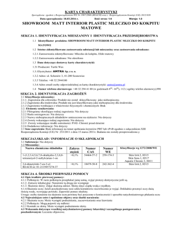 KARTA CHARAKTERYSTYKI Sporządzona zgodnie z Rozporządzeniem WE Nr 1907/2006 (REACH) oraz z Rozporządzeniem Komisji (UE) 2015/830 Data sporządzenia: 18.03.2016 r. Ilość stron: 1/4 Wersja: 1.0 SHOWROOM MATT INTERIOR PLASTIC MLECZKO DO KOKPITU MATOWE SEKCJA 1. IDENTYFIKACJA MIESZANINY I IDENTYFIKACJA PRZEDSIĘBIORSTWA 1.1 Identyfikator produktu: SHOWROOM MATT INTERIOR PLASTIC MLECZKO DO KOKPITU MATOWE 1.2 Istotne zidentyfikowane zastosowania substancji lub mieszaniny oraz zastosowania odradzane: 1.2.1 Zastosowania zidentyfikowane: Mleczko do kokpitu. Efekt matowy 1.2.2 Zastosowania odradzane: Nie określono 1.3 Dane dotyczące dostawcy karty charakterystyki: 1.31 Producent: Turtle Wax 1.3.1Dystrybutor: AMTRA Sp. z o. o. 1.3.2 Adres: ul. Schonów 3, 41-200 Sosnowiec 1.3.3 Telefon: +48 32 2944100 1.3.4 Adres email osoby odpowiedzialnej za kartę charakterystyki: [email protected] 1.4 Numer telefonu alarmowego: +48 32 294 41 00 (w godzinach 800- 1600), 112 ( ogólny telefon alarmowy),998 SEKCJA 2. IDENTYFIKACJA ZAGROŻEŃ 2.1 Klasyfikacja mieszaniny: 2.1.1. Zagrożenia dla człowieka: Produkt nie został sklasyfikowany jako niebezpieczny. 2.1.2 Zagrożenie dla środowiska: Produkt nie jest klasyfikowany jako niebezpieczny dla środowiska 2.1.3 Zagrożenia wynikające z właściwości fizycznych i chemicznych: Brak 2.2. Elementy oznakowania: 2.2.1 Piktogramy określające rodzaj zagrożenia: Nie dotyczy 2.2.2 Hasła ostrzegawcze: Nie dotyczy 2.2.3 Nazwy niebezpiecznych składników umieszczone na etykiecie: Nie dotyczy 2.2.4 Zwroty wskazujące rodzaj zagrożenia: Nie dotyczy 2.2.5 Zwroty wskazujące środki ostrożności: P102- Chronić przed dziećmi 2.2.6 Dodatkowe informacje: Nie dotyczy 2.3 Inne zagrożenia: Brak informacji na temat spełniania kryteriów PBT lub vPvB zgodnie z załącznikiem XIII Rozporządzenia Komisji (UE) Nr 253/2011 z dnia 15 marca 2011r. Badania nie zostały przeprowadzone.y SEKCJA3.SKŁAD / INFORMACJE O SKŁADNIKACH 3.1 Substancje: Nie dotyczy 3.2 Mieszaniny: Nazwa chemiczna składnika Zakres stężeń Numer CAS Numer WE Klasyfikacja wg 1272/2008/WE 1-(1,2,3,4,5,6,7,8-oktahydro-2,3,8,8tetrametyol-2-naftylo)etan-1-on <0,1% 54464-57-2 259-174-3 2,6-dimetylokt-7-en-2-ol REACH nr: 01-2119457274-37 <0,1% 18479-58-8 242-362-4 Skin Irrit.2, H315 Skin Sens.1, H317 Aquatic Chronic 2, H411 Skin Irrit.2, H315 SEKCJA 4. ŚRODKI PIERWSZEJ POMOCY 4.1 Opis środków pierwszej pomocy: 4.1.1 Połknięcie: W razie połknięcia przepłukać jamę ustną, wyjąć protezy dentystyczne jeśli są. 4.1.2. Zatrucie inhalacyjne: Narażenie tą drogą nie występuje 4.1.3. Skażenie skóry: Zdjąć skażoną odzież. Skórę zmyć ciepłą wodą z mydłem. 4.1.4.Skażenie oczu: Jeżeli poszkodowany nosi szkła kontaktowe niezwłocznie je wyjąć. Dokładnie przemyć oczy dużą ilością wody, wywijając powieki. Zapewnić pomoc okulisty. Uwaga: osoby narażone na skażenie oczu powinny być pouczone o konieczności i sposobie natychmiastowego płukania oczu 4.2 Najważniejsze ostre i opóźnione objawy oraz skutki narażenia: 4.2.1 Skażenie oczu: Może wystąpić podrażnienie, zaczerwienienie oraz łzawienie 4.2.2 Połknięcie: Mogą pojawić się mdłości 4.2.3 Kontakt ze skórą: Może wystąpić podrażnienie skóry. 4.3 Wskazania dotyczące wszelkiej natychmiastowej pomocy lekarskiej i szczególnego postępowania z poszkodowanym: Leczenie objawowe. KARTA CHARAKTERYSTYKI Sporządzona zgodnie z Rozporządzeniem WE Nr 1907/2006 (REACH) oraz z Rozporządzeniem Komisji (UE) 2015/830 Data sporządzenia: 18.03.2016 r. Ilość stron: 2/4 Wersja: 1.0 SHOWROOM MATT INTERIOR PLASTIC MLECZKO DO KOKPITU MATOWE SEKCJA 5. POSTĘPOWANIE W PRZYPADKU POŻARU 5.1 Środki gaśnicze: 5.1.1 Odpowiednie środki gaśnicze: Proszek gaśniczy, CO2, piany, woda- prądy rozproszone 5.1.2 Niewłaściwe środki gaśnicze: Woda – zwarty strumień 5.2 Szczególne zagrożenia związane z mieszaniną: W trakcie spalania mogą wydzielać się toksyczne dymy. 5.3 Informacje dla straży pożarnej: Środki ochrony ogólnej typowe w przypadku pożaru. Nie należy przebywać w zagrożonej ogniem strefie bez odpowiedniego ubrania odpornego na chemikalia i aparatu do oddychania z niezależnym obiegiem powietrza. Zagrożone pożarem zbiorniki usunąć jeśli to możliwe i nie wiąże się z nadmiernym ryzykiem lub chłodzić rozpyloną wodą z odpowiedniej odległości. Izolować teren przez wyprowadzenie wszystkich osób z najbliższej okolicy wypadku, jeżeli wybuch pożar. Nie należy podejmować żadnych działań, które stwarzałyby ryzyko dla kogokolwiek chyba że jest się odpowiednio przeszkolonym. SEKCJA 6. POSTĘPOWANIE W PRZYPADKU NIEZAMIERZONEGO UWOLIENIA DO ŚRODOWISKA 6.1 Indywidualne środki ostrożności, wyposażenie ochronne i procedury w sytuacjach awaryjnych: 6.1.1 Dla osób niezależących do personelu likwidującego skutki awarii: Ograniczyć dostęp osób postronnych do obszaru awarii do czasu usunięcia awarii. W przypadku dużych wycieków odizolować zagrożony obszar. Stosować środki ochrony indywidualnej. Unikać długotrwałego kontaktu ze skórą. Unikać kontaktu z oczami. Przestrzegać zasad i przepisów BHP obowiązujących przy pracy z preparatami chemicznymi. 6.1.2 Dla osób likwidujących skutki awarii: Usuwanie awarii i jej skutków może przeprowadzać wyłącznie przeszkolony personel. Stosować odzież ochronną na chemikalia. 6.2 Środki ostrożności w zakresie ochrony środowiska: Nie dopuścić do przedostania się do źródeł wody pitnej, gleby, kanalizacji. O ile to możliwe zlikwidować wyciek ( zamknąć dopływ cieczy, uszczelnić, uszkodzone opakowanie umieścić w szczelnym opakowaniu ochronnym). W razie potrzeby powiadomić władze i służby ratownictwa chemicznego. 6.3 Metody i materiały zapobiegające rozprzestrzenieniu się skażenia i służące do usuwania skażenia: Mniejszy wyciek zatrzeć ręcznikiem papierowym. Ewentualnie wchłonąć obojętnym, suchym