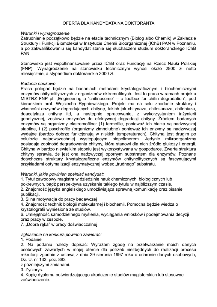 OFERTA DLA KANDYDATA NA DOKTORANTA Warunki i wynagrodzenie Zatrudnienie początkowo będzie na etacie technicznym (Biolog albo Chemik) w Zakładzie Struktury i Funkcji Biomolekuł w Instytucie Chemii Bioorganicznej (IChB) PAN w Poznaniu, a po zakwalifikowaniu się kandydat stanie się słuchaczem studium doktoranckiego IChB PAN. Stanowisko jest współfinansowane przez IChB oraz Fundację na Rzecz Nauki Polskiej (FNP). Wynagrodzenie na stanowisku technicznym wynosi około 2800 zł netto miesięcznie, a stypendium doktoranckie 3000 zł. Badania naukowe Praca polegać będzie na badaniach metodami krystalograficznymi i biochemicznymi enzymów chitynolitycznych z organizmów ektremofilnych. Jest to praca w ramach projektu MISTRZ FNP pt. „Engineering a “chitinosome” – a toolbox for chitin degradation”, pod kierunkiem prof. Wojciecha Rypniewskiego. Projekt ma na celu zbadanie struktury i własności enzymów degradujących chitynę, takich jak chitynaza, chitosanaza, chitobiaza, deacetylaza chityny itd, a następnie opracowanie, z wykorzystaniem inżynierii genetycznej, zestawu enzymów do efektywnej degradacji chityny. Źródłem badanych enzymów są organizmy ekstremofilne: (1) termofile, ponieważ ich białka są nadzwyczaj stabilne, i (2) psychrofile (organizmy zimnolubne) ponieważ ich enzymy są nadzwyczaj wydajne (bardzo dobrze funkcjonują w niskich temperaturach). Chityna jest drugim po celulozie najpowszechniej występującym biopolimerem. Jedynie mikroorganizmy posiadają zdolność degradowania chityny, która stanowi dla nich źródło glukozy i energii. Chityna w bardzo niewielkim stopniu jest wykorzystywana w gospodarce. Zwarta struktura chityny sprawia, że jest ona nadzwyczaj opornym substratem dla enzymów. Poznane dotychczas struktury krystalograficzne enzymów chitynolitycznych są fascynującymi przykładami optymalizacji enzymatycznej wobec „trudnego” substratu. Warunki, jakie powinien spełniać kandydat: 1. Tytuł zawodowy magistra w dziedzinie nauk chemicznych, biologicznych lub pokrewnych, bądź perspektywa uzyskanie takiego tytułu w najbliższym czasie. 2. Znajomość języka angielskiego umożliwiająca sprawną komunikację oraz pisanie publikacji. 3. Silna motywacja do pracy badawczej 4. Znajomość technik biologii molekularnej i biochemii. Pomocna będzie wiedza o krystalografii wyniesiona ze studiów. 6. Umiejętność samodzielnego myślenia, wyciągania wniosków i podejmowania decyzji oraz pracy w zespole. 7. „Dobra ręka” w pracy doświadczalnej Zgłoszenie na konkurs powinno zawierać: 1. Podanie 2. Na podaniu należy dopisać: Wyrażam zgodę na przetwarzanie moich danych osobowych zawartych w mojej ofercie dla potrzeb niezbędnych do realizacji procesu rekrutacji zgodnie z ustawą z dnia 29 sierpnia 1997 roku o ochronie danych osobowych, Dz. U. nr 133, poz. 883 z późniejszymi zmianami. 3. Życiorys. 4. Kopię dyplomu potwierdzającego ukończenie studiów magisterskich lub stosowne zaświadczenie. 6. Dane kontaktowe co najmniej dwóch osób mogących wystawić referencje. Zgłoszenie na konkurs należy przesłać e-mailowo na adres: [email protected] Proszę nie przysyłać oryginałów dokumentów. Termin składania dokumentów upływa 30 czerwca 2016 r. Początek zatrudnienia przewiduje się na lipiec/sierpień 2016 r. Instytut nie zapewnia mieszkania. Rekrutacja polega na rozmowie kwalifikacyjnej, w czasie której kandydat dokona prezentacji swoich dotychczasowych osiągnięć i aspiracji. W późniejszym terminie odbędzie się egzamin na studium doktoranckie, wg regulaminu studium IChB PAN. Dodatkowych informacji udziela kierownik zakładu prof. dr hab. Wojciech Rypniewski, [email protected]