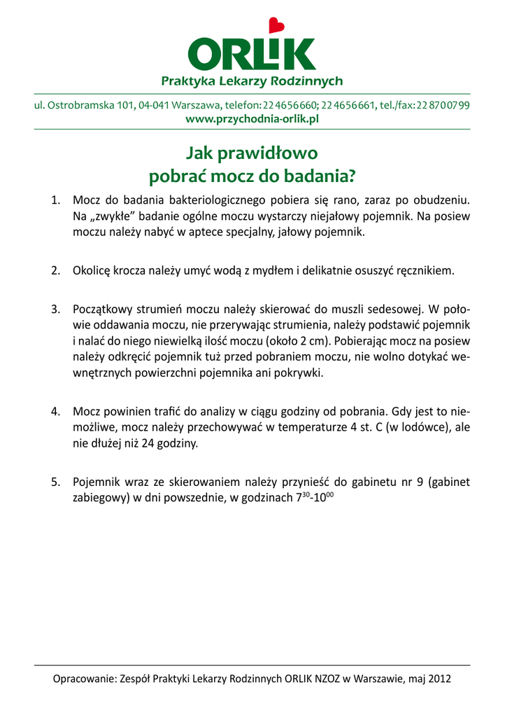 ul. Ostrobramska 101, 04-041 Warszawa, telefon: 22 46 56 660; 22 46 56 661, tel./fax: 22 870 07 99 www.przychodnia-orlik.pl Jak prawidłowo pobrać mocz do badania? 1. Mocz do badania bakteriologicznego pobiera się rano, zaraz po obudzeniu. Na „zwykłe” badanie ogólne moczu wystarczy niejałowy pojemnik. Na posiew moczu należy nabyć w aptece specjalny, jałowy pojemnik. 2. Okolicę krocza należy umyć wodą z mydłem i delikatnie osuszyć ręcznikiem. 3. Początkowy strumień moczu należy skierować do muszli sedesowej. W połowie oddawania moczu, nie przerywając strumienia, należy podstawić pojemnik i nalać do niego niewielką ilość moczu (około 2 cm). Pobierając mocz na posiew należy odkręcić pojemnik tuż przed pobraniem moczu, nie wolno dotykać wewnętrznych powierzchni pojemnika ani pokrywki. 4. Mocz powinien trafić do analizy w ciągu godziny od pobrania. Gdy jest to niemożliwe, mocz należy przechowywać w temperaturze 4 st. C (w lodówce), ale nie dłużej niż 24 godziny. 5. Pojemnik wraz ze skierowaniem należy przynieść do gabinetu nr 9 (gabinet zabiegowy) w dni powszednie, w godzinach 730-1000 Opracowanie: Zespół Praktyki Lekarzy Rodzinnych ORLIK NZOZ w Warszawie, maj 2012 ul. Ostrobramska 101, 04-041 Warszawa, telefon: 22 46 56 660; 22 46 56 661, tel./fax: 22 870 07 99 www.przychodnia-orlik.pl Jak prawidłowo pobrać mocz do badania u dziecka? 1. Mocz do badania bakteriologicznego pobiera się rano, zaraz po obudzeniu. Na „zwykłe” badanie ogólne moczu wystarczy niejałowy pojemnik. Na posiew moczu należy nabyć w aptece specjalny, jałowy pojemnik. 2. Nie zaleca się stosowania woreczków przyklejanych na okolicę krocza. 3. Jeśli już zlecono leczenie antybiotykiem pobranie moczu musi nastąpić przed podaniem pierwszej dawki leku. 4. Na 10-20 minut przed pobraniem należy obficie napoić dziecko wodą. 5. Przed pobraniem dokładnie umyć okolicę krocza wodą z mydłem. • U dziewczynek należy rozchylić wargi sromowe i delikatnie przetrzeć okolicę ruchem od góry do dołu (w kierunku odbytu). • U chłopców należy odprowadzić napletek (jeśli to możliwe) i usunąć gromadzącą się tam białawą substancję (mastkę). Jeśli odprowadzenie napletka nie jest możliwe, należy tylko umyć okolicę cewki moczowej. • Osuszyć ręcznikiem poprzez dotykanie, nie pocieranie. • Następnie należy polać okolicę krocza 0,1% roztworem Rivanolu (do kupienia w aptekach bez recepty). Nie osuszać. 6. Pobierając mocz na posiew należy odkręcić pojemnik tuż przed pobraniem moczu, nie wolno dotykać wewnętrznych powierzchni pojemnika ani pokrywki. 7. Pierwszą porcję moczu (przez 1 sekundę) dziecko powinno oddać do pieluszki, następnie należy podstawić pojemnik i pobrać niewielką ilość moczu (ok. 1 cm) 8. Mocz powinien trafić do analizy w ciągu godziny od pobrania. Gdy jest to niemożliwe, mocz należy przechowywać w temperaturze 4 st. C (w lodówce), ale nie dłużej niż 24 godziny. 9. Pojemnik wraz ze skierowaniem należy przynieść do gabinetu nr 9 (gabinet zabiegowy) w dni powszednie, w godzinach 730-1000 Opracowanie: Zespół Praktyki Lekarzy Rodzinnych ORLIK NZOZ w Warszawie, maj 2012