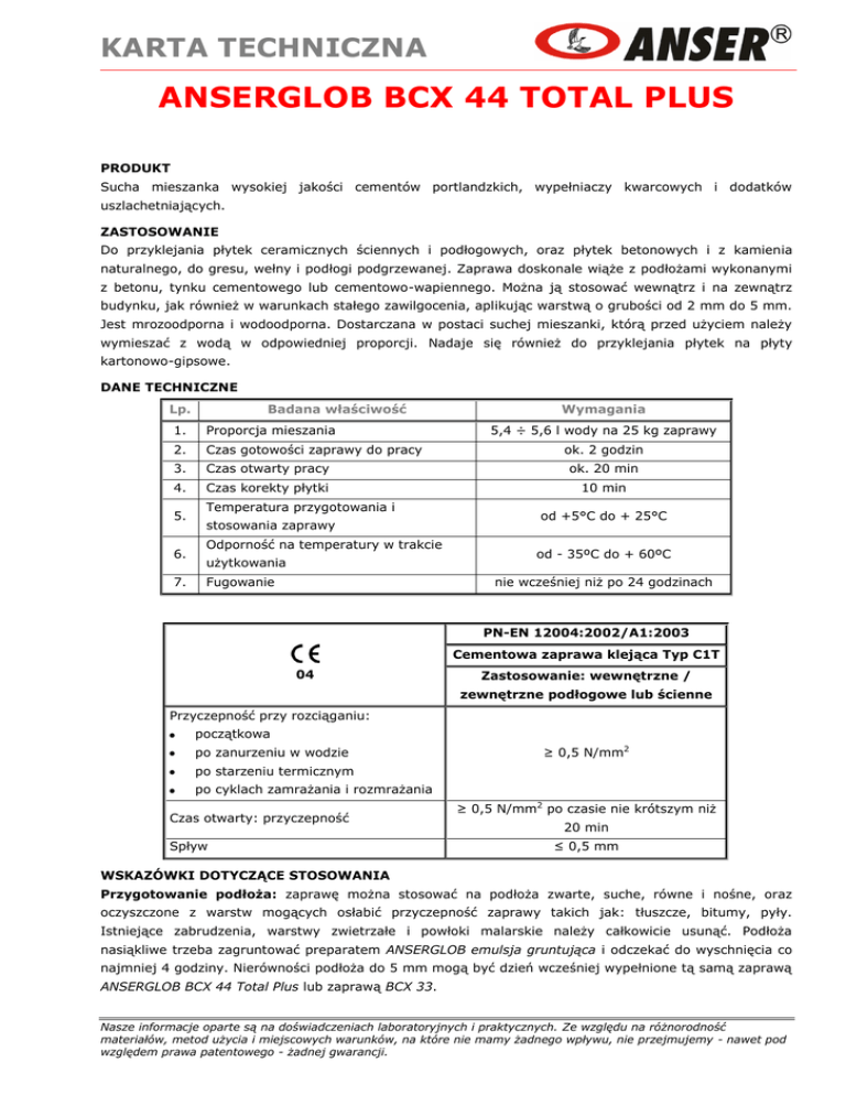 KARTA TECHNICZNA ANSERGLOB BCX 44 TOTAL PLUS PRODUKT Sucha mieszanka wysokiej jakości cementów portlandzkich, wypełniaczy kwarcowych i dodatków uszlachetniających. ZASTOSOWANIE Do przyklejania płytek ceramicznych ściennych i podłogowych, oraz płytek betonowych i z kamienia naturalnego, do gresu, wełny i podłogi podgrzewanej. Zaprawa doskonale wiąże z podłożami wykonanymi z betonu, tynku cementowego lub cementowo-wapiennego. Można ją stosować wewnątrz i na zewnątrz budynku, jak również w warunkach stałego zawilgocenia, aplikując warstwą o grubości od 2 mm do 5 mm. Jest mrozoodporna i wodoodporna. Dostarczana w postaci suchej mieszanki, którą przed użyciem należy wymieszać z wodą w odpowiedniej proporcji. Nadaje się również do przyklejania płytek na płyty kartonowo-gipsowe. DANE TECHNICZNE Lp. Badana właściwość Wymagania 1. Proporcja mieszania 2. Czas gotowości zaprawy do pracy 3. Czas otwarty pracy ok. 20 min 4. Czas korekty płytki 10 min 5. 6. 7. Temperatura przygotowania i stosowania zaprawy Odporność na temperatury w trakcie użytkowania Fugowanie 5,4 ÷ 5,6 l wody na 25 kg zaprawy ok. 2 godzin od +5°C do + 25°C od - 35ºC do + 60ºC nie wcześniej niż po 24 godzinach PN-EN 12004:2002/A1:2003 Cementowa zaprawa klejąca Typ C1T 04 Zastosowanie: wewnętrzne / zewnętrzne podłogowe lub ścienne Przyczepność przy rozciąganiu: początkowa po zanurzeniu w wodzie ≥ 0,5 N/mm2 po starzeniu termicznym po cyklach zamrażania i rozmrażania Czas otwarty: przyczepność Spływ ≥ 0,5 N/mm2 po czasie nie krótszym niż 20 min ≤ 0,5 mm WSKAZÓWKI DOTYCZĄCE STOSOWANIA Przygotowanie podłoża: zaprawę można stosować na podłoża zwarte, suche, równe i nośne, oraz oczyszczone z warstw mogących osłabić przyczepność zaprawy takich jak: tłuszcze, bitumy, pyły. Istniejące zabrudzenia, warstwy zwietrzałe i powłoki malarskie należy całkowicie usunąć. Podłoża nasiąkliwe trzeba zagruntować preparatem ANSERGLOB emulsja gruntująca i odczekać do wyschnięcia co najmniej 4 godziny. Nierówności podłoża do 5 mm mogą być dzień wcześniej wypełnione tą samą zaprawą ANSERGLOB BCX 44 Total Plus lub zaprawą BCX 33. Nasze informacje oparte są na doświadczeniach laboratoryjnych i praktycznych. Ze względu na różnorodność materiałów, metod użycia i miejscowych warunków, na które nie mamy żadnego wpływu, nie przejmujemy - nawet pod względem prawa patentowego - żadnej gwarancji. KARTA TECHNICZNA Przygotowanie zaprawy i sposób użycia: suchą mieszankę zaprawy klejowej wsypać do odpowiedniej ilości wody i wymieszać intensywnie wiertarką wyposażoną w mieszadło koszyczkowe, aż do uzyskania jednorodnej masy bez grudek. Odczekać 3 minuty do ustabilizowania się konsystencji, po czym wymieszać ponownie. Tak przygotowana zaprawa może być zużywana nie dłużej niż 2 godziny. Zaprawę nanieść na podłoże gładką pacą stalową, a następnie rozprowadzić używając pacy ząbkowanej. Wielkość zębów pacy zależy od wielkości płytek. Prawidłowo dobrane: konsystencja i wielkość zębów pacy sprawiają, że dociśnięta typowa płytka ceramiczna nie spływa z płaszczyzny pionowej, a zaprawa pokrywa min. 65 % powierzchni spodu płytki. Większe płytki lekko posmarować zaprawą. Płytek nie moczyć w wodzie! Układać je na zaprawie i dociskać, póki jeszcze zaprawa lepi się do rąk (przed upływem czasu naskórkowania). Nie układać płytek na styk! Zachować szerokość spoin w zależności od wielkości płytek. Fugowanie okładziny można rozpocząć po stwardnieniu zaprawy, nie wcześniej niż po 24 godzinach. Świeże zabrudzenia zaprawą zmywać wodą, a stwardniałe usuwać mechanicznie. ZUŻYCIE: Rodzaj płytki Wymiar zębów pacy Przybliżone zużycie zaprawy BCX 44 [kg/m2] Płytki o boku do 10 cm 4 mm 2,2 ÷ 3,5 Płytki o boku do 15 cm 6 mm 2,5 ÷ 4,5 Płytki o boku do 25 cm 8 mm 3,2 ÷ 5,5 Płytki o boku do 30 cm 10 mm 3,8 ÷ 6,5 Uwaga: Niniejsza instrukcja określa zakres stosowania materiału i zalecany sposób prowadzenia robót, ale nie może zastąpić zawodowego przygotowania wykonawcy. Oprócz podanych zaleceń prace należy wykonywać zgodnie ze sztuką budowlaną i zasadami BHP. MAGAZYNOWANIE Przechowywać w oryginalnie zamkniętych opakowaniach, w suchych przewiewnych pomieszczeniach nie dłużej niż 12 miesięcy od daty produkcji. Chronić przed zawilgoceniem. GWARANCJA Producent przyjmuje odpowiedzialność gwarancyjną za jakość produktu jedynie w przypadku zastosowania się użytkownika do zaleceń instrukcji producenta, przy jednoczesnym przestrzeganiu podstawowych zasad sztuki budowlanej i zasad BHP. OPAKOWANIE Dwuwarstwowe worki papierowe z przekładką PE – 25 kg. ATESTY Wyrób spełnia wymagania PN-EN 12004:2002/A1:2003 dla kleju cementowego typu C1T Zakłady Chemiczne ANSER sp. z o.o. Biuro Zarządu: 96-315 Wiskitki, ul. Chemików 1 Dział Doradztwa Technicznego i Reklamacji: tel.: (046) 856 73 40, faks: (046) 856 73 50. Nasze informacje oparte są na doświadczeniach laboratoryjnych i praktycznych. Ze względu na różnorodność materiałów, metod użycia i miejscowych warunków, na które nie mamy żadnego wpływu, nie przejmujemy - nawet pod względem prawa patentowego - żadnej gwarancji. KARTA TECHNICZNA Nasze informacje oparte są na doświadczeniach laboratoryjnych i praktycznych. Ze względu na różnorodność materiałów, metod użycia i miejscowych warunków, na które nie mamy żadnego wpływu, nie przejmujemy - nawet pod względem prawa patentowego - żadnej gwarancji.