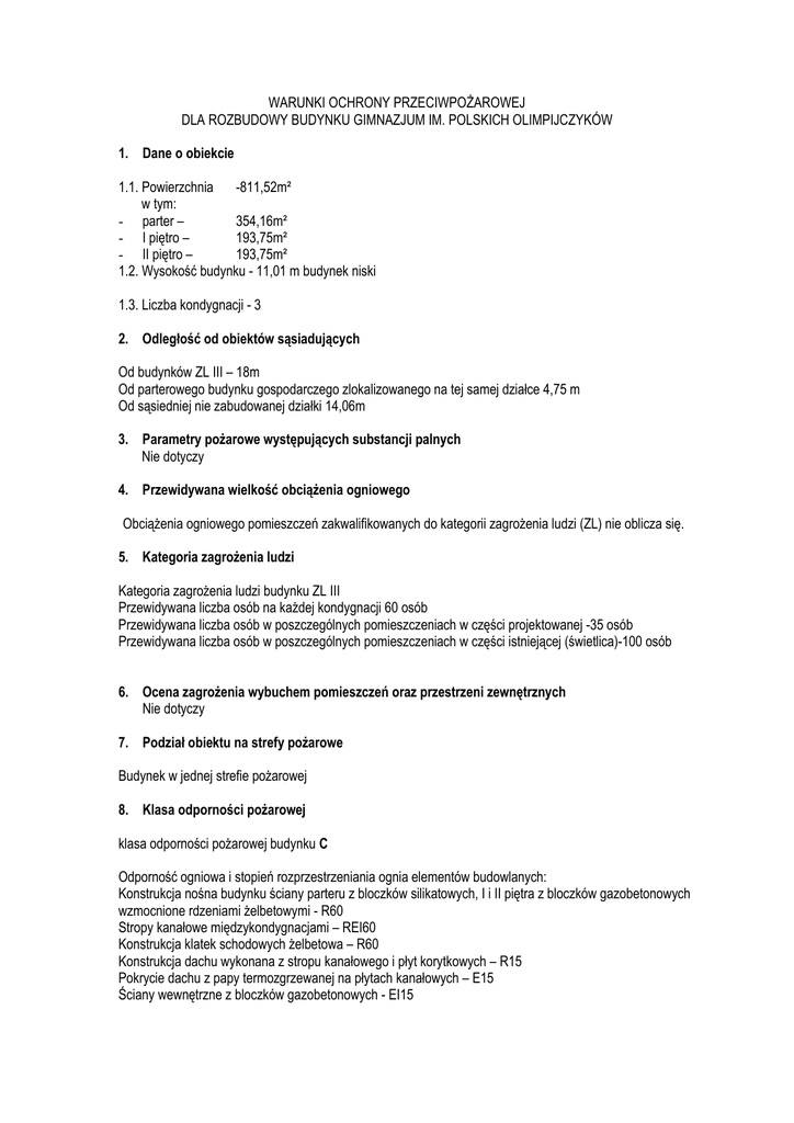WARUNKI OCHRONY PRZECIWPOśAROWEJ DLA ROZBUDOWY BUDYNKU GIMNAZJUM IM. POLSKICH OLIMPIJCZYKÓW 1. Dane o obiekcie 1.1. Powierzchnia -811,52m² w tym: - parter – 354,16m² - I piętro – 193,75m² - II piętro – 193,75m² 1.2. Wysokość budynku - 11,01 m budynek niski 1.3. Liczba kondygnacji - 3 2. Odległość od obiektów sąsiadujących Od budynków ZL III – 18m Od parterowego budynku gospodarczego zlokalizowanego na tej samej działce 4,75 m Od sąsiedniej nie zabudowanej działki 14,06m 3. Parametry poŜarowe występujących substancji palnych Nie dotyczy 4. Przewidywana wielkość obciąŜenia ogniowego ObciąŜenia ogniowego pomieszczeń zakwalifikowanych do kategorii zagroŜenia ludzi (ZL) nie oblicza się. 5. Kategoria zagroŜenia ludzi Kategoria zagroŜenia ludzi budynku ZL III Przewidywana liczba osób na kaŜdej kondygnacji 60 osób Przewidywana liczba osób w poszczególnych pomieszczeniach w części projektowanej -35 osób Przewidywana liczba osób w poszczególnych pomieszczeniach w części istniejącej (świetlica)-100 osób 6. Ocena zagroŜenia wybuchem pomieszczeń oraz przestrzeni zewnętrznych Nie dotyczy 7. Podział obiektu na strefy poŜarowe Budynek w jednej strefie poŜarowej 8. Klasa odporności poŜarowej klasa odporności poŜarowej budynku C Odporność ogniowa i stopień rozprzestrzeniania ognia elementów budowlanych: Konstrukcja nośna budynku ściany parteru z bloczków silikatowych, I i II piętra z bloczków gazobetonowych wzmocnione rdzeniami Ŝelbetowymi - R60 Stropy kanałowe międzykondygnacjami – REI60 Konstrukcja klatek schodowych Ŝelbetowa – R60 Konstrukcja dachu wykonana z stropu kanałowego i płyt korytkowych – R15 Pokrycie dachu z papy termozgrzewanej na płytach kanałowych – E15 Ściany wewnętrzne z bloczków gazobetonowych - EI15 9. Warunki ewakuacji długość przejść w pomieszczeniach do 40m, długość dojść ewakuacyjnych 30 m przy jednym wyjściu, 60m przy dwóch wyjściach, szerokości dróg ewakuacyjnych powyŜej 1,40m i wyjść z pomieszczeń powyŜej 90 cm, drzwi otwierane na zewnątrz pomieszczeń bibliotecznych i sal lekcyjnych, min. dwa wyjścia ewakuacyjne z pomieszczeń świetlicy na parterze, dwie klatki schodowe nieobudowane tym jedna istniejąca i jedna projektowana zgodnie z obowiązującymi przepisami techniczno-budowlanymi, wyjście na dach zapewnione z istniejącej klatki schodowej. Oznakowanie na potrzeby ewakuacji dróg i pomieszczeń. Obiekt wyposaŜony w oświetlenie ewakuacyjne. - 10. Zabezpieczenia przeciwpoŜarowe instalacji uŜytkowych Wentylacyjnej – wentylacja grawitacyjna wykonana w sposób standartowy Ogrzewczej – instalacja wodna wykonana w sposób standartowy Gazowej- nie dotyczy Elektroenergetycznej – istniejący w obiekcie p.poŜ wyłącznik prądu Odgromowej – instalacja wykonana w sposób standartowy 11. Urządzenia przeciwpoŜarowe w obiekcie Instalacja sygnalizacyjna alarmu poŜarowego. Instalacja wodociągowa przeciwpoŜarowa na kaŜdej kondygnacji przy klatce schodowej hydranty wewnętrzne DN 25 z węŜem półsztywnym z prądownicą na strumień rozproszony. 12. Podręczny sprzęt gaśniczy i urządzenia ratownicze Podręczny sprzęt gaśniczy - gaśnice ABC Szczegółowy wykaz podręcznego sprzętu gaśniczego i jego rozmieszczenie powinno być ustalone w instrukcji bezpieczeństwa poŜarowego opracowanej dla obiektu. 13. Zaopatrzenie w wodę do zewnętrznego gaszenia poŜaru Zapotrzebowanie na wodę do celów przeciwpoŜarowych do zewnętrznego gaszenia poŜaru wynosi 20 dm³/s. Ilość tę zapewnia sieć hydrantów p-poŜ usytuowanych na sieci wodociągowej miejskiej. 14. Drogi poŜarowe Drogi poŜarowe nie są wymagane.