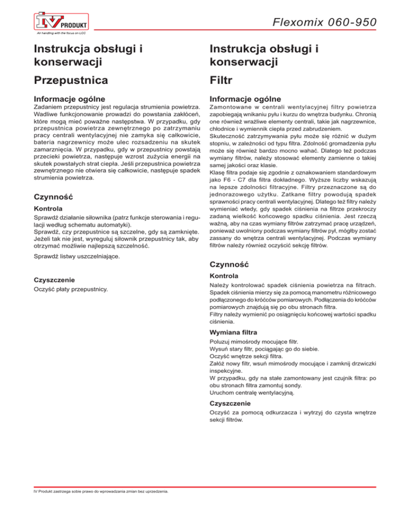 Flexomix 060-950 Instrukcja!obs ugi!i! konserwacji Instrukcja!obs ugi!i! konserwacji Przepustnica Filtr Informacje!ogólne Informacje!ogólne Zadaniem przepustnicy jest regulacja strumienia powietrza. Wadliwe funkcjonowanie prowadzi do powstania zak!óce), które mog% mie$ powa#ne nast"pstwa. W przypadku, gdy przepustnica powietrza zewn"trznego po zatrzymaniu pracy centrali wentylacyjnej nie zamyka si" ca!kowicie, bateria nagrzewnicy mo#e ulec rozsadzeniu na skutek zamarzni"cia. W przypadku, gdy w przepustnicy powstaj% przecieki powietrza, nast"puje wzrost zu#ycia energii na skutek powsta!ych strat ciep!a. Je&li przepustnica powietrza zewn"trznego nie otwiera si" ca!kowicie, nast"puje spadek strumienia powietrza. Zamontowane w centrali wentylacyjnej filtry powietrza zapobiegaj% wnikaniu py!u i kurzu do wn"trza budynku. Chroni% one równie# wra#liwe elementy centrali, takie jak nagrzewnice, ch!odnice i wymiennik ciep!a przed zabrudzeniem. Skuteczno&$ zatrzymywania py!u mo#e si" ró#ni$ w du#ym stopniu, w zale#no&ci od typu ?ltra. Zdolno&$ gromadzenia py!u mo#e si" równie# bardzo mocno waha$. Dlatego te# podczas wymiany ?ltrów, nale#y stosowa$ elementy zamienne o takiej samej jako&ci oraz klasie. Klas" ?ltra podaje si" zgodnie z oznakowaniem standardowym jako F6 - C7 dla ?ltra dok!adnego. Wy#sze liczby wskazuj% na lepsze zdolno&ci filtracyjne. Filtry przeznaczone s% do jednorazowego u#ytku. Zatkane filtry powoduj% spadek sprawno&ci pracy centrali wentylacyjnej. Dlatego te# ?ltry nale#y wymienia$ wtedy, gdy spadek ci&nienia na ?ltrze przekroczy zadan% wielko&$ ko)cowego spadku ci&nienia. Jest rzecz% wa#n%, aby na czas wymiany ?ltrów zatrzyma$ prac" urz%dze), poniewa# uwolniony podczas wymiany ?ltrów py!, móg!by zosta$ zassany do wn"trza centrali wentylacyjnej. Podczas wymiany ?ltrów nale#y równie# oczy&ci$ sekcj" ?ltrów. Czynno#$ Kontrola Sprawd> dzia!anie si!ownika ;patrz funkcje sterowania i regulacji wed!ug schematu automatyki<. Sprawd>, czy przepustnice s% szczelne, gdy s% zamkni"te. Je#eli tak nie jest, wyreguluj si!ownik przepustnicy tak, aby otrzyma$ mo#liwie najlepsz% szczelno&$. Sprawd> listwy uszczelniaj%ce. Czynno#$ Czyszczenie Oczy&$ p!aty przepustnicy. Kontrola Nale#y kontrolowa$ spadek ci&nienia powietrza na filtrach. Spadek ci&nienia mierzy si" za pomoc% manometru ró#nicowego pod!%czonego do kró$ców pomiarowych. Pod!%czenia do kró$ców pomiarowych znajduj% si" po obu stronach ?ltra. Filtry nale#y wymieni$ po osi%gni"ciu ko)cowej warto&ci spadku ci&nienia. Wymiana!"!ltra Poluzuj mimo&rody mocuj%ce ?ltr. Wysu) stary ?ltr, poci%gaj%c go do siebie. Oczy&$ wn"trze sekcji ?ltra. Za!ó# nowy ?ltr, wsu) mimo&rody mocuj%ce i zamknij drzwiczki inspekcyjne. W przypadku, gdy na sta!e zamontowany jest czujnik ?ltra: po obu stronach ?ltra zamontuj sondy. Uruchom central" wentylacyjn%. Czyszczenie Oczy&$ za pomoc% odkurzacza i wytrzyj do czysta wn"trze sekcji ?ltrów. IV Produkt zastrzega sobie prawo do wprowadzania zmian bez uprzedzenia.