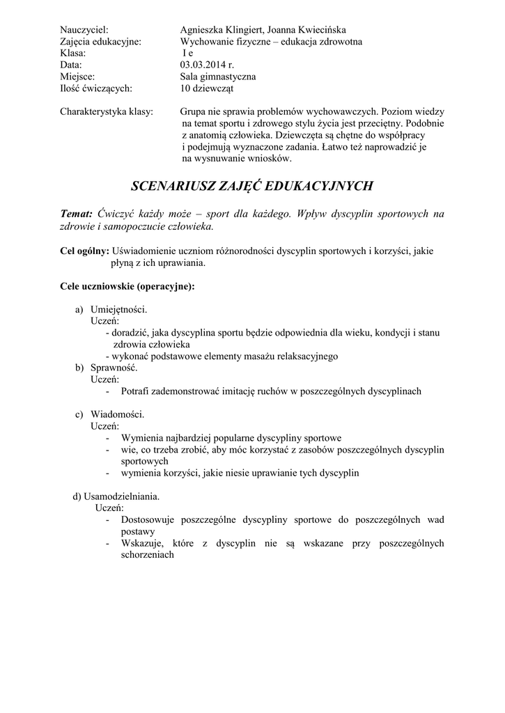 Nauczyciel: Zajęcia edukacyjne: Klasa: Data: Miejsce: Ilość ćwiczących: Agnieszka Klingiert, Joanna Kwiecińska Wychowanie fizyczne – edukacja zdrowotna Ie 03.03.2014 r. Sala gimnastyczna 10 dziewcząt Charakterystyka klasy: Grupa nie sprawia problemów wychowawczych. Poziom wiedzy na temat sportu i zdrowego stylu życia jest przeciętny. Podobnie z anatomią człowieka. Dziewczęta są chętne do współpracy i podejmują wyznaczone zadania. Łatwo też naprowadzić je na wysnuwanie wniosków. SCENARIUSZ ZAJĘĆ EDUKACYJNYCH Temat: Ćwiczyć każdy może – sport dla każdego. Wpływ dyscyplin sportowych na zdrowie i samopoczucie człowieka. Cel ogólny: Uświadomienie uczniom różnorodności dyscyplin sportowych i korzyści, jakie płyną z ich uprawiania. Cele uczniowskie (operacyjne): a) Umiejętności. Uczeń: - doradzić, jaka dyscyplina sportu będzie odpowiednia dla wieku, kondycji i stanu zdrowia człowieka - wykonać podstawowe elementy masażu relaksacyjnego b) Sprawność. Uczeń: - Potrafi zademonstrować imitację ruchów w poszczególnych dyscyplinach c) Wiadomości. Uczeń: - Wymienia najbardziej popularne dyscypliny sportowe - wie, co trzeba zrobić, aby móc korzystać z zasobów poszczególnych dyscyplin sportowych - wymienia korzyści, jakie niesie uprawianie tych dyscyplin d) Usamodzielniania. Uczeń: - Dostosowuje poszczególne dyscypliny sportowe do poszczególnych wad postawy - Wskazuje, które z dyscyplin nie są wskazane przy poszczególnych schorzeniach Materiał nauczania: Czas realizacji zajęć: Środki dydaktyczne: wpływ uprawiania poszczególnych dyscyplin sportowych na zdrowie i samopoczucie człowieka Odnowa biologiczna – masaż relaksacyjny. 45 minut kartony do pracy w grupach, markery, taśma klejąca, nożyczki, oliwka do masażu Sposoby pomiaru i ewaluacji osiąganych celów nauczyciela: obserwacja pracy uczniów w grupach, obserwacja aktywności poszczególnych osób na lekcji (dochodzenie do wniosków, zabieranie głosu), nagradzanie osób referujących pracę w grupie. Część lekcji Czynności uczniów Docelowe Zadania Zapoznaje Uczeń: Część wstępna się z zadaniem - słucha informacji lekcji. nauczyciela, - przygotowuje się do aktywnego uczestnictwa w lekcji. Część główna Uczeń zapoznaje się z pojęciami dotyczącymi dyscyplin sportowych Zapoznaje się z pojęciem odnowy biologicznej - uczeń wymienia znane mu dyscypliny sportowe - wymienia te, które sam uprawia i podaje przyczyny, dla których to robi - słucha informacji uzupełniających podawanych mu przez nauczyciela - pracując w grupach zastanawia się nad kosztami, jakie ponosi uprawiający dany sport, a następnie nad korzyściami wypływającymi z uprawiania danej dyscypliny - porównuje koszty z korzyściami - na forum referuje wyniki pracy zespołu - uczy się podstawowych elementów masażu relaksacyjnego Czynności nauczyciela - Sprawdza listę obecności i gotowość uczniów do zajęć, - motywuje uczniów do lekcji wyjaśniając znaczenie ruchu dla zdrowia człowieka - zadaje uczniom pytania związane z przebiegiem poprzedniej lekcji: elementy narządu ruchu, budowa kręgosłupa, choroby narządu ruchu, grupy społeczne szczególnie na nie narażone, wpływ ruchu na organizm człowieka - prowadzi burzę mózgów podając pytania pomocnicze - uzupełnia informacje o dyscyplinach - kontroluje przebieg pracy w grupach - uświadamia istotę współpracy uczniów - koryguje błędy - odpowiada na pytania i wyjaśnia wątpliwości - aktywizuje uczniów i naprowadza - słucha podsumowania - przedstawia pojęcie odnowy biologicznej, w szczególności masażu relaksacyjnego jako jedną z form pomocy przy napięciu mięśniowym i pozbywaniu się wad postawy Metody i formy Pogadanka Pogadanka Burza mózgów Zadaniowaścisła Naśladowcz a ścisła Część końcowa Powtarza materiał zgromadzony w czasie zajęć - wymienia dyscypliny - zadaje pytania pomocnicze sportowe - nagradza najbardziej Pogadanka - podaje korzyści płynące aktywnych podczas zajęć. z uprawiania sportu - podsumowuje zajęcia. - wymienia techniki masażu relaksacyjnego - podejmuje decyzje o aktywności ruchowej