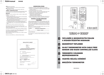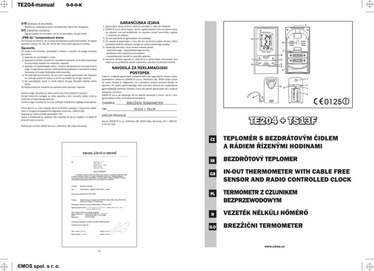 TE204-manual 0-0-0-K GARANCIJSKA IZJAVA BUDILKA ZA DELAVNIKE Budilka je nastavljena samo za delavnike. Mora biti vklopljena. 1. Garancijski rok se prične z dnevom prodaje in velja 24 mesecev. 2. EMOS SI d.o.o. jamči kupcu, da bo v garancijskem roku na lastne stroške odpravil vse pomanjkljivosti na aparatu zaradi tovarniške napake v materialu ali izdelavi. 3. Za čas popravila se garanjcijski rok podaljša. 4. Če aparat ni popravljen v roku 45 dni od dneva prijave okvare, lahko prizadeta stranka zahteva novega ali vračilo plačanega zneska. 5. Garancija preneha, če je okvara nastala zaradi: - nestrokovnega - nepooblaščenega servisa - predelava brez odobritve proizvajalca - neupoštevanje navodil za uporabo aparata. 6. Naravna obraba aparata je izključena iz garancijske obveznosti. Isto velja tudi za poškodbe zaradi nepravilne uporabe ali preobremenitve ENKRATNO ZVONENJE Signal budilke bo enkraten, ne bo se ponavljal v drugih dneh. „PRE AL“ temperaturni alarm Ta funkcija se aktivira, če zunanja temperatura pade pod ledišče. Ta signal se lahko nastavi 15, 30, 45, 60 ali 90 minut pred signalom budilke. Opozorilo Če boste s termometer uporabljali v skladu z navodili, bo dolgo zanesljiv pomočnik. 1. Aparata ne namakajte v vodo. 2. Aparata ne čistite z brusilnimi niti jedkimi pripravki. Le-ti lahko opraskajo ali povzročijo razjedo na materialu naprave. 3. Aparata ne izpostavljajte prahu, visokim temperaturam ali prekomerni vlagi. V nasprotnem primeru lahko pride do poškodb in naknadnih motenj delovanja ali krajše življenjske dobe aparata. 4. Ne odpirajte termometra, ker se s tem ukinete garancijski rok. Naprava ne vsebuje sestavnih delov, ki bi bili uporabljivi za drugo napravo. 5. Ne uporabljajte starih in novih baterij skupaj. Starejša baterija lahko steče. Temeljito preberite navodila za uporabo pred uporabo naprave. NAVODILA ZA REKLAMACIJSKI POSTOPEK Lastnik uveljavlja garancijski zahtevek tako, da ugotovljeno okvaro prijavi pooblaščeni delavnici (EMOS SI d.o.o., Kidričeva 38, 3000 Celje) pisno ali ustno. Kupec je odgovoren, če s prepozno prijavo povzroči škodo na aparatu. Po izteku garancijskega roka preneha pravica do uveljavljenja garancijskega zahtevka. Priložen mora biti potrjen garancijski list z original potrjenim računom. EMOS SI d.o.o. se obvezuje, da bo aparat zamenjal z novim, če ta v tem garancijskem roku ne bi deloval brezhibno. Vsebina tega navodila se lahko spreminja brez dodatnih opozoril. Zaradi tiskovnih razlogov se slika aparata v tem navodilu lahko zmerno razlikuje od dejanskega aparata. Vsebina tega navodila se ne sme razširjati naprej brez soglasja proizvajalca. ZNAMKA: Emos spol.s r.o. s tem izjavlja, da je ta TE204 vusklajen z osnovnimi zahtevami in drugimi pripadajočimi regulativi smernice 1999/5/ES. Napravo je možno prosto sprovajati v EU. Izjava o skladnosti je sestavni del navodila ali pa jo najdete na spletnih straneh www.emos.cz TIP: BREZŽIČNI TERMOMETER TE204 + TS13F DATUM PRODAJE: TE204 + TS13F Servis: EMOS SI d.o.o., Kidričeva 38, 3000 Celje, Slovenija, Tel: + 386 (0) 3 42 42 420 Distributer za SLO: EMOS SI d.o.o., Kidričeva 38, Celje, Slovenija CZ TEPLOMĚR S BEZDRÁTOVÝM ČIDLEM A RÁDIEM ŘÍZENÝMI HODINAMI SK BEZDRÔTOVÝ TEPLOMER GB IN-OUT THERMOMETER WITH CABLE FREE SENSOR AND RADIO CONTROLLED CLOCK PL H SLO TERMOMETR Z CZUJNIKEM BEZPRZEWODOWYM VEZETÉK NÉLKÜLI HŐMÉRŐ BREZŽIČNI TERMOMETER www.emos.cz 12 EMOS spol. s r. o. TE204-manual 0-0-0-K CZ TEPLOMĚR S HODINAMI TE204 + BEZDRÁTOVÉ ČIDLO TS13F Základní jednotka zobrazuje vnitřní teplotu, venkovní teplotu, přenášenou maximálně třemi čidly a čas nebo kalendář. Ukládá do paměti maximální a minimální naměřenou teplotu. Signál budíku má vzrůstající hlasitost a trvá 2 minuty. Balení obsahuje základní jednotku s teploměrem a rádiem řízenými hodinami a bezdrátové čidlo (433 MHz). Není potřeba instalace pomocí kabelů. Součástí balení je též externí drátová sonda. Před použitím zařízení si důkladně přečtěte návod k použití. Technické parametry Postup Měření teploty základní jednotka: 1. Vložte baterie nejprve do bezdrátových čidel a teprve potom do základní jednotky. Pro kontrolu funkce umístěte základní jednotku co nejblíže bezdrátovému čidlu. 2. Umístěte bezdrátové čidlo do vhodné vzdálenosti od základní jednotky. Vhodná vzdálenost záleží na stavebním materiálu, který je mezi základní jednotkou a čidlem. Zkuste několik umístění. I když jsou čidla odolná proti vodě, neměla by být vystavena přímému dešti, sněhu ani slunci. Nevhodné je umístění na jakýkoliv kovový materiál. rozsah měření vnitřní teploty: -10 až +60 °C rozlišení: 0,1 °C bezdrátové čidlo: rozsah měření: - 20 až +60 °C rozlišení: 0,1°C přesnost měření: 0 až +40 °C ±1 °C -20 až 0 °C ±2 °C frekvence přenosu RF: 433 MHz dosah: max. 30 m ve volném prostoru počet bezdrátových čidel: max. 3; jedno součástí dodávky cyklus měření teploty: 43 - 47 sekund externí drátová sonda: délka cca 3 m (lze připojit jako vodotěsné čidlo) rozsah měření: - 50 °C – +60 °C přesnost měření 0 až +40 °C ±1 °C -50 až 0 °C; +40 až 60 °C ±2 °C Kalendář/hodiny display: zobrazuje hodiny - minuty výběr 12 nebo 24 hodinového formátu formát data: den - měsíc nebo měsíc - den pět jazyků pro nastavení dnů v týdnu budík: funkce snooze a dvouminutový zesilující se signál Napájení základní jednotka: 2 ks baterií typu UM-3 nebo AA 1,5V bezdrátové čidlo: 2 ks baterií typu UM-3 nebo AA 1,5V baterie nejsou součástí dodávky Hmotnost základní jednotka: 117g (bez baterií) bezdrátové čidlo: 60 g (bez baterií) Rozměry základní jednotka: 83(D) x 152(V) x 31(H) mm bezdrátové čidlo: 67(D) x 130(V) x 25(H) mm Vkládání baterií do čidla 1. Uvolněte šroubky bateriového prostoru na zadní str