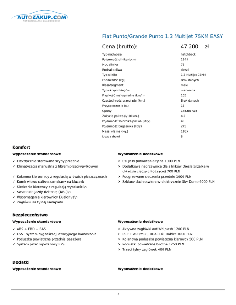 Fiat Punto/Grande Punto 1.3 Multijet 75KM EASY Cena (brutto): 47 200 zł Typ nadwozia hatchback Pojemność silnika (ccm) 1248 Moc silnika 75 Rodzaj paliwa diesel Typ silnika 1.3 Multijet 75KM Ładowność (kg.) Brak danych Klasa/segment małe Typ skrzyni biegów manualna Prędkość maksymalna (km/h) 165 Częstotliwość przeglądu (km.) Brak danych Przyspieszenie (s.) 13 Opony 175/65 R15 Zużycie paliwa (l/100km.) 4.2 Pojemność zbiornika paliwa (litry) 45 Pojemność bagażnika (litry) 275 Masa własna (kg.) 1105 Liczba drzwi 5 Komfort Wyposażenie standardowe Wyposażenie dodatkowe ✓ Elektrycznie sterowane szyby przednie ✕ Czujniki parkowania tylne 1000 PLN ✓ Klimatyzacja manualna z filtrem przeciwpyłkowym ✕ Dodatkowa nagrzewnica dla silników Diesla(grzałka w ✓ Kolumna kierownicy z regulacją w dwóch płaszczyznach ✕ Podgrzewane siedzenia przednie 1000 PLN ✓ Korek wlewu paliwa zamykany na kluczyk ✕ Szklany dach otwierany elektrycznie Sky Dome 4000 PLN układzie cieczy chłodzącej) 700 PLN ✓ Siedzenie kierowcy z regulacją wysokości\n ✓ Światła do jazdy dziennej (DRL)\n ✓ Wspomaganie kierownicy Dualdrive\n ✓ Zagłówki na tylnej kanapie\n Bezpieczeństwo Wyposażenie standardowe Wyposażenie dodatkowe ✓ ABS + EBD + BAS ✕ Aktywne zagłówki antiWhiplash 1200 PLN ✓ ESS - system sygnalizacji awaryjnego hamowania ✕ ESP + ASR/MSR, HBA i Hill Holder 1000 PLN ✓ Poduszka powietrzna przednia pasażera ✕ Kolanowa poduszka powietrzna kierowcy 500 PLN ✓ System przeciwpożarowy FPS ✕ Poduszki powietrzne boczne 1250 PLN ✕ Trzeci tylny zagłówek 400 PLN Dodatki Wyposażenie standardowe Wyposażenie dodatkowe 1 ✓ Automatyczna skrzynia biegów Dualogic (standard dla wersji ✕ Blue&Me™: system głośnomówiący z technologią 1.4 Dualogic) Bluetooth™ z rSAP, przyciskami sterowania w kole kierownicy,zestaw wskaźników z wyświetlaczem wielofunkcyjnym, odtwarzacz MP3 z portem USB i Aux-in ✓ Centralny zamek z pilotem w kluczyku ✕ Dojazdowe 1000 PLN koło zapasowe stalowe z oponą 175/65 R15, prędkość maksymalna 80 km/h 300 PLN ✓ Elektrycznie sterowane i podgrzewane lusterka zewnętrzne, ✕ Elektrycznie sterowane i podgrzewane lusterka zewnętrzne, lakierowane z czujnikiem temp. zewnętrzne (standard dla lakierowane z czujnikiem temp. zewnętrznej (standard dla wersji 1.4 Dualogic, TwinAir i multiAir) wersji 1.4 Dualogic, TwinAir i MultiAir) 300 PLN ✓ Homologacja 5-osobowa ✕ Felgi ze stopów lekkich 15", opony 185/65/15 (175/65/15 dla silnika 1.2, 1.4 bez MTA 1200 PLN ✓ Immobiliser Fiat Code ✕ Felgi ze stopów lekkich 15", opony 185/65/15 14-ramienne bicolore 1200 PLN ✓ Klamki w kolorze nadwozia ✕ Felgi ze stopów lekkich 16",opony 195/55/16 7-ramienne 1600 PLN ✓ Komputer pokładowy z wyświetlaczem piktogramowym ✕ Felgi ze stopów lekkich 17", opony 205/45/17 12-ramienne 2500 PLN ✓ Lusterka boczne elektrycznie sterowane w kolorze czarnym ✕ Gniazdo z zasilaniem 12v w bagażniku 400 PLN (niedostępne dla wersji 1.4 Dualogic, TwinAir i MultiAir) ✓ Poduszka powietrzna przednia kierowcy ✕ Lakier pastelowy/metalizowany 1900 PLN ✓ Przystosowanie do montażu radia (okablowanie + antena + ✕ Listwy boczne ochronne w kolorze nadwozia 400 PLN 6 głośników) ✓ Reflektory przednie z funkcją "Folow Me Home" ✕ Nakładki ozdobne na lusterka wsteczne - chromowane 400 PLN ✓ System Start & Stop (opcjonalnie dla silników 1.2 i 1.3 ✕ Nakładki ozdobne na lusterka wsteczne - czarne 400 PLN Multijet) ✓ Zderzaki w kolorze nadwozia ✕ Pełnowymiarowe koło zapasowe stalowe z oponą 175/65 R15 (niedostępne dla silników TwinAir i MultiAir) 350 PLN ✓ Zestaw naprawczy opon Fix&Go ✕ Pełnowymiarowe koło zapasowe stalowe z oponą 185/65 R15 350 PLN ✕ Podłokietnik przedni ze schowkiem w środku 550 PLN ✕ Przyciemnione szyby boczne tylne i tylna 500 PLN ✕ Przystosowanie do montażu nawigatora Blue&Me TomTom 250 PLN ✕ Spoiler tylny dachowy (lakierowany w kolorze nadwozia) 500 PLN ✕ Spoilery boczne (lakierowane w kolorze nadwozia) 750 PLN ✕ Światła przeciwmgielne przednie z funkcją statycznego doświetlania zakretów 800 PLN ✕ System audio HI-FI firmy Interscope™ (głośniki i subwoofer) 1600 PLN ✕ System Start & Stop opcjonalnie dla silników 1.2 oraz 1.3 Mutijet 1200 PLN ✕ Zawieszenie usportowione 400 PLN Doprecyzowanie oferty ✕ 2 PAKIET EASY PLUS - 3700 PLN 3 dzielone oparcie tylnej kanapy Kurtyny powietrzne Radioodtwarzacz CD+MP3 Skórzana kierownica ✕ PAKIET ZIMOWY - 600 PLN kable z dodatkową izolacją wzmocniony alternator i akumulator ✕ PAKIET DLA PALĄCYCH - 250 PLN Zapalniczka + popielniczka Kontakt: Nazwa użytkownika: admin Nazwa firmy: qqq Adres: qqq 12, 41-706 qqq1, NIP: 954 REGON: 1 Telefon: 123, 1 Fax: 1 Email: 1 www: 4