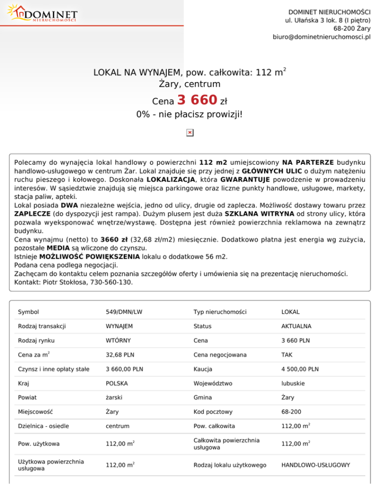 DOMINET NIERUCHOMOŚCI ul. Ułańska 3 lok. 8 (I piętro) 68-200 Żary [email protected] LOKAL NA WYNAJEM, pow. całkowita: 112 m2 Żary, centrum Cena 3 660 zł 0% - nie płacisz prowizji! Polecamy do wynajęcia lokal handlowy o powierzchni 112 m2 umiejscowiony NA PARTERZE budynku handlowo-usługowego w centrum Żar. Lokal znajduje się przy jednej z GŁÓWNYCH ULIC o dużym natężeniu ruchu pieszego i kołowego. Doskonała LOKALIZACJA, która GWARANTUJE powodzenie w prowadzeniu interesów. W sąsiedztwie znajdują się miejsca parkingowe oraz liczne punkty handlowe, usługowe, markety, stacja paliw, apteki. Lokal posiada DWA niezależne wejścia, jedno od ulicy, drugie od zaplecza. Możliwość dostawy towaru przez ZAPLECZE (do dyspozycji jest rampa). Dużym plusem jest duża SZKLANA WITRYNA od strony ulicy, która pozwala wyeksponować wnętrze/wystawę. Dostępna jest również powierzchnia reklamowa na zewnątrz budynku. Cena wynajmu (netto) to 3660 zł (32,68 zł/m2) miesięcznie. Dodatkowo płatna jest energia wg zużycia, pozostałe MEDIA są wliczone do czynszu. Istnieje MOŻLIWOŚĆ POWIĘKSZENIA lokalu o dodatkowe 56 m2. Podana cena podlega negocjacji. Zachęcam do kontaktu celem poznania szczegółów oferty i umówienia się na prezentację nieruchomości. Kontakt: Piotr Stokłosa, 730-560-130. Symbol 549/DMN/LW Typ nieruchomości LOKAL Rodzaj transakcji WYNAJEM Status AKTUALNA Rodzaj rynku WTÓRNY Cena 3 660 PLN Cena za m2 32,68 PLN Cena negocjowana TAK Czynsz i inne opłaty stałe 3 660,00 PLN Kaucja 4 500,00 PLN Kraj POLSKA Województwo lubuskie Powiat żarski Gmina Żary Miejscowość Żary Kod pocztowy 68-200 Dzielnica - osiedle centrum Pow. całkowita 112,00 m2 Pow. użytkowa 112,00 m2 Całkowita powierzchnia usługowa 112,00 m2 Użytkowa powierzchnia usługowa 112,00 m2 Rodzaj lokalu użytkowego HANDLOWO-USŁUGOWY DOMINET NIERUCHOMOŚCI ul. Ułańska 3 lok. 8 (I piętro) 68-200 Żary [email protected] Typ lokalu/umiejscowienie LOKAL W ZABUDOWIE Standard BARDZO DOBRY Ilość poziomów 1 Ogrzewanie C.O. Z SIECI LOKALNEJ Instalacje w lokalu elektryczna, wodnokanalizacyjna, telefoniczna Forma własności PEŁNA WŁASNOŚĆ Rodzaj podłogi GRES Nr Licencji 18001 Piotr Stokłosa 730 560 130 [email protected] Więcej ofert na stronie www.dominetnieruchomosci.pl