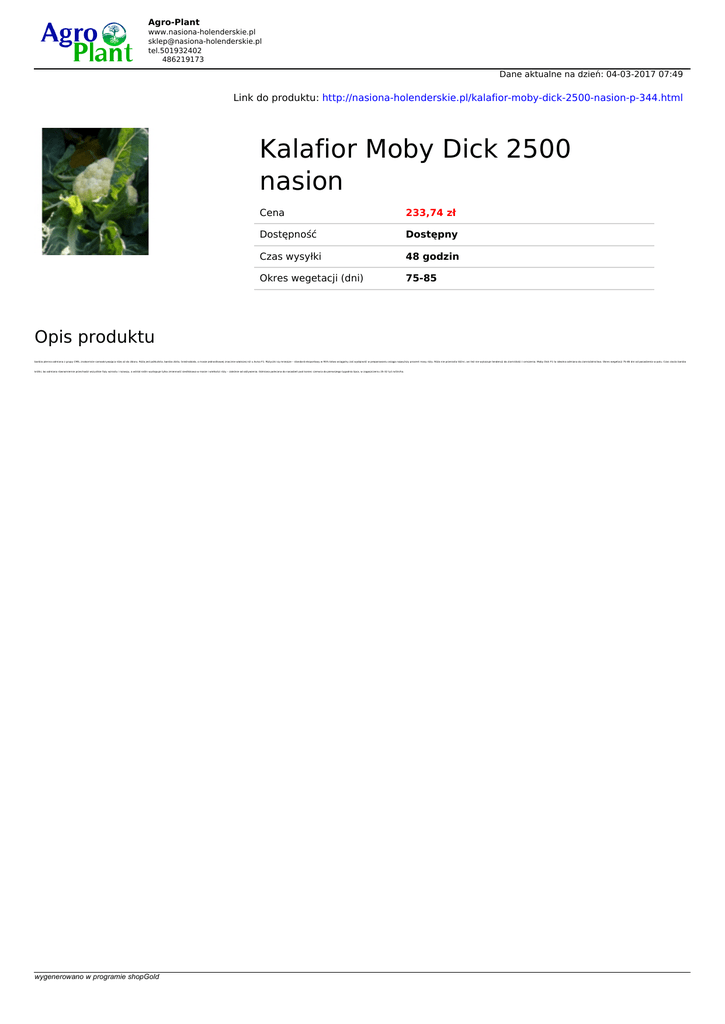 Agro-Plant www.nasiona-holenderskie.pl [email protected] tel.501932402 486219173 Dane aktualne na dzień: 04-03-2017 07:49 Link do produktu: http://nasiona-holenderskie.pl/kalafior-moby-dick-2500-nasion-p-344.html Kalafior Moby Dick 2500 nasion Cena 233,74 zł Dostępność Dostępny Czas wysyłki 48 godzin Okres wegetacji (dni) 75-85 Opis produktu bardzo plenna odmiana z grupy CMS, znakomicie samookrywająca różę aż do zbioru. Róża jest półkulista, bardzo zbita, śnieżnobiała, o masie jednostkowej znacznie większej niż u Aviso F1. Różyczki są mniejsze – standard eksportowy w 95% łatwo osiągalny zaś wydajność w preparowaniu osiąga najwyższy procent masy róży. Róża nie przerasta liśćmi, ani też nie wykazuje tendencji do ziarnistości i omszenia. Moby Dick F1 to idealna odmiana do zamrażalnictwa. Okres wegetacji 75-85 dni od posadzenia w polu. Czas cięcia bardzo krótki, bo odmiana równomiernie przechodzi wszystkie fazy wzrostu i rozwoju, a wśród roślin występuje tylko zmienność siedliskowa w masie i wielkości róży – zależnie od odżywienia. Odmiana polecana do nasadzeń pod koniec czerwca do pierwszego tygodnia lipca, w zagęszczeniu 25-32 tyś roślin/ha. wygenerowano w programie shopGold Powered by TCPDF (www.tcpdf.org)