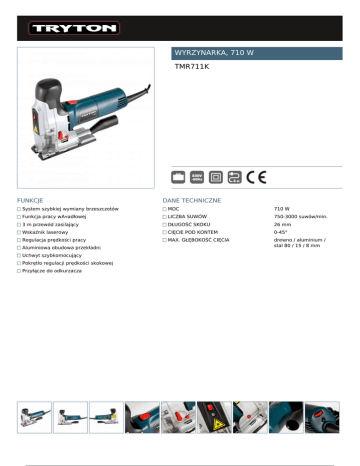 Powered by TCPDF (www.tcpdf.org) WYRZYNARKA, 710 W TMR711K FUNKCJE DANE TECHNICZNE System szybkiej wymiany brzeszczotów MOC 710 W Funkcja pracy wАчadłowej LICZBA SUWÓW 750-3000 suwów/min. 3 m przewód zasilający DŁUGOŚĆ SKOKU 26 mm Wskaźnik laserowy CIĘCIE POD KONTEM 0-45° Regulacja prędkości pracy MAX. GŁĘBOKOŚĆ CIĘCIA drewno / aluminium / stal 80 / 15 / 8 mm Aluminiowa obudowa przekładni Uchwyt szybkomocujący Pokrętło regulacji prędkości skokowej Przyłącze do odkurzacza