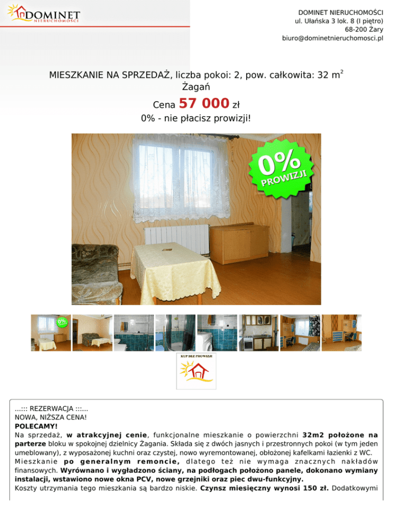 DOMINET NIERUCHOMOŚCI ul. Ułańska 3 lok. 8 (I piętro) 68-200 Żary [email protected] MIESZKANIE NA SPRZEDAŻ, liczba pokoi: 2, pow. całkowita: 32 m2 Żagań Cena 57 000 zł 0% - nie płacisz prowizji! ...::: REZERWACJA :::... NOWA, NIŻSZA CENA! POLECAMY! Na sprzedaż, w atrakcyjnej cenie, funkcjonalne mieszkanie o powierzchni 32m2 położone na parterze bloku w spokojnej dzielnicy Żagania. Składa się z dwóch jasnych i przestronnych pokoi (w tym jeden umeblowany), z wyposażonej kuchni oraz czystej, nowo wyremontowanej, obłożonej kafelkami łazienki z WC. Mieszkanie po generalnym remoncie, dlatego też nie wymaga znacznych nakładów finansowych. Wyrównano i wygładzono ściany, na podłogach położono panele, dokonano wymiany instalacji, wstawiono nowe okna PCV, nowe grzejniki oraz piec dwu-funkcyjny. Koszty utrzymania tego mieszkania są bardzo niskie. Czynsz miesięczny wynosi 150 zł. Dodatkowymi DOMINET NIERUCHOMOŚCI ul. Ułańska 3 lok. 8 (I piętro) 68-200 Żary [email protected] opłatami są opłaty za gaz i prąd. Blok posiada czystą i zadbaną klatkę schodową. Co roku wykonywane są w nim remonty. Przy budynku znajdują się miejsca parkingowe i plac zabaw dla dzieci. Jest to spokojna i cicha okolica znajdująca się blisko lasu. W pobliżu jest szkoła podstawowa, sklepy spożywcze, kościół oraz przystanek autobusowy. Podana cena podlega negocjacji! Serdecznie zapraszam na prezentację. Kontakt: Piotr Stokłosa, 730-560-130. Symbol 596/DMN/MS Typ nieruchomości MIESZKANIE Rodzaj transakcji SPRZEDAŻ Status AKTUALNA Rodzaj rynku WTÓRNY Cena 57 000 PLN Cena za m2 1 781,25 PLN Cena negocjowana TAK Kraj POLSKA Województwo LUBUSKIE Powiat żagański Gmina Żagań Miejscowość Żagań Pow. całkowita 32,00 m2 Pow. użytkowa 32,00 m2 Rodzaj mieszkania 2-POKOJOWE Rodzaj budynku BLOK Typ kuchni Z OKNEM Wyposażenie kuchni CZĘŚCIOWE Liczba łazienek 1 Liczba WC 1 Liczba pokoi 2 Parter parter Liczba pięter 2 Ilość poziomów 1 Umeblowanie CZĘŚCIOWE Źródło c.w. GAZOWY 2-OBIEGOWY Ogrzewanie C.O. GAZOWE Instalacje w domu elektryczna, wodna, kanalizacyjna, Forma własności ODRĘBNA WŁASNOŚĆ Rodzaj okien PLASTIKOWE Rodzaj podłogi PANELE Nr Licencji 18001 Piotr Stokłosa 730 560 130 [email protected] Więcej ofert na stronie www.dominetnieruchomosci.pl