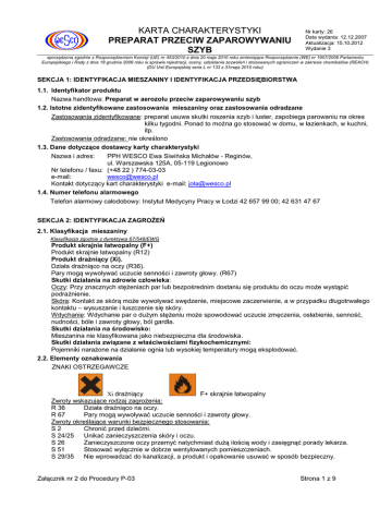KARTA CHARAKTERYSTYKI PREPARAT PRZECIW ZAPAROWYWANIU SZYB Nr karty: 26 Data wydania: 12.12.2007 Aktualizacja: 15.10.2012 Wydanie 3 sporządzona zgodnie z Rozporządzeniem Komisji (UE) nr 453/2010 z dnia 20 maja 2010 roku zmieniające Rozporządzenie (WE) nr 1907/2006 Parlamentu Europejskiego i Rady z dnia 18 grudnia 2006 roku w sprawie rejestracji, oceny, udzielania zezwoleń i stosowanych ograniczeń w zakresie chemikaliów (REACH) (DU Unii Europejskiej seria L nr 133 z 31maja 2010 roku) SEKCJA 1: IDENTYFIKACJA MIESZANINY I IDENTYFIKACJA PRZEDSIĘBIORSTWA 1.1. Identyfikator produktu Nazwa handlowa: Preparat w aerozolu przeciw zaparowywaniu szyb 1.2. Istotne zidentyfikowane zastosowania mieszaniny oraz zastosowania odradzane Zastosowania zidentyfikowane: preparat usuwa skutki roszenia szyb i luster, zapobiega parowaniu na okres kilku tygodni. Ponad to można go stosować w domu, w łazienkach, w kuchni, itp. Zastosowania odradzane: nie określono 1.3. Dane dotyczące dostawcy karty charakterystyki Nazwa i adres: PPH WESCO Ewa Siwińska Michałów - Reginów, ul. Warszawska 125A, 05-119 Legionowo Nr telefonu / faxu: (+48 22 ) 774-03-03 e-mail: [email protected] Kontakt dotyczący kart charakterystyki e-mail: [email protected] 1.4. Numer telefonu alarmowego Telefon alarmowy całodobowy: Instytut Medycyny Pracy w Łodzi 42 657 99 00; 42 631 47 67 SEKCJA 2: IDENTYFIKACJA ZAGROŻEŃ 2.1. Klasyfikacja mieszaniny Klasyfikacja zgodnie z dyrektywą 67/548/EWG Produkt skrajnie łatwopalny (F+) Produkt skrajnie łatwopalny (R12) Produkt drażniący (Xi). Działa drażniąco na oczy (R36). Pary mogą wywoływać uczucie senności i zawroty głowy. (R67) Skutki działania na zdrowie człowieka: Oczy: Przy znacznych stężeniach par lub bezpośrednim dostaniu się produktu do oczu może wystąpić podrażnienie. Skóra: Kontakt ze skórą może wywoływać swędzenie, miejscowe zaczerwienie, a w przypadku długotrwałego kontaktu – wysuszanie i łuszczenie się skóry. Wdychanie: Wdychanie par o dużym stężeniu może spowodować uczucie zmęczenia, osłabienie, senność, nudności, bóle i zawroty głowy, ból gardła. Skutki działania na środowisko: Mieszanina nie klasyfikowana jako niebezpieczna dla środowiska. Skutki działania związane z właściwościami fizykochemicznymi: Pojemniki narażone na działanie ognia lub wysokiej temperatury mogą eksplodować. 2.2. Elementy oznakowania ZNAKI OSTRZEGAWCZE Xi drażniący F+ skrajnie łatwopalny Zwroty wskazujące rodzaj zagrożenia: R 36 Działa drażniąco na oczy. R 67 Pary mogą wywoływać uczucie senności i zawroty głowy. Zwroty określające warunki bezpiecznego stosowania: S2 Chronić przed dziećmi. S 24/25 Unikać zanieczyszczenia skóry i oczu. S 26 Zanieczyszczone oczy przemyć natychmiast dużą ilością wody i zasięgnąć porady lekarza. S 51 Stosować wyłącznie w dobrze wentylowanych pomieszczeniach. S 29/35 Nie wprowadzać do kanalizacji, a produkt i opakowanie usuwać w sposób bezpieczny. Załącznik nr 2 do Procedury P-03 Strona 1 z 9 KARTA CHARAKTERYSTYKI PREPARAT PRZECIW ZAPAROWYWANIU SZYB Nr karty: 26 Data wydania: 12.12.2007 Aktualizacja: 15.10.2012 Wydanie 3 sporządzona zgodnie z Rozporządzeniem Komisji (UE) nr 453/2010 z dnia 20 maja 2010 roku zmieniające Rozporządzenie (WE) nr 1907/2006 Parlamentu Europejskiego i Rady z dnia 18 grudnia 2006 roku w sprawie rejestracji, oceny, udzielania zezwoleń i stosowanych ograniczeń w zakresie chemikaliów (REACH) (DU Unii Europejskiej seria L nr 133 z 31maja 2010 roku) UWAGA!!! Na pojemniku należy umieścić napisy: Pojemnik pod ciśnieniem: chronić przed słońcem i nagrzaniem powyżej temperatury 50C. Nie przekłuwać ani nie spalać, także po zużyciu. Nie przechowywać w pobliżu źródeł zapłonu – nie palić tytoniu. Nie rozpylać nad otwartym płomieniem lub żarzącym się materiałem. Chronić przed dziećmi. 2.3. Inne zagrożenia Mieszanina nie spełnia kryteriów klasyfikacji dot. substancji trwałych, wykazujących zdolność do bioakumulacji i toksycznych (PBT) lub bardzo trwałych i wykazujących bardzo dużą zdolność do bioakumulacji (vPvB). SEKCJA 3: SKŁAD/INFORMACJA O SKŁADNIKACH 3.2. Mieszaniny Skład mieszaniny Nazwa substancji uł. masowy w % wag. nr indeksowy nr WE nr CAS Klasyfikacja zgodna z dyrektywą Rady 67/548/EWG Symbol i znak ostrzegawczy Zwroty R Klasyfikacja zgodna z rozporządzeniem (WE) nr 1272/2008 Klasy zagrożenia i kody kategorii Kody zwrotów wskazujących rodzaj zagrożenia Flam. Liq. 2 Eye Irrit. 2 STOT SE 3 H225 H319 H336 F Izopropanol nr rejestracyjny 01-2119457558- 60-75 603-117-00-0 200-661-7 11 36 67-63-0 67 25-0002 Xi Butan Nr rejestracyjny 01-211947469132-XXXX Izobutan Nr rejestracyjny 01-211948539527-XXXX Propan Nr rejestracyjny 01-211948694421-XXXX 15-20 <1,5 5-10 601-004-00-0 203-448-7 F+ 106-97-8 200-857-2 75-28-5 200-827-9 74-98-6 F+ 12 12 601-004-00-0 601-003-00-5 F+ 12 Flam. Gas 1 Press. Gas Flam. Gas 1 Press. Gas Flam. Gas 1 Press. Gas H220 H280 H220 H280 H220 H280 Mieszanina nie zawiera dodatkowych składników, które według obecnej wiedzy producenta są sklasyfikowane i przyczyniają się do klasyfikacji mieszaniny i w związku z tym wymagają ich podania w tej sekcji.Pełne brzmienia zwrotów R i H oraz akronimy symboli, klas zagrożenia i kodów kategorii podano w sekcji 16. Karty Charakterystyki. SEKCJA 4: ŚRODKI PIERWSZEJ POMOCY 4.1. Opis środków pierwszej pomocy W większości przypadków nie jest wymagana natychmiastowa interwencja lekarska. Zatrucie inhalacyjne: Wyprowadzić na świeże powietrze. W przypadku pojawienia się trudności w oddychaniu podać tlen. Poszkodowanemu zapewnić spokój i chronić przed utratą ciepła. Zwrócić się o pomoc lekarską. Jeżeli poszkodowany jest nieprzytomny - należy go przenieść na świeże powietrze i ułożyć w pozycji bocznej ustalonej. Usunąć z jamy ustnej ruchome protezy i inne ciała obce. Podać tlen, a w przypadku zatrzymania oddechu po