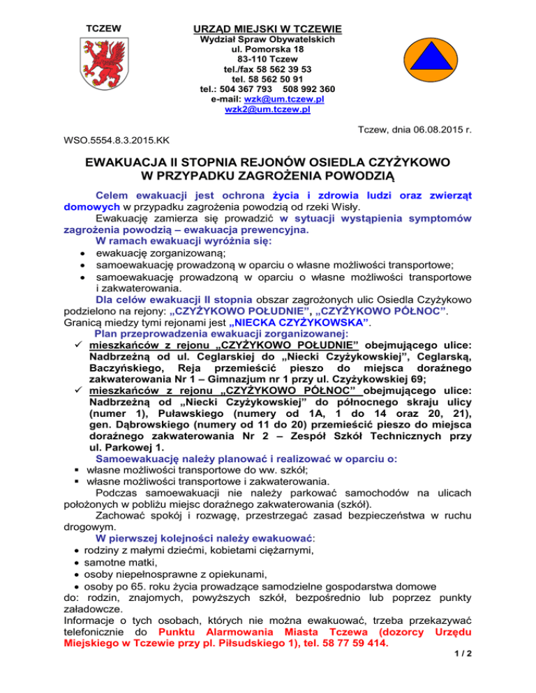 TCZEW URZĄD MIEJSKI W TCZEWIE Wydział Spraw Obywatelskich ul. Pomorska 18 83-110 Tczew tel./fax 58 562 39 53 tel. 58 562 50 91 tel.: 504 367 793 508 992 360 e-mail: [email protected] [email protected] Tczew, dnia 06.08.2015 r. WSO.5554.8.3.2015.KK EWAKUACJA II STOPNIA REJONÓW OSIEDLA CZYŻYKOWO W PRZYPADKU ZAGROŻENIA POWODZIĄ Celem ewakuacji jest ochrona życia i zdrowia ludzi oraz zwierząt domowych w przypadku zagrożenia powodzią od rzeki Wisły. Ewakuację zamierza się prowadzić w sytuacji wystąpienia symptomów zagrożenia powodzią – ewakuacja prewencyjna. W ramach ewakuacji wyróżnia się: ewakuację zorganizowaną; samoewakuację prowadzoną w oparciu o własne możliwości transportowe; samoewakuację prowadzoną w oparciu o własne możliwości transportowe i zakwaterowania. Dla celów ewakuacji II stopnia obszar zagrożonych ulic Osiedla Czyżykowo podzielono na rejony: „CZYŻYKOWO POŁUDNIE”, „CZYŻYKOWO PÓŁNOC”. Granicą miedzy tymi rejonami jest „NIECKA CZYŻYKOWSKA”. Plan przeprowadzenia ewakuacji zorganizowanej: mieszkańców z rejonu „CZYŻYKOWO POŁUDNIE” obejmującego ulice: Nadbrzeżną od ul. Ceglarskiej do „Niecki Czyżykowskiej”, Ceglarską, Baczyńskiego, Reja przemieścić pieszo do miejsca doraźnego zakwaterowania Nr 1 – Gimnazjum nr 1 przy ul. Czyżykowskiej 69; mieszkańców z rejonu „CZYŻYKOWO PÓŁNOC” obejmującego ulice: Nadbrzeżną od „Niecki Czyżykowskiej” do północnego skraju ulicy (numer 1), Puławskiego (numery od 1A, 1 do 14 oraz 20, 21), gen. Dąbrowskiego (numery od 11 do 20) przemieścić pieszo do miejsca doraźnego zakwaterowania Nr 2 – Zespół Szkół Technicznych przy ul. Parkowej 1. Samoewakuację należy planować i realizować w oparciu o: własne możliwości transportowe do ww. szkół; własne możliwości transportowe i zakwaterowania. Podczas samoewakuacji nie należy parkować samochodów na ulicach położonych w pobliżu miejsc doraźnego zakwaterowania (szkół). Zachować spokój i rozwagę, przestrzegać zasad bezpieczeństwa w ruchu drogowym. W pierwszej kolejności należy ewakuować: rodziny z małymi dziećmi, kobietami ciężarnymi, samotne matki, osoby niepełnosprawne z opiekunami, osoby po 65. roku życia prowadzące samodzielne gospodarstwa domowe do: rodzin, znajomych, powyższych szkół, bezpośrednio lub poprzez punkty załadowcze. Informacje o tych osobach, których nie można ewakuować, trzeba przekazywać telefonicznie do Punktu Alarmowania Miasta Tczewa (dozorcy Urzędu Miejskiego w Tczewie przy pl. Piłsudskiego 1), tel. 58 77 59 414. 1/2 Zwierzęta domowe należy ewakuować równolegle z ww. grupami do rodzin i znajomych, zwierzęta nieewakuowane spuścić z uwięzi. Podczas ewakuacji do szkół trzeba zabrać: trwałą żywność na 3 dni, leki, dokumenty tożsamości i inne ważne dokumenty osobiste i majątkowe, pieniądze, najcenniejsze przedmioty dobytku, środki higieny osobistej, bieliznę i ubrania zapasowe, materace i koce lub śpiwory. Ogólna waga bagażu nie powinna przekraczać 50 kg na dorosłą osobę. Opuszczając dom, należy: wyłączyć główne zasilanie elektryczne, odłączyć sieć gazową i wodociągową, zabezpieczyć dom (mieszkanie) przed włamaniem. Powiadamianie o ewakuacji zaplanowane jest w dwóch etapach: 1) powiadamianie o przygotowaniu do ewakuacji oraz powiadamianie o zarządzonej ewakuacji osób, które należy ewakuować w pierwszej kolejności i o zarządzonej ewakuacji zwierząt domowych; 2) powiadamianie o zarządzonej ewakuacji pozostałych mieszkańców. Etap pierwszy realizowany będzie poprzez komunikaty ogłaszane przez samochodowe urządzenia nagłaśniające Straży Miejskiej w Tczewie i Ochotniczej Straży Pożarnej w Tczewie, zamieszczane na stronie internetowej „wrotatczewa” oraz poprzez dystrybucję ulotek przez Straż Miejską. Etap drugi realizowany będzie poprzez: w rejonie zagrożenia „CZYŻYKOWO POŁUDNIE”: komunikaty ogłaszane przez samochodowe urządzenia nagłaśniające Straży Miejskiej i Ochotniczej Straży Pożarnej; w rejonie zagrożenia „CZYŻYKOWO PÓŁNOC”: ogłoszenie alarmu „modulowany dźwięk w okresie trzech minut mechanicznych syren alarmowych” zainstalowanych w budynku mieszkalnym przy ul. Starowiejskiej 5 oraz w budynku Sądu Rejonowego; komunikaty ogłaszane przez samochodowe urządzenia nagłaśniające Straży Miejskiej i Ochotniczej Straży Pożarnej. Wytworzył: Kazimierz Kruk – inspektor ds. wykrywania i alarmowania w WSO UM w Tczewie, tel. 508 992 360 Zaakceptował: Jerzy Laskowski – Zastępca Szefa Miejskiego Zespołu Zarządzania Kryzysowego Tczewa, tel. 504 367 793 2/2