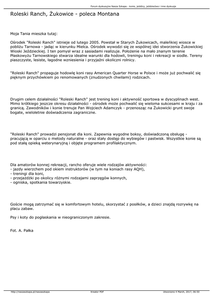 Forum dyskusyjne Nasza Szkapa - konie, jeźdźcy, jeździectwo i inne dyskusje Roleski Ranch, Żukowice - poleca Montana Moja Tania mieszka tutaj: Ośrodek "Roleski Ranch" istnieje od lutego 2005. Powstał w Starych Żukowicach, maleńkiej wiosce w pobliżu Tarnowa - jadąc w kierunku Mielca. Ośrodek wywodzi się ze wspólnej idei stworzenia Żukowickiej Wioski Jeździeckiej. I ten pomysł wraz z sasiadami realizuje. Położenie na mało znanym terenie Płaskowyżu Tarnowskiego stwarza idealne warunki dla hodowli, treningu koni i rekreacji w siodle. Tereny piaszczyste, lesiste, łagodne wzniesienia i przyjaźni okoliczni rolnicy. "Roleski Ranch" propaguje hodowlę koni rasy American Quarter Horse w Polsce i może już pochwalić się pięknym przychówkiem po renomowanych (znudzonych chwilami) rodzicach. Drugim celem działalności "Roleski Ranch" jest trening koni i aktywność sportowa w dyscyplinach west. Mimo krótkiego jeszcze okresu działalności - ośrodek może pochwalić się wieloma sukcesami w kraju i za granicą. Zawodników i konie trenuje Pan Wojciech Adamczyk - przenosząc na Żukowicki grunt swoje bogate, wieloletnie doświadczenia zagraniczne. "Roleski Ranch" prowadzi pensjonat dla koni. Zapewnia wygodne boksy, doświadczoną obsługę pracującą w oparciu o metody naturalne - oraz stały dostęp do wybiegów i pastwisk. Wszystkie konie są pod stałą opieką weterynaryjną i objęte programem profilaktycznym. Dla amatorów konnej rekreacji, rancho oferuje wiele rodzajów aktywności: - jazdy wierzchem pod okiem instruktorów (w tym na koniach rasy AQH), - treningi dla koni, - przejażdżki po okolicy różnymi rodzajami zaprzęgów konnych, - ogniska, spotkania towarzyskie. Goście mogą zatrzymać się w komfortowym hotelu, skorzystać z posiłków, a dzieci znajdą rozrywkę na placu zabaw. Psy i koty do pogłaskania w nieograniczonym zakresie. Fot. A. Pałka http://naszaszkapa.pl/naszaszkapa Kreator PDF Utworzono 4 March, 2017, 06:50