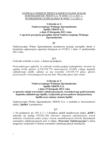 UCHWAŁY PODJĘTE PRZEZ NADZWYCZAJNE WALNE ZGROMADZENIE TRION S.A. W DNIU 15.11.2011 r., PO PRZERWIE UCHWALONEJ W DNIU 7.11.2011 r. Uchwała nr 4 Nadzwyczajnego Walnego Zgromadzenia Spółki TRION S.A. z dnia 15 listopada 2011 roku w sprawie przyjęcia porządku obrad Nadzwyczajnego Walnego Zgromadzenia §1 Nadzwyczajne Walne Zgromadzenie postanawia przyjąć porządek obrad w brzmieniu ogłoszonym raportem bieżącym nr 67/2011 z dnia 11 października 2011 roku. §2 Uchwała wchodzi w życie z dniem jej podjęcia. Przewodnicząca ogłosiła, że uchwała została podjęta jednogłośnie, bowiem na ogólną liczbę głosów tj.126.556.774 stanowiących 42,66% całego kapitału zakładowego spółki, oddano za nią wszystkie 126.556.774 głosy, głosów przeciwnych i wstrzymujących się nie było. Wszystkie głosy były ważne. Uchwała nr 5 Nadzwyczajnego Walnego Zgromadzenia Spółki TRION S.A. z dnia 15 listopada 2011 roku w sprawie emisji warrantów subskrypcyjnych, warunkowego podwyższenia kapitału zakładowego Spółki, wyłączenia prawa poboru akcjonariuszy Spółki oraz zmiany statutu Spółki Nadzwyczajne Walne Zgromadzenie TRION S.A. z siedzibą w Inowrocławiu (dalej „Spółka”) postanawia: §1 1. Na podstawie art. 453 § 2 i 3 Kodeksu spółek handlowych (dalej „KSH”) uchwala się emisję 553.031.382 (słownie: pięciuset pięćdziesięciu trzech milionów trzydziestu jeden tysięcy trzystu osiemdziesięciu dwóch) zbywalnych warrantów subskrypcyjnych serii A (dalej „Warranty Subskrypcyjne”), które mogą być wydawane w formie warrantów subskrypcyjnych imiennych. 1 2. Warranty Subskrypcyjne zostaną wyemitowane w formie dokumentu i mogą być wydawane w jednym lub kilku odcinkach zbiorowych. 3. Warranty Subskrypcyjne zostaną wydane nieodpłatnie. 4. Jeden Warrant Subskrypcyjny uprawniać będzie do objęcia jednej (1) Akcji Serii V (zgodnie z definicją w § 2 ust. 1 poniżej). 5. Prawa do objęcia Akcji Serii V wynikające z Warrantów Subskrypcyjnych będą mogły zostać zrealizowane nie później niż do dnia 31 grudnia 2013 roku. Upoważnia się Zarząd do wydawania Warrantów Subskrypcyjnych uprawniających do objęcia Akcji Serii V w terminie do dnia 31 grudnia 2011 roku. 6. Warranty Subskrypcyjne, z których prawo do objęcia Akcji Serii V nie zostało zrealizowane w terminie określonym w § 1 ust. 5 zd. 1 powyżej wygasają. 7. Warranty Subskrypcyjne wydane w formie warrantów subskrypcyjnych imiennych zostaną zaoferowane do objęcia w drodze oferty prywatnej spółce SLIDELLCO HOLDINGS LIMITED. 8. Nadzwyczajne Walne Zgromadzenie upoważnia Zarząd Spółki do podjęcia wszelkich działań w związku z emisją i przydziałem Warrantów Subskrypcyjnych na rzecz podmiotu wskazanego w § 1 ust. 7 powyżej, w tym do: (a) określenia treści Warrantów Subskrypcyjnych wydawanych w formie dokumentu, w tym szczegółowej treści dokumentu Warrantu Subskrypcyjnego i odcinka zbiorowego Warrantów Subskrypcyjnych; (b) określenia szczegółowych terminów wydawania Warrantów Subskrypcyjnych oraz innych warunków ich emisji, które Zarząd Spółki uzna za stosowne, w granicach określonych niniejszą Uchwałą; (c) podjęcia wszelkich działań związanych z emisją i przydziałem Warrantów Subskrypcyjnych. §2 1. Na podstawie art. 432 w zw. z art. 453 § 1, art. 448 oraz art. 449 KSH uchwala się warunkowe podwyższenie kapitału zakładowego Spółki o kwotę 110.606.276,40 złotych (słownie: stu dziesięciu milionów sześciuset sześciu tysięcy dwustu siedemdziesięciu sześciu złotych i 40/100) poprzez emisję 553.031.382 (słownie: pięciuset pięćdziesięciu trzech milionów trzydziestu jeden tysięcy trzystu osiemdziesięciu dwóch) akcji zwykłych na okaziciela serii V, o wartości nominalnej 0,20 złotych (słownie: dwadzieścia groszy) każda (dalej „Akcje Serii V”). 2 2. Celem warunkowego podwyższenia kapitału jest przyznanie praw do objęcia Akcji Serii V posiadaczom Warrantów Subskrypcyjnych, które zostaną wyemitowane przez Spółkę na podstawie niniejszej Uchwały. Objęcie Akcji Serii V w wyniku wykonania uprawnień wynikających z Warrantów Subskrypcyjnych nastąpi w terminie wskazanym w § 1 ust. 5 zd. 1 powyżej. 3. Akcje Serii V będą wydawane wyłącznie w zamian za wkłady pieniężne posiadaczom Warrantów Subskrypcyjnych, którzy złożą pisemne oświadczenie o objęciu Akcji Serii V zgodnie z art. 451 § 1 KSH i zapłacą cenę emisyjną Akcji Serii V. 4. Cena emisyjna Akcji Serii V wynosi 0,30 złotych (słownie: trzydzieści groszy). 5. Akcje Serii V będą uczestniczyć w dywidendzie na zasadach następujących: (a) Akcje Serii V wydane najpóźniej w dniu dywidendy ustalonym w uchwale Walnego Zgromadzenia w sprawie podziału zysku uczestniczą w zysku począwszy od zysku za poprzedni rok obrotowy, tzn. od dnia 1 stycznia roku obrotowego poprzedzającego bezpośrednio rok, w którym akcje te zostały wydane, (b) Akcje Serii V wydane w dniu przypadającym po dniu dywidendy ustalonym w uchwale Walnego Zgromadzenia w sprawie podziału zysku uczestniczą w zysku począwszy od zysku za rok obrotowy, w którym akcje te zostały wydane, tzn. od dnia 1 stycznia tego roku obrotowego. 6. Upoważnia się Zarząd Spółki do podjęcia wszelkich działań związanych z emisją i przydziałem Akcji Serii V na rzecz posiadaczy Warrantów Subskrypcyjnych, w szczególności upoważnia się Zarząd Spółki, o ile to konieczne, do zawarcia umowy z wybraną instytucją finansową, na podstawie której ta instytucja będzie wykonywać wybrane czynności związane z emisją i rejestracją Akcji Serii V w Krajowym Depozycie Papierów Wartościowych (dalej „KDPW”) oraz ich dopuszczeniem i wprowadzeniem do obrotu na Giełdzie Papierów Wartościowych w Warszawie (dalej „GPW”). 7. Nadzwyczajne Walne Zgromadzenie Spółki postanawia o ubieganiu się o dopuszczenie i wprowadzenie Akcji Serii V do obrotu na rynku regulowanym GPW 