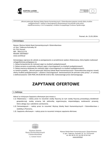 „Wzrost potencjału Wyższej Szkoły Nauka Humanistycznych i Dziennikarstwa poprzez rozwój oferty studiów podyplomowych i szkoleń e-learningowych dostosowanych do potrzeb rynku pracy” współfinansowany z Unii Europejskiej z środków Europejskiego Funduszu Społecznego Poznań, dn. 21.01.2014r. Zamawiający: Nazwa: Wyższa Szkoła Nauk Humanistycznych i Dziennikarstwa ul: Gen. Tadeusza Kutrzeby 10 61-719, Poznań NIP : 7831121773 REGON: 630705827 www.wsnhid.pl Zamawiający zaprasza do udziału w postępowaniu w przedmiocie wyboru Wykonawcy, który będzie realizował usługę/dostawę polegającą na: 1. Zakup komputerów do realizacji zajęć na studiach podyplomowych 2. Zakup serwera na potrzeby realizacji zajęć e-learningowych na studiach podyplomowych 3. Zakup macierzy dyskowej do realizacji zajęć e-learningowych na studiach podyplomowych; w ramach projektu: „Wzrost potencjału Wyższej Szkoły Nauk Humanistycznych i Dziennikarstwa poprzez rozwój oferty studiów podyplomowych i szkoleń e-learningowych dostosowanych do potrzeb rynku pracy”, nr umowy o dofinansowanie: UDA POKL 04.03.00-00-214/12-00, realizowanego przez Zamawiającego. ZAPYTANIE OFERTOWE 1. Definicje: Ilekroć w niniejszym Zapytaniu ofertowym jest mowa o: 1.1) Wykonawcy – należy przez to rozumieć osobę fizyczną (w tym osobę fizyczną prowadzącą działalność gospodarczą), osobę prawną lub jednostkę organizacyjną nieposiadającą osobowości prawnej, która ubiega się o udzielenie zamówienia. 1.2) Zamawiającym – należy przez to rozumieć Wyższą Szkołę Nauk Humanistycznych i Dziennikarstwa z siedzibą w Poznaniu, 1.3) Zapytaniu ofertowym – należy przez to rozumieć niniejsze zapytanie ofertowe. Wyższa Szkoła Nauk Humanistycznych i Dziennikarstwa ul. gen. Tadeusza Kutrzeby 10, 61-719 Poznań tel. 061 66 05 223, fax 061 85 84 362 www.wsnhid.pl „Wzrost potencjału Wyższej Szkoły Nauka Humanistycznych i Dziennikarstwa poprzez rozwój oferty studiów podyplomowych i szkoleń e-learningowych dostosowanych do potrzeb rynku pracy” współfinansowany z Unii Europejskiej z środków Europejskiego Funduszu Społecznego 2. Podstawy prawne prowadzenia postępowania: Postępowanie ma charakter niepubliczny. Postępowanie jest prowadzone na podstawie niniejszego Zapytania ofertowego oraz przepisów ustawy z dnia 23 kwietnia 1964 r. Kodeksu cywilnego (Dz.U. nr 16 poz. 93 z późn. zm.). Podstawą wszczęcia niniejszego postępowania są Wytyczne Ministra Rozwoju Regionalnego w zakresie kwalifikowania wydatków w ramach Programu Operacyjnego Kapitał Ludzki. 3. Informacje o Zamawiającym i projekcie: Zamawiający: Wyższa Szkoła Nauk Humanistycznych i Dziennikarstwa Projekt pt.: "Wzrost potencjału Wyższej Szkoły Nauk Humanistycznych i Dziennikarstwa poprzez rozwój oferty studiów podyplomowych i szkoleń e-learningowych dostosowanych do potrzeb rynku pracy”, realizowany jest w ramach Programu Operacyjnego Kapitał Ludzki (PO KL), Priorytet IV szkolnictwo wyższe i nauka, Działanie 4.3. Wzmocnienie potencjału dydaktycznego uczelni w obszarach kluczowych w kontekście celów Strategii Europa 2020, Poddziałanie, Nr umowy o dofinansowanie UDA POKL 04.03.00-00-214/12-00. PO KL jest jednym z programów służących realizacji Narodowych Strategicznych Ram Odniesienia 2007-2013 i obejmuje całość interwencji Europejskiego Funduszu Społecznego (EFS) w Polsce. Program stanowi potwierdzenie głównych kierunków rozwoju i prowadzenia polityki prozatrudnieniowej rządu oraz umożliwia wykorzystanie środków EFS w Polsce. Jako cel ogólny projektu określono Rozwój do 31.XII.2015r. potencjału dydaktycznego WSNHiD poprzez wdrożenie programu rozwojowego obejmującego przygotowanie i realizację 4 nowych kierunków studiów podyplomowych i 4 nowych szkoleń e-learningowych w zakresie obszaru techniczno – informatycznego. Realizacja projektu zaplanowana została na okres od 01.01.2014r. do 31.12.2015r. 4. Opis przedmiotu zamówienia: Przedmiotem zamówienia są: 1. Zakup komputerów do realizacji zajęć na studiach podyplomowych, 2. Zakup serwera na potrzeby realizacji zajęć e-learningowych na studiach podyplomowych, 3. Zakup macierzy dyskowej do realizacji zajęć e-learningowych na studiach podyplomowych, zgodne z przedstawionym poniżej zakresem: Wyższa Szkoła Nauk Humanistycznych i Dziennikarstwa ul. gen. Tadeusza Kutrzeby 10, 61-719 Poznań tel. 061 66 05 223, fax 061 85 84 362 www.wsnhid.pl „Wzrost potencjału Wyższej Szkoły Nauka Humanistycznych i Dziennikarstwa poprzez rozwój oferty studiów podyplomowych i szkoleń e-learningowych dostosowanych do potrzeb rynku pracy” współfinansowany z Unii Europejskiej z środków Europejskiego Funduszu Społecznego Lp. 1. Nazwa Komputery Ilość 21 Opis Typ: Komputer stacjonarny wraz z monitorem. W ofercie wymagane jest podanie modelu, symbolu oraz nazwy producenta. Zastosowanie: Sprzęt wykorzystywany będzie podczas realizacji procesu dydaktycznego na studiach podyplomowych Wydajność obliczeniowa: Zgodny z Intel i5 lub procesor o równoważnej wydajności. W teście wydajności procesor powinien osiągać w teście PassMark PerformanceTest wynik co najmniej 6290 punktów (wynik zaproponowanego procesora musi znaleźć się na stronie producenta aplikacji testowej: http://www.cpubenchmark.net). Pamięć operacyjna: 4GB RAM w dwóch modułach SODIMM DDR3 1600Mhz z możliwością rozbudowy do 8GB (należy zapewnić wolne gniazda pamięci na płycie głównej komputera) Pamięć masowa: Minimum 1TB SATA, 7200 obrotów z możliwością instalacji dodatkowego dysku twardego (należy zapewnić wolną wewnętrzną zatokę 3,5”) Układ graficzny: Zintegrowany, umożliwiający wyświetlenie obrazu w rozdzielczości co najmniej 1920x1080. Dodatkowo układ graficzny powinien wspierać technologię DirectX 11, Open GL w wersji co najmniej 4.0 Płyta główna: - wsparcie dla PCI Express x16 (dostępne powinno być jedno gniazdo) - 