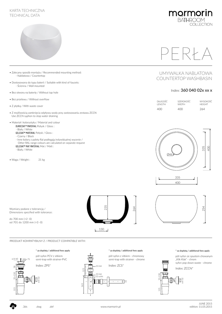 KARTA TECHNICZNA TECHNICAL DATA PERŁA UMYWALKA NABLATOWA COUNTERTOP WASHBASIN • Zalecany sposób montażu / Recommended mounting method: - Nablatowa / Countertop • Dostosowana do typu baterii / Suitable with kind of faucets: - Ścienna / Wall mounted • Bez otworu na baterię / Without tap hole • Bez przelewu / Without overflow Index: • Z płytką / With waste cover 360 040 02x xx x DŁUGOŚĆ LENGTH SZEROKOŚĆ WIDTH WYSOKOŚĆ HEIGHT 400 400 264 • Waga / Weight : 335 • Materiał i kolorystyka / Material and colour Połysk / Gloss : - Biały / White Połysk / Gloss : - Czarny / Black - Inne kolory z palety Ral podlegają indywidualnej wycenie / Other RAL range colours are calculated on separate request Mat / Matt : - Biały / White 400 • Z możliwością zamknięcia odpływu wody przy zastosowaniu zestawu ZCCN Use ZCCN syphon to stop water draining Ø46 21 kg 335 254 Wymiary podane z tolerancją / Dimensions specified with tolerance: do 700 mm (+2 -0) od 701 do 1200 mm (+3 -0) 264 235 400 130 PRODUKT KOMPATYBILNY Z / PRODUCT COMPATIBLE WITH: * za dopłatą / additional fees apply * za dopłatą / additional fees apply pół-syfon PCV z sitkiem semi-trap with strainer-PVC pół-syfon z sitkiem - chromowy semi-trap with strainer - chrome pół-syfon ze spustem chowanym „Klik Klak” - chrom syfon pop down waste - chrome Index: ZCS* Index: ZCCN* 115 115 165 32 32 inlet 32 outlet o/d 32 125 o/d 32 55>150 32 inlet 55>150 Index: ZPS* Adjustable Stalk M6x 75 38 o/d 60 * za dopłatą / additional fees apply .3ds .dwg .dxf www.marmorin.pl JUNE 2015 edition: 11.05.2015