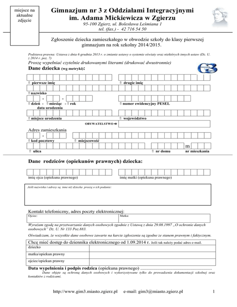 Gimnazjum nr 3 z Oddziałami Integracyjnymi im. Adama Mickiewicza w Zgierzu miejsce na aktualne zdjęcie 95-100 Zgierz, ul. Bolesława Leśmiana 1 tel. (fax.) - 42 716 54 50 Zgłoszenie dziecka zamieszkałego w obwodzie szkoły do klasy pierwszej gimnazjum na rok szkolny 2014/2015. Podstawa prawna: Ustawa z dnia 6 grudnia 2013 r. o zmianie ustawy o systemie oświaty oraz niektórych innych ustaw (Dz. U. z 2014 r. poz. 7) Proszę wypełniać czytelnie drukowanymi literami (drukować dwustronnie) Dane dziecka (wg metryki): ⇑ pierwsze imię ⇑ drugie imię ⇑ nazwisko - - ⇑ dzień - ⇑ miesiąc - ⇑ rok data urodzenia ⇑ numer ewidencyjny PESEL ⇑ miejsce urodzenia ⇑ województwo OBYWATELSTWO Adres zamieszkania ⇑ kod pocztowy ⇑ miejscowość m ⇑ ⇑ ulica nr domu nr mieszkania Dane rodziców (opiekunów prawnych) dziecka: imię ojca (opiekuna prawnego) imię matki (opiekuna prawnego) Jeśli nazwiska i adresy są inne niż dziecka proszę o ich podanie: Kontakt telefoniczny, adres poczty elektronicznej: Ojciec: Matka: Wyrażam zgodę na przetwarzanie danych osobowych zgodnie z Ustawą z dnia 29.08.1997 „O ochronie danych osobowych” Dz. U. Nr 133 Poz.883. Oświadczam, że wszystkie dane osobowe zawarte na karcie zgłoszenia są zgodne ze stanem prawnym i faktycznym. Chcę mieć dostęp do dziennika elektronicznego od 1.09.2014 r. Jeśli tak należy podać adres e-mail. dziecko matka/opiekun prawny ojciec/opiekun prawny Data wypełnienia i podpis rodzica (opiekuna prawnego) ............................................................ Dane objęte są ochroną danych osobowych i wykorzystywane tylko do prowadzenia dokumentacji szkolnej oraz kontaktów z rodzicami. http://www.gim3.miasto.zgierz.pl e-mail: [email protected] 1 Oceny za pierwszy semestr w bieżącym roku szkolnym: przedmiot ocena przedmiot Zachowanie Historia Religia Przyroda Język polski Informatyka Język angielski Plastyka Język niemiecki Muzyka Język ........................ Wychowanie fizyczne ocena Matematyka ................................................... Pieczęć szkoły podstawowej ............................................... Podpis wychowawcy TAK Wybieram klasę ogólnodostępną TAK Wybieram klasę integracyjną Wybieram klasę ze zwiększoną ilością Wybieram klasę z dodatkową ilością godzin języków obcych (angielski TAK godzin z wychowania fizycznego TAK oraz niemiecki). (piłka nożna) Wybieram klasę z dodatkową ilością godzin z matematyki, fizyki, TAK Proszę zaczernić odpowiedni kwadrat. informatyki. Wybór obowiązkowych zajęć lekcyjnych: Zajęcia artystyczne Taniec towarzyski , zajęcia plastyczne , klub melomana , (proszę zaznaczyć jedne fotografia i film w technice cyfrowej , zajęcia) inne …………………………………………………………………… Zajęcia techniczne Zajęcia elektryczno-elektroniczne , zajęcia kulinarne , sztuka (proszę zaznaczyć jedne dekorowania , zajęcia z przepisów o ruchu drogowym , zajęcia) inne …………………………………………………………………… Wychowanie fizyczne Piłka nożna , koszykówka , siatkówka , piłka ręczna , (proszę zaznaczyć jedne pływanie , lekkoatletyka , korfball , petanque , unihokej , zajęcia) tenis stołowy , aerobic , inne ……………………………………………………………………. Jeśli dziecko posiada odpowiednią opinię lub orzeczenie z Poradni Psychologiczno-Pedagogicznej lub inne dokumenty prosimy o dołączenie ich kopii do podania. Karta zgłoszenia powinna być złożona w sekretariacie szkoły w terminie od 3 marca do 31 marca 2014 r., do godz. 13:00. Do podania proszę dołączyć jedno podpisane (aktualne) zdjęcie legitymacyjne. Do 01 lipca 2014 r. prosimy dostarczyć kopię świadectwa ukończenia szkoły podstawowej i zaświadczenia ze sprawdzianu oraz oryginały do wglądu. Wypełnia upoważniony pracownik Gimnazjum nr 3. Załączniki: zdjęcie tak nie, opinia/orzeczenie tak nie, inne ….……………………………….. Data i podpis przyjmującego podanie ................................................................ Nr kolejny: http://www.gim3.miasto.zgierz.pl e-mail: [email protected] 2