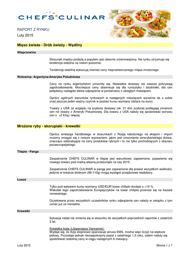 RAPORT Z RYNKU Luty 2015 Mięso świeŜe - Drób świeŜy - Wędliny Wieprzowina Stosunek między podaŜą a popytem jest obecnie zrównowaŜony. Na rynku utrzymuje się tendencja stabilna na niskim poziomie. Tendencję stabilną wykazują równieŜ ceny nieprzetworzonego mięsa mroŜonego. Wołowina: Argentyna/Ameryka Południowa Ceny na rynku argentyńskim umocniły się. Niewielkie dostawy nie zawsze pokrywają zapotrzebowanie. Mocniejsze ceny obserwuje się dla rumsztyku i biodrówki, dla cen polędwicy nastąpiło lekkie odpręŜenie w porównaniu z ubiegłym miesiącem. Oprócz ogólnych warunków rynkowych w następnych miesiącach wyraźnie da o sobie znać jeszcze jeden waŜny czynnik w postaci kursu wymiany (dolara na euro). Towary z USA ze względu na szybsze dostawy (ok. 21 dni) szybciej podlegają zmianom cen niŜ towary z Ameryki Południowej. Dla towaru z USA naleŜy się spodziewać wzrostu cen o +2 €/kg i więcej. MroŜone ryby - skorupiaki - krewetki Oprócz embarga handlowego w stosunkach z Rosją nałoŜonego na eksport i import musimy zmagać się z nowym wyzwaniem, jakim jest umocnienie amerykańskiego dolara, znacząco oddziałujące na ceny produktów rybnych i to nie tylko pochodzących z obszaru pozaeuropejskiego. Tilapia - Panga Zaopatrzenie CHEFS CULINAR w tilapię jest warunkowo zapewnione, pojawienie się nowego towaru pod marką własną przesunięto na luty 2015. Zaopatrzenie CHEFS CULINAR w pangę jest zapewnione dla prawie wszystkich wielkości, jedynie w towarze drobnym (90-110g) mogą wystąpić przejściowe niedobory. Łosoś Tylko pod wpływem kursu wymiany USD/EUR towar chilijski droŜeje o >10 %. Wskutek tego zapotrzebowanie Europejczyków na towar chilijski przenosi się na łososia norweskiego. Oczekiwane przez wszystkich uczestników rynku odpręŜenie cen naleŜy w związku z tym uznać juŜ za nierealne. Krewetki Sytuacja nadal nie zmienia się w stosunku do wszystkich poprzednich raportów z ostatnich 2 lat. Krewetka biała (Litopenaeus Vannamei): Wydaje się, Ŝe Azja stopniowo opanowuje wirusa EMS, moŜna więc liczyć na większe połowy. Pozostaje jednak niezaspokojony popyt z ostatniego 1,5 roku, zatem naleŜy się spodziewać stabilnej ceny w ciągu następnych 6 miesięcy. Luty 2015 Strona 1 z 7 RAPORT Z RYNKU Luty 2015 W dłuŜszej perspektywie uczestnicy rynku liczą na obniŜenie cen tych krewetek, jednak moŜe to nastąpić najwcześniej w lipcu 2015. Krewetka czarna (Penaeus Monodon): Nadal przy wysokich cenach zbytu do Australii, USA i Rosji dostępne ilości towaru zmniejszają się z powodu przestawiania hodowli na krewetki białe, zatem i tutaj nie naleŜy na razie spodziewać się odpręŜenia. Oczywiście krewetki równieŜ naleŜą do produktów kupowanych za dolary amerykańskie, dlatego z dzisiejszego punktu widzenia moŜna oczekiwać zwyŜki cen o > 10 % ze względu na kurs wymiany. Trzeba odczekać aŜ się okaŜe, czy silny dolar zneutralizuje spodziewane obniŜki cen surowca. Karmazyn Sytuacja na rynku karmazyna nie zmieniła się od poprzedniego miesiąca. Ze względu na certyfikację MSC towaru islandzkiego naleŜy się spodziewać większego popytu. Jak informowano w poprzednim raporcie, jednocześnie następuje zmniejszenie kwot połowowych na rok 2015. Dla atlantyckiego Sebastes Mentella kwota została obniŜona o ok. 50%, dla islandzkiego Sebastes Marinus o 15%. Wskutek rosnącego popytu trzeba się liczyć ze wzrostem poziomu cen, nie powinien on jednak być zbyt wysoki. Zaopatrzenie CHEFS CULINAR w towar islandzki jest z dzisiejszego punktu widzenia zapewnione przy wysokim poziomie cen. Zaopatrzenie w towar z Chin pozostaje niepewne. Dolar amerykański ma znaczący wpływ takŜe na produkt pochodzący z Europy. Ze względu na niekorzystny kurs wymiany klienci odwracają się od towaru produkowanego w Chinach. Popyt na europejskiego karmazyna w ciągu ostatnich 3 tygodni gwałtownie wzrósł. Łosoś morski (czarniak) Według najnowszych prognoz w 2015 nie naleŜy się spodziewać prawie śADNYCH połowów łososia morskiego. Po ostatnich nieudanych połowach statki zmieniły cel i zamiast na łososia morskiego polują na dorsza. W związku z tym zaopatrzenie nie jest zapewnione. Do krytycznej sytuacji doszło zwłaszcza w zaopatrzeniu w łososia morskiego interleaved. Brakuje zarówno towaru mroŜonego na morzu, jak i na lądzie. Ceny łososia morskiego, jak oceniano w poprzednim raporcie, mają nadal tendencję wzrostową, naleŜy liczyć się z poziomem cen wyŜszym do 50% od ubiegłorocznego. Zaopatrzenie w towar chiński nie jest zapewnione, zaopatrujemy się w towar islandzki. Dorsz Sytuacja na rynku dorsza pozostaje zasadniczo niezmieniona od poprzedniego miesiąca. Nastąpiły prognozowane podwyŜki o 35%, w krótkim czasie naleŜy liczyć się ze wzrostem o kolejne 15%. Kwota połowowa na rok 2015 została zgodnie z propozycją Międzynarodowej Rady Badań Morza (ICES) zmniejszona o 10%. Obecnie zasoby surowca nie pokrywają zapotrzebowania i dlatego dorsz interleaved, zarówno mroŜony na morzu, jak i na lądzie, jest prawie niedostępny. Luty 2015 Strona 2 z 7 RAPORT Z RYNKU Luty 2015 Trzeba poczekać na połowy statków rybackich, które z łososia norweskiego przestawiły się na dorsza, aby móc ocenić rozwój sytuacji w tym segmencie. Zaopatrzenie w towar z Chin jest warunkowo zapewnione. Zaopatrzenie w płaty dorsza pochodzenia islandzkiego/norweskiego z produkcji europejskiej jest zapewnione, tutaj moŜemy zagwarantować towar na mocy kontraktu. Dolar amerykański ma znaczący wpływ równieŜ na cenę dorsza, poniewaŜ wskutek wzrostu cen pod wpływem kursu dolara zmniejsza się zainteresowanie towarem pacyficznym, co z kolei znacznie zwiększa popyt na dorsza atlantyckiego. Krewetki (Nordseekrabben) Sytuacja na rynku krewetek nie zmieniła się od poprzedniego miesiąca i pozostaje znacznie bardziej odpręŜona niŜ w ubiegłym roku. Zasoby CHEFS CULINAR są zapewnione na prawie niezmienio